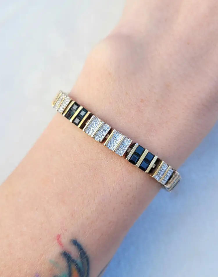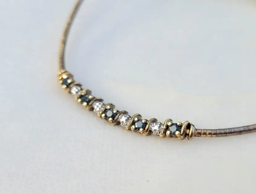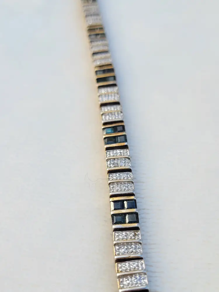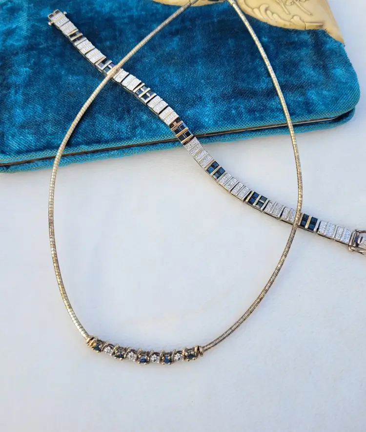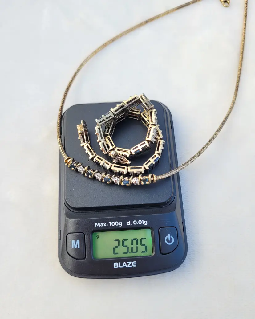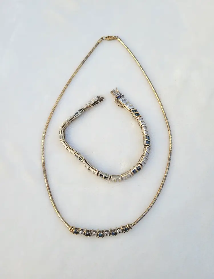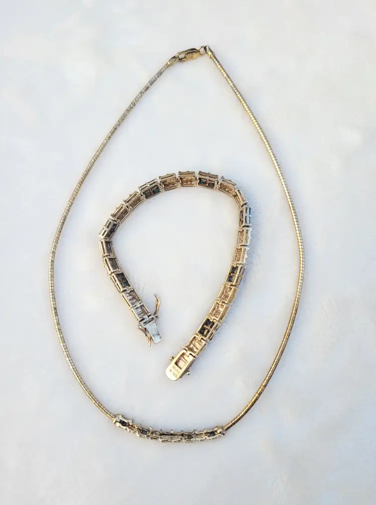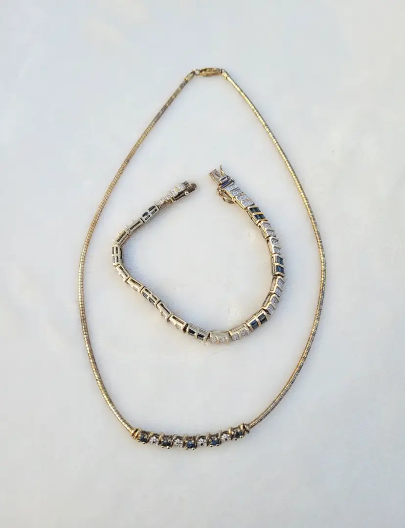 Elegant sterling silver gold vermeil necklace & bracelet set, adorned with genuine deep blue sapphires and sparkling diamonds. The gemstones have been verified via Presidium tester and this is in good condition from an estate, circa 1990s/y2k. The bracelet is 7.5" long, and the necklace is 16". I couldn't quite fit the entire necklace on my scale so the total of 25 grams is actually a bit higher. Please see pictures for details and measurements.