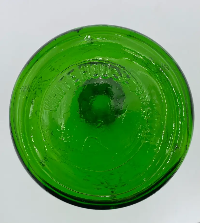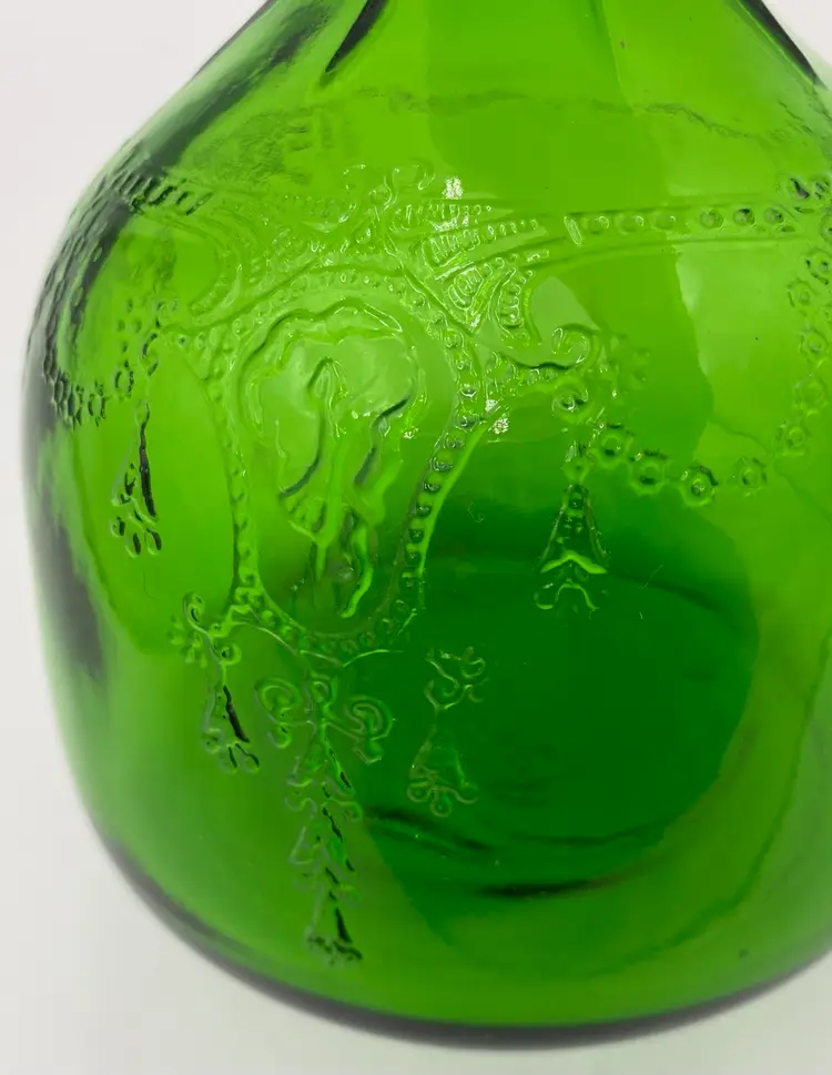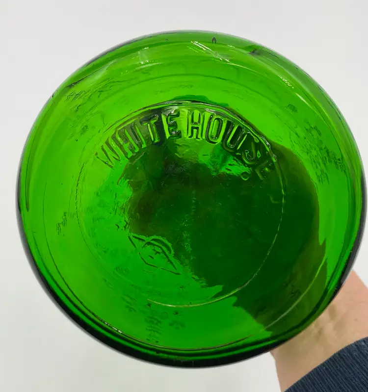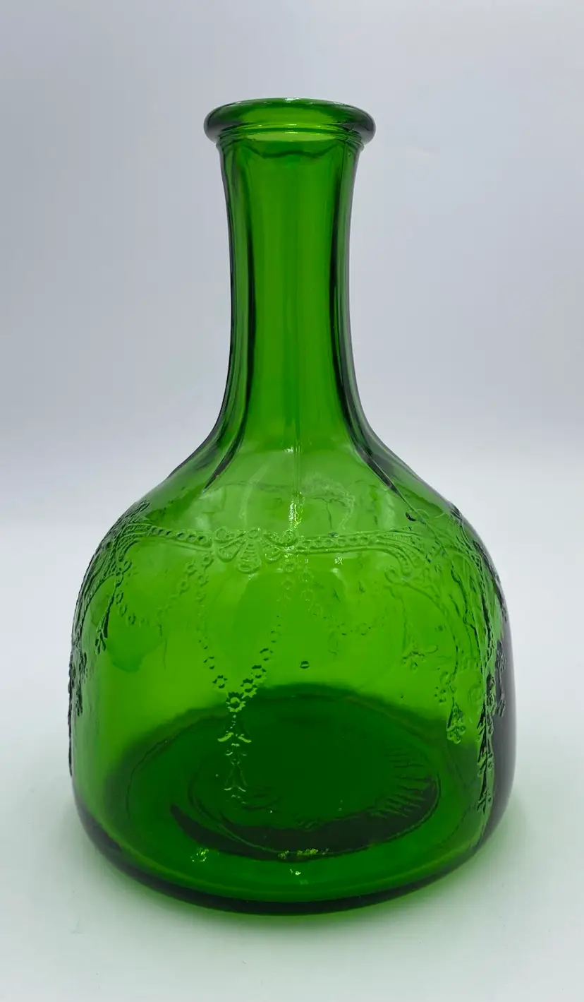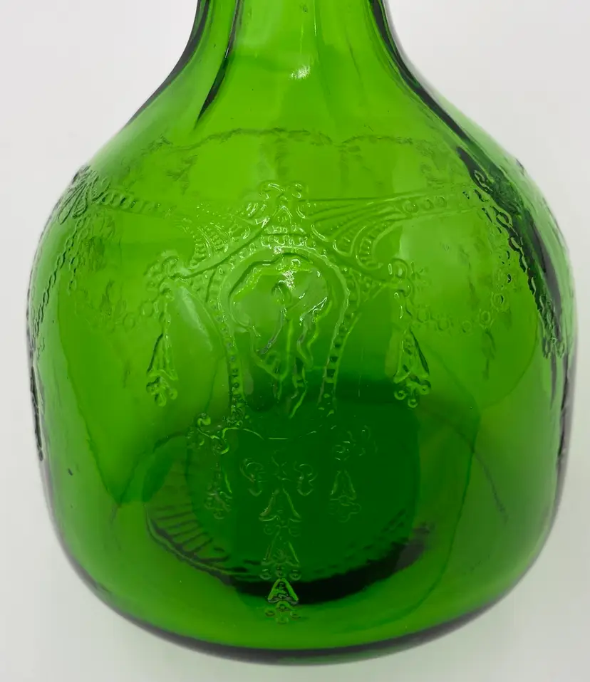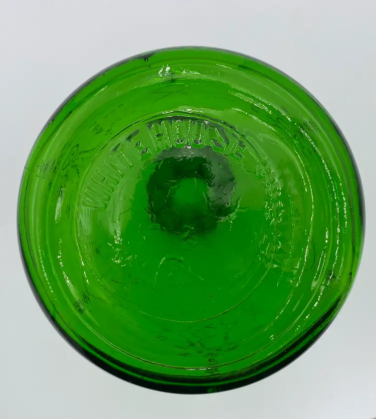 This vintage (near antique!) green glass bottle from 1931 is a beautiful addition to any collection. Made by the Owen-Illinois Glass Company in Bridgeton, New Jersey, it features a garland swag with a ballerina cameo. The Owen-Illinois logo is stamped on the bottom, as is the manufacturing plant Code of 14 (for Bridgeton, New Jersey) and the year code for 1931. The bottles were produced for the National Fruit Company in Washington, DC and Winchester, VA. The bottle was used for their Apple Cider Vinegars, specifically the White House Vinegar, and were designed to be reused/refilled with their vinegar while being enjoyed for the bottle's beauty.