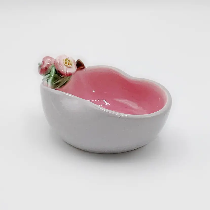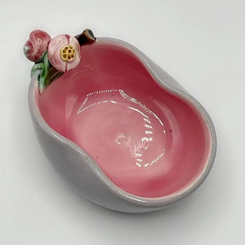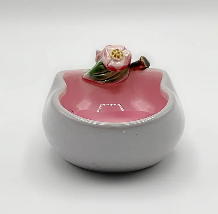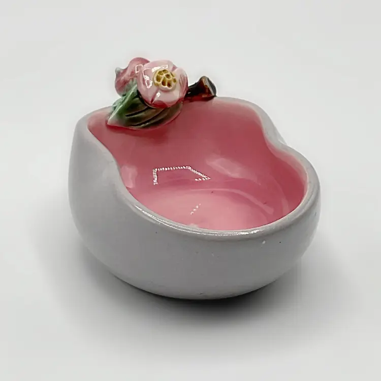 This vintage French pinched pottery glazed dish is a beautiful piece of art that is sure to impress collectors and enthusiasts alike. The colorful floral pattern and high gloss finish make it a perfect decorative item for any home or office. Measuring 5 inches in length, 2.25 inches in height, and 3.5 inches in width, it is a great addition to any trinket collection.
