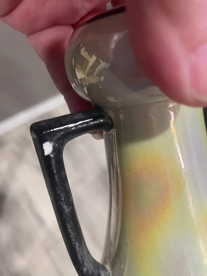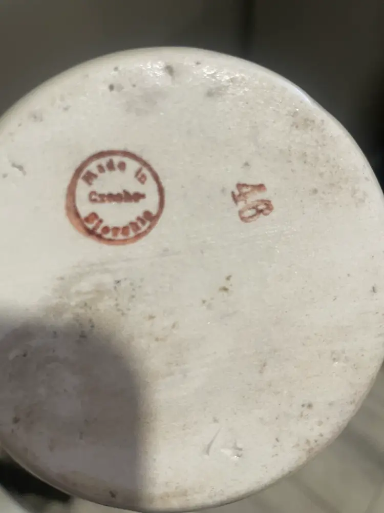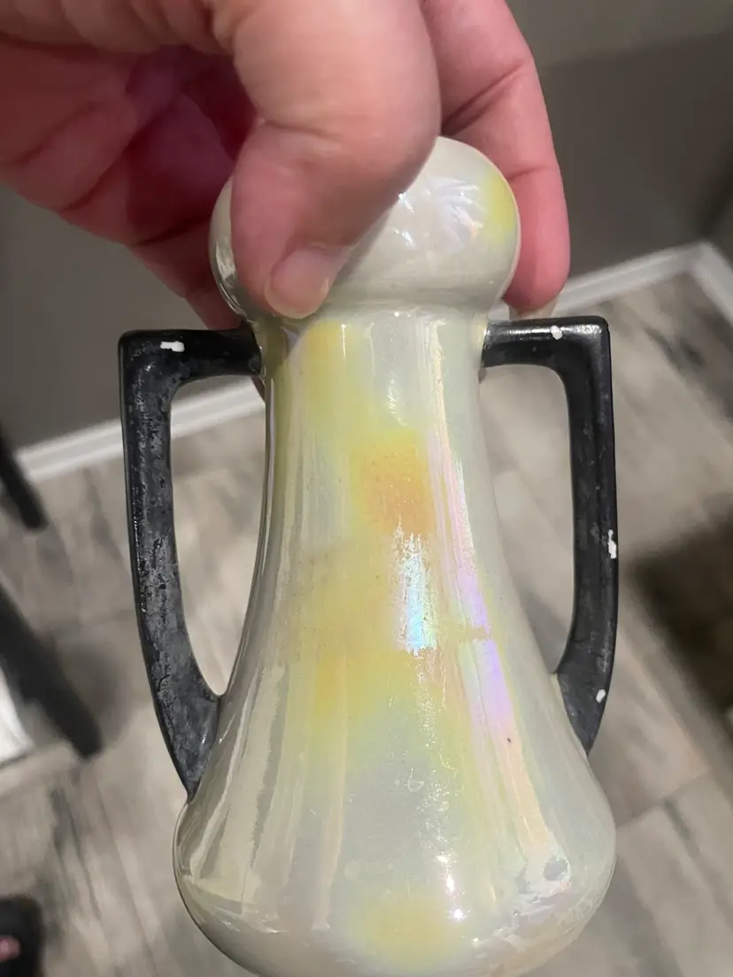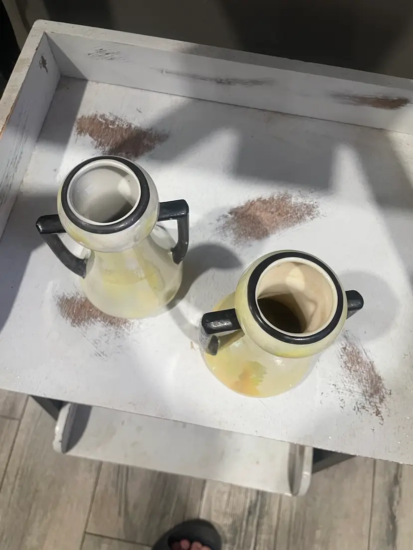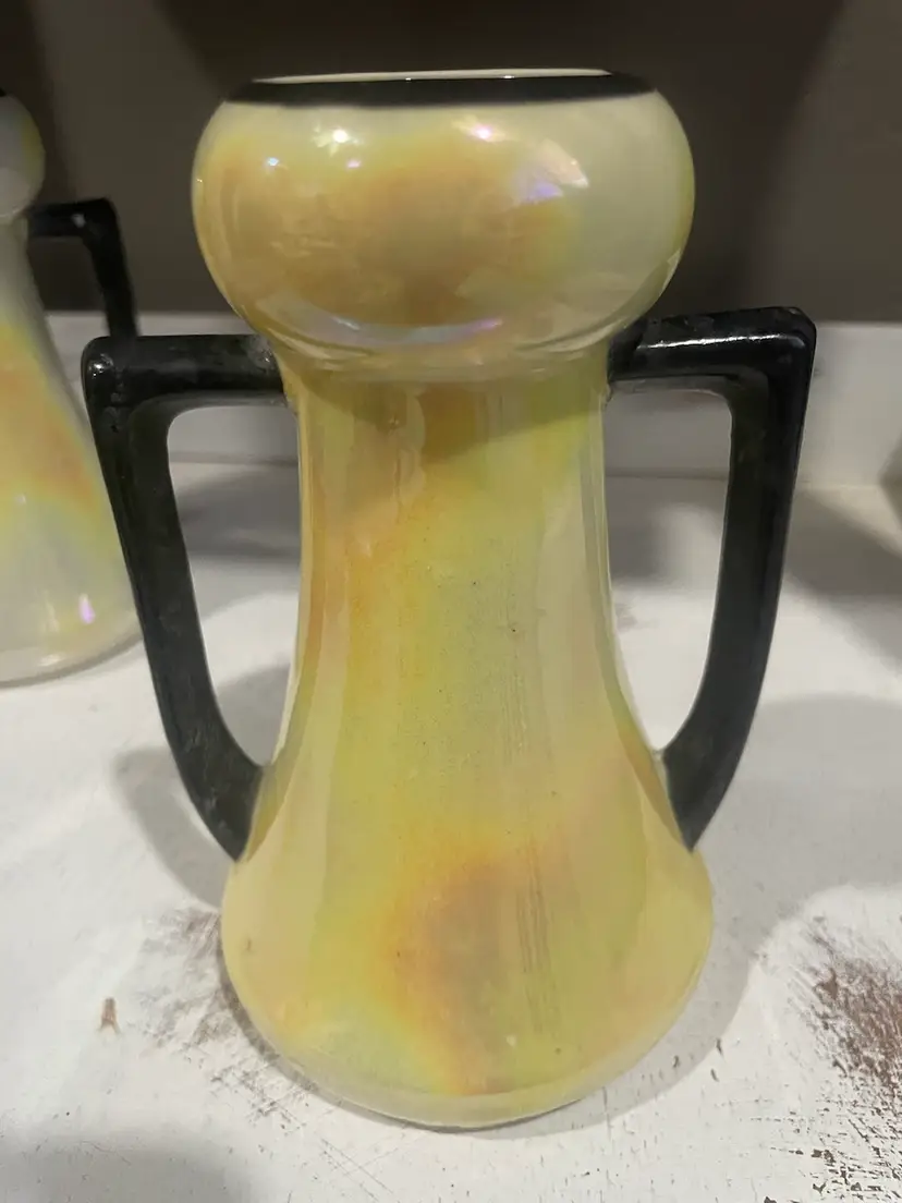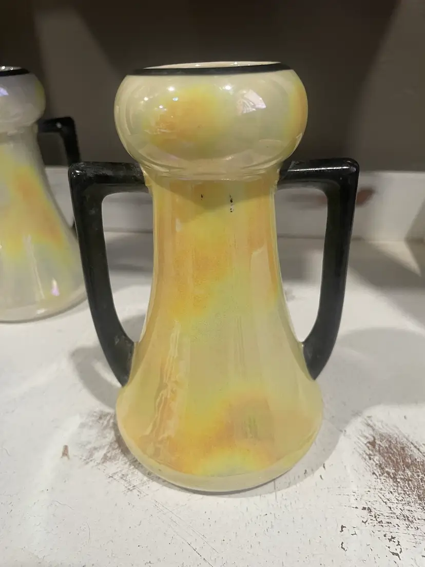This vintage pair of Czech vases is a stunning addition to any collection. The yellow and white lustreware design with black accents adds a touch of Art Deco style to any room. Measuring at 5.5 inches, these small urns are perfect for displaying flowers or as decorative pieces on their own. Made of porcelain ceramic, these vases were produced in Slovakia during the 1940s. Great makeup brush vase. One vase is more white than yellow & has minor paint loss on the black accents. Both have No chips or cracks.