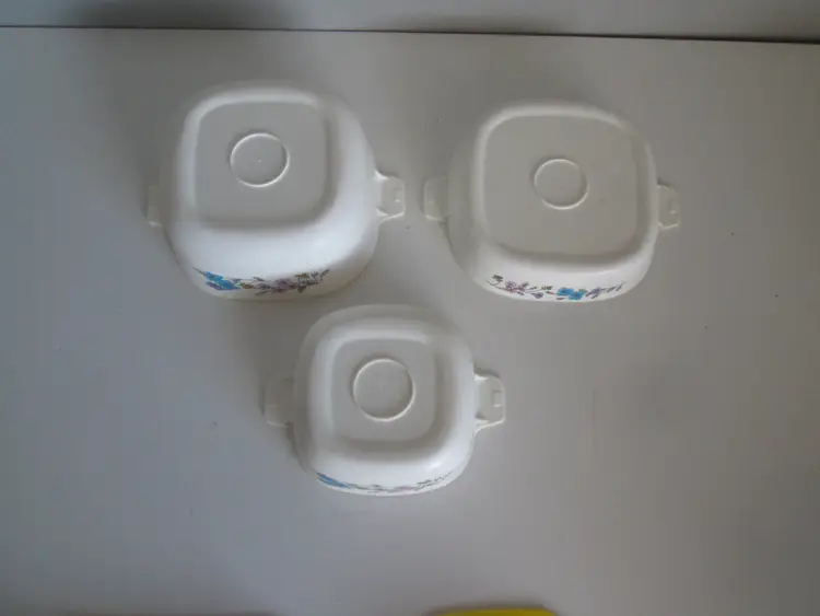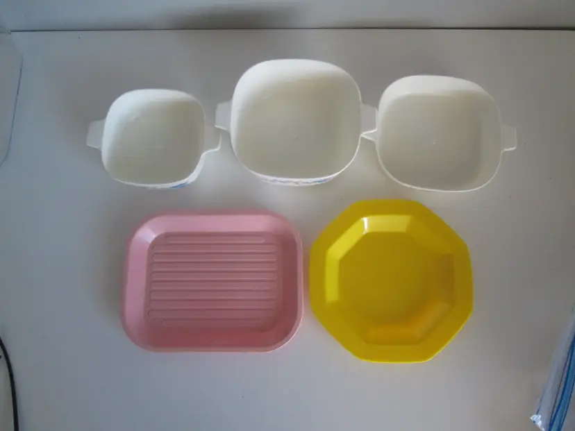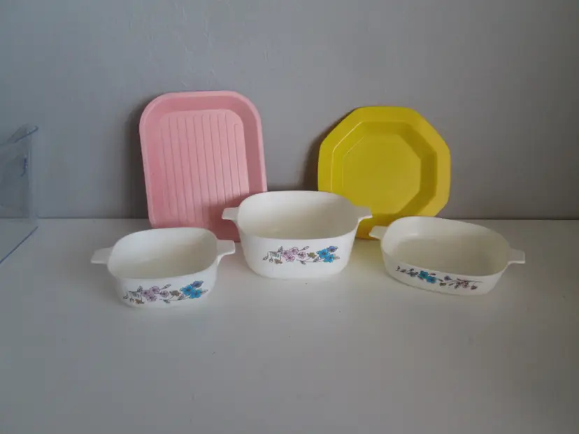 Vintage 1960s Chilton Blue "Corning Ware" Childs Plastic Pretend Play Dish Set. It also comes with a 1987 Fisher Price and Quaker Oats plastic cookie pan or tray. The yellow tray does not have a brand mark. You will get exactly what you see in the photos. In good played with condition.