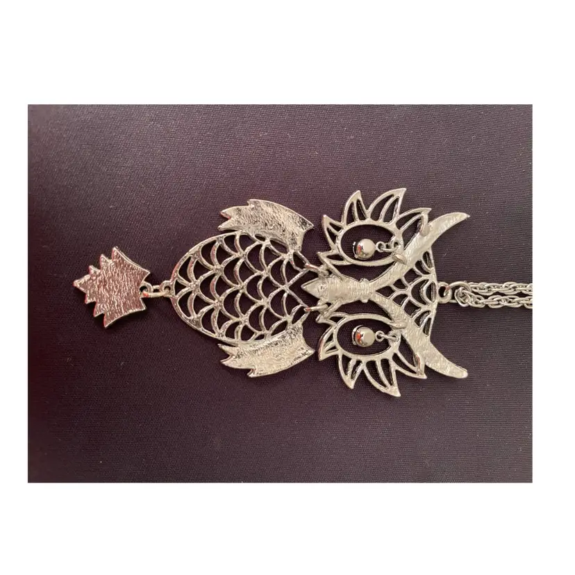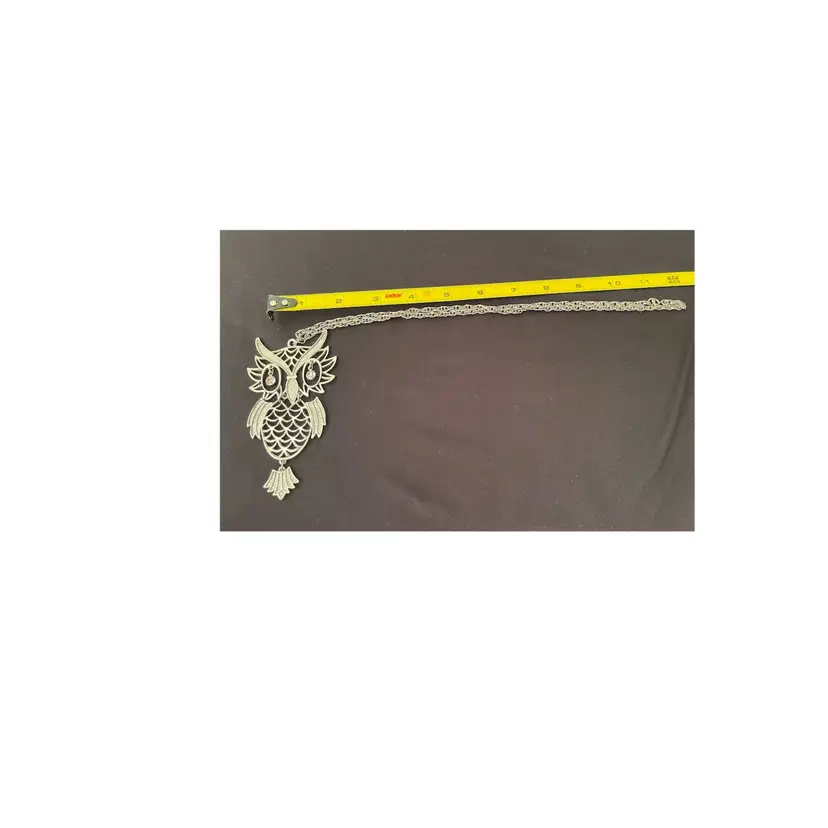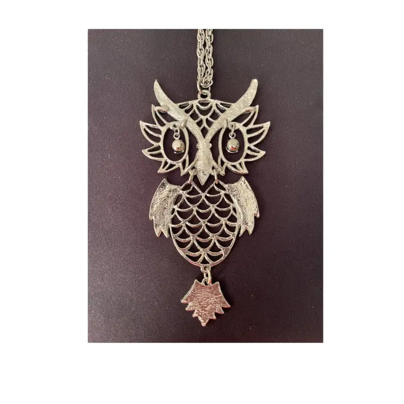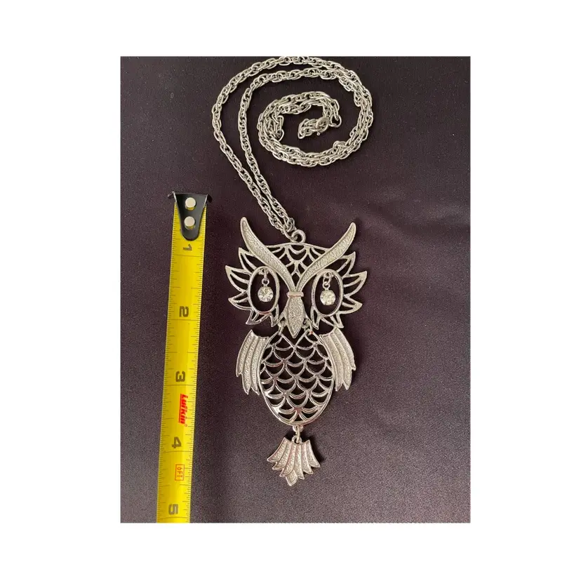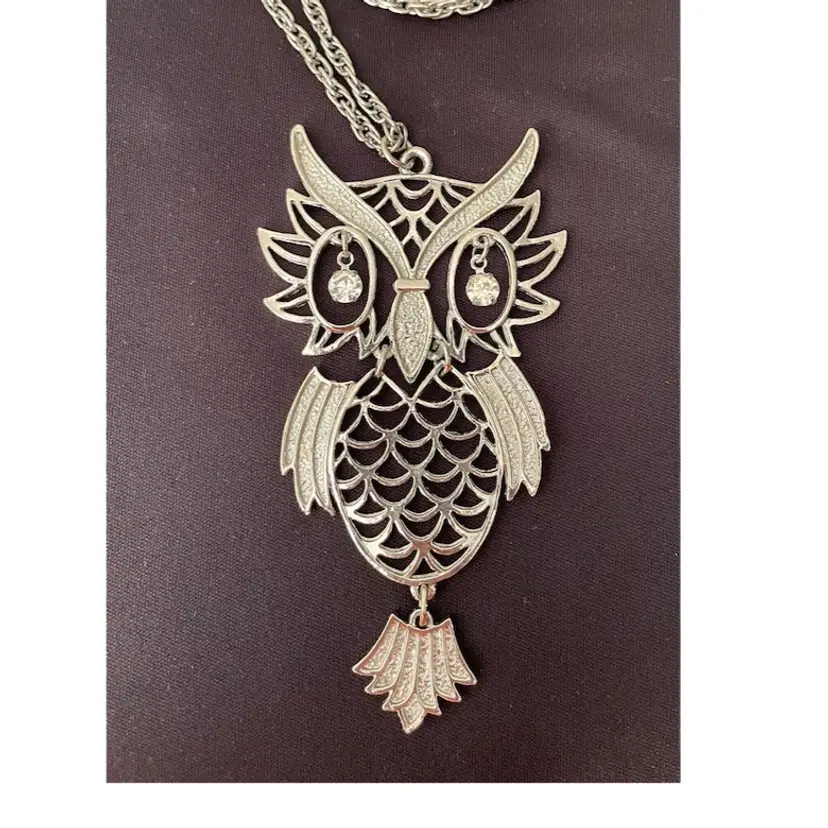 VTG 1960's Silver Tone OWL w/Rhinestone Eye Owl Statement Necklace 24” Chain