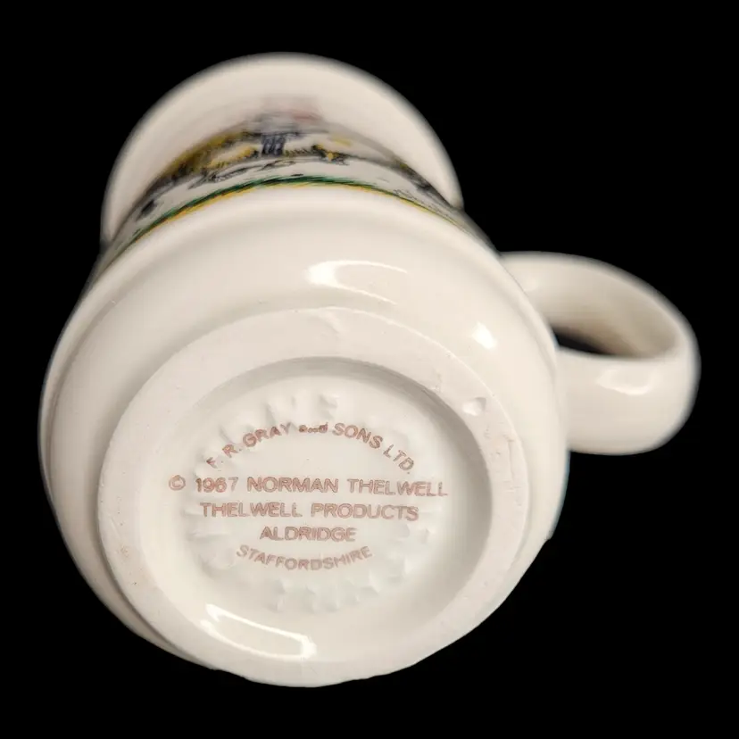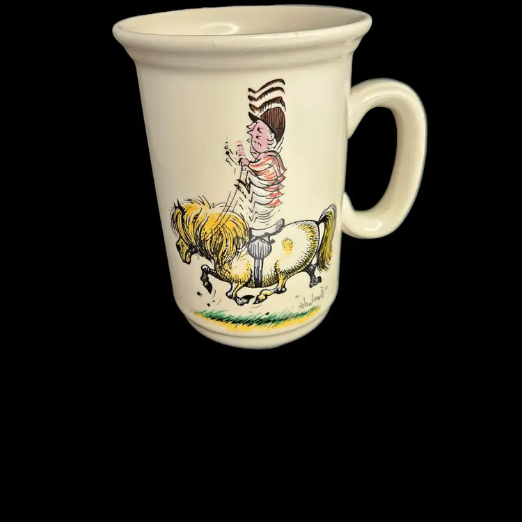 This cup was manufactured in 1967 by R.F. Gray and Sons in Staffordshire UK. The cup was made for Harrods of London and features an illustration by Normal Thelwell