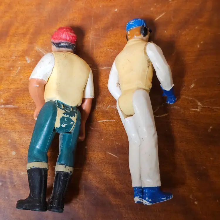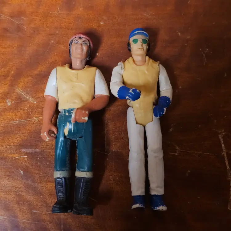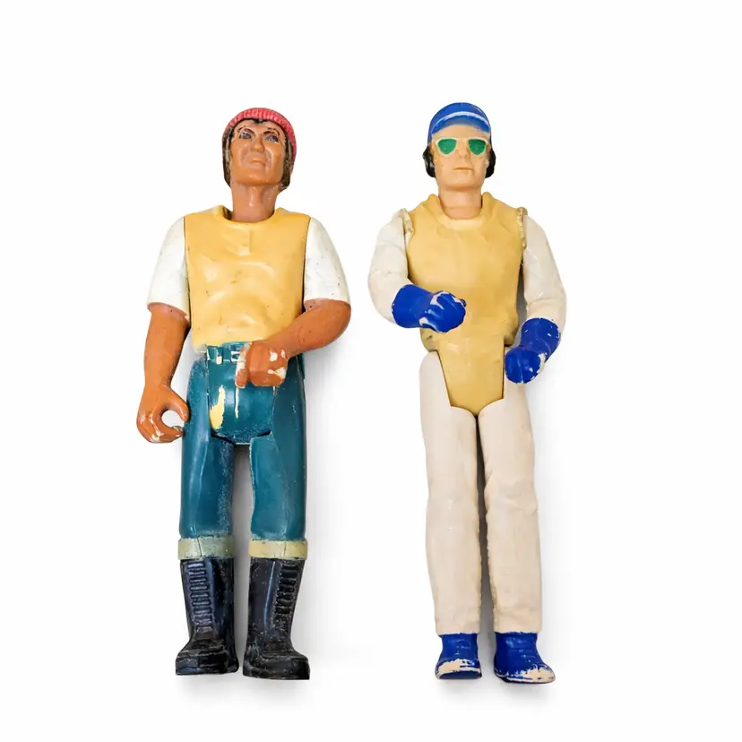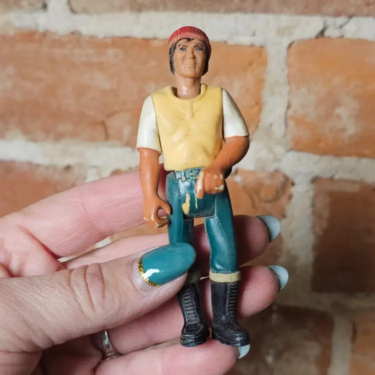 Worker: This figure has a yellow vest over a white t-shirt and green pants, with black boots and a red beanie. There is significant paint wear on the pants and back.