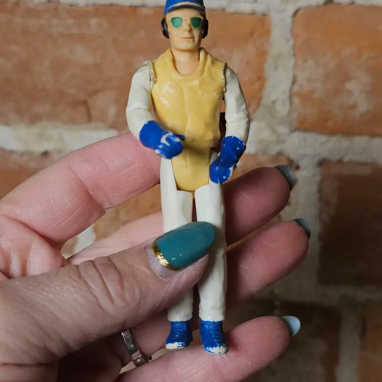 Pilot / Adventurer (Yellow/White): This figure wears a yellow vest over a white long-sleeve shirt and white pants, with a blue helmet and gloves. The figure is in good condition with minor wear.