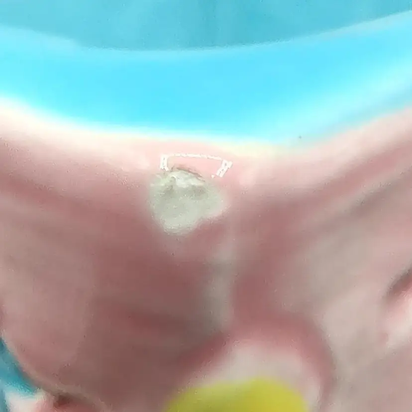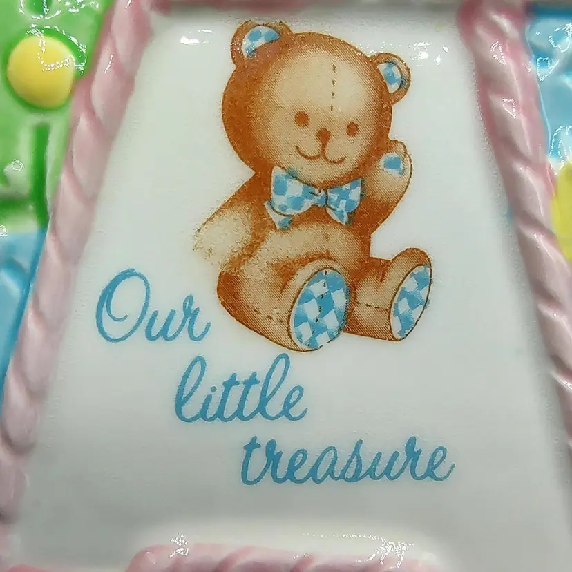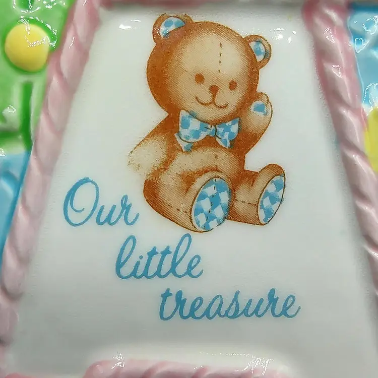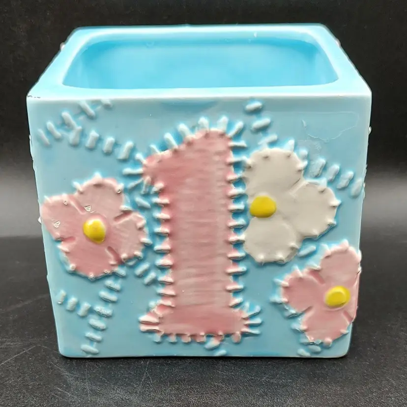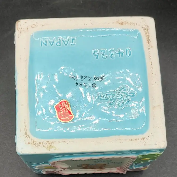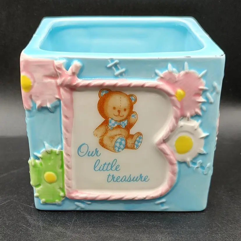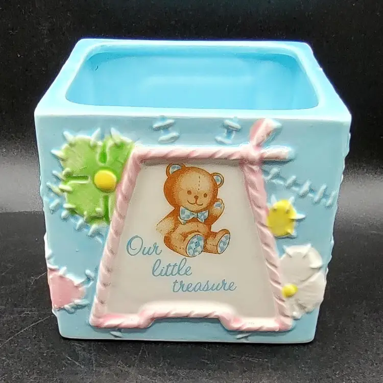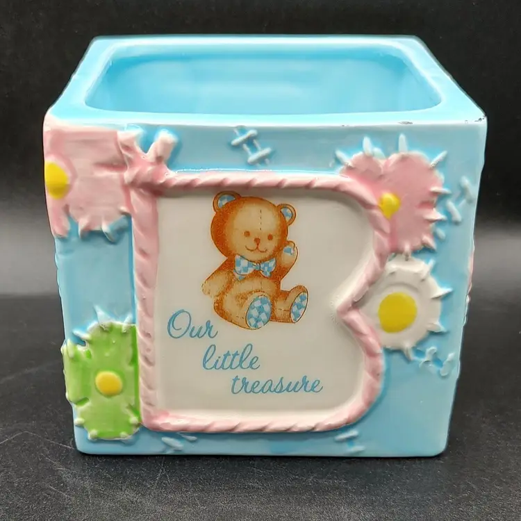 Vintage 1984 Lefton Baby Block Ceramic Nursery Planter "Our Little Treasure". Has a flea chip see pictures for details. Height 3.5" x width 4" x length 4". Made in Japan