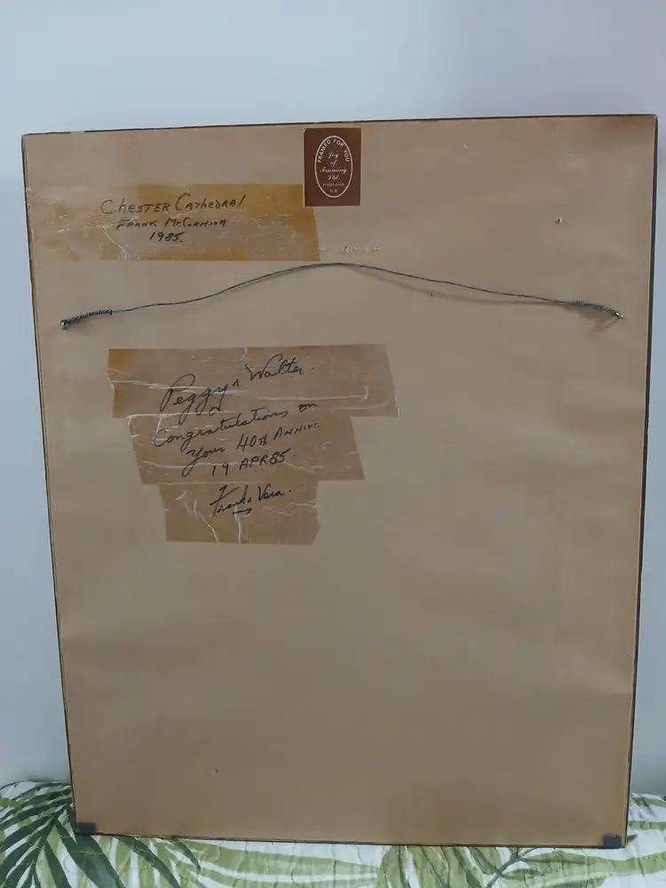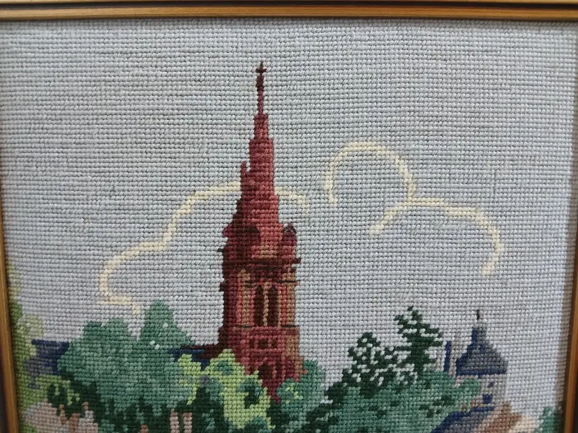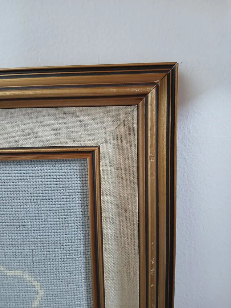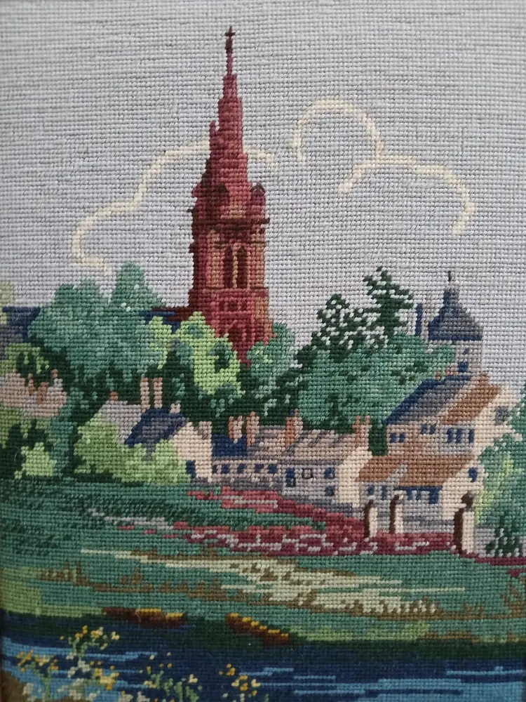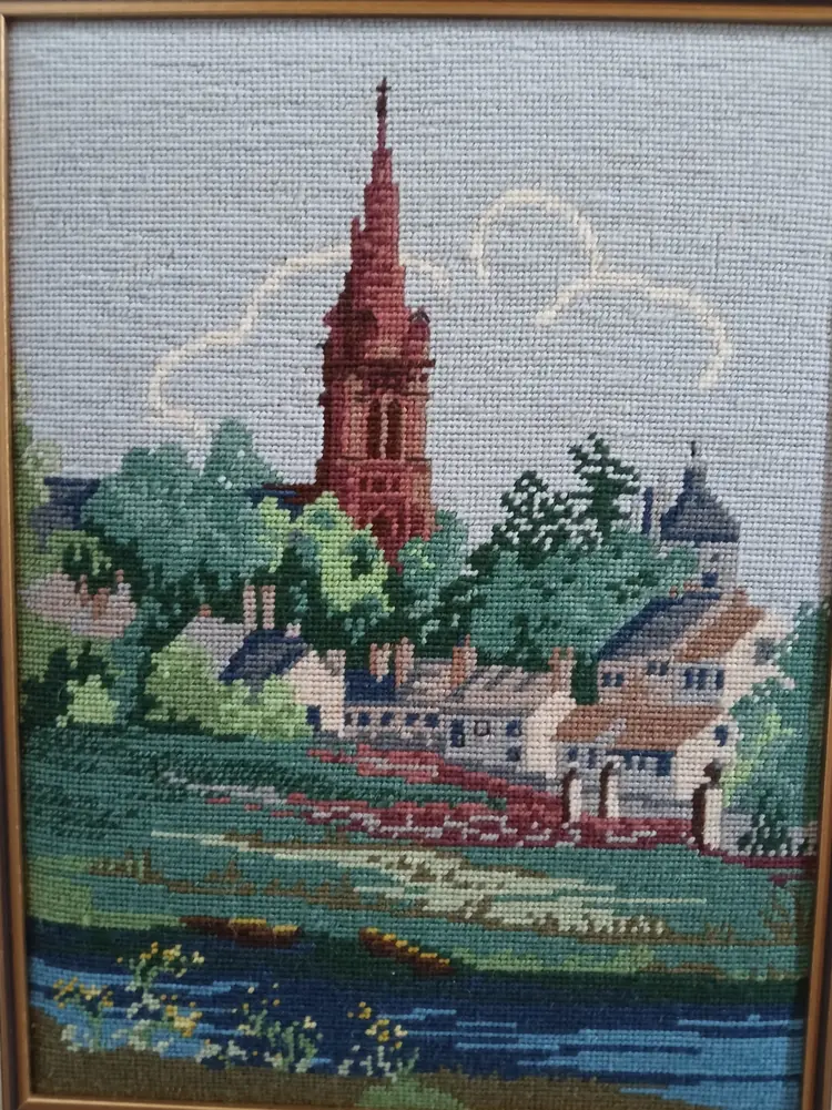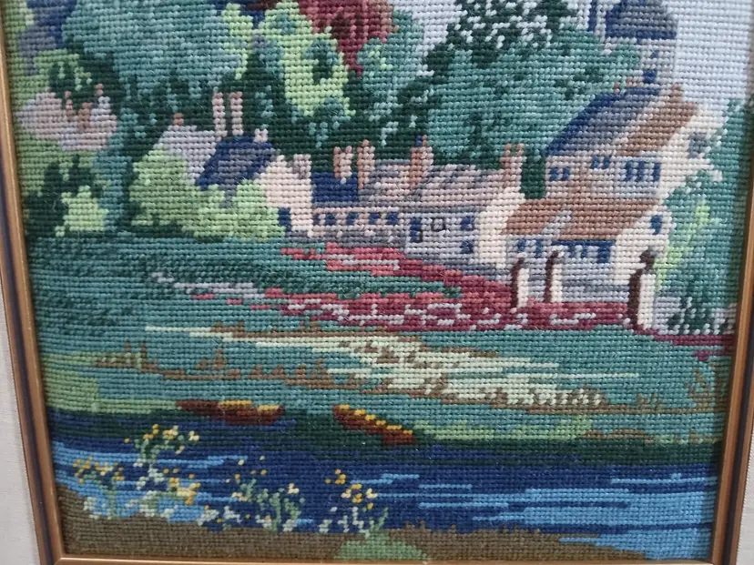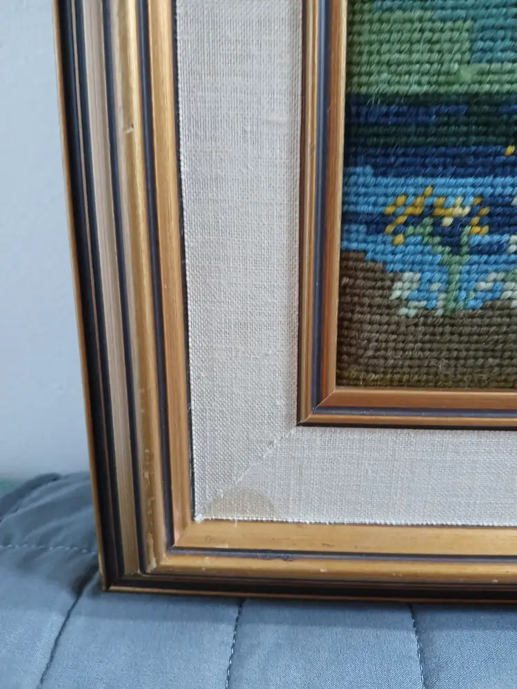 Beautiful framed needlepoint featuring a lovely countryside scene with a historic church and a meandering stream. Professionally framed with sticker on back and dated 1985. Original gold wood frame with linen border detail. Frame is solid, however there are minor signs of wear, with a spot on linen (bottom left corner). Add this unique piece to your gallery wall or hang alone as a statement piece.
