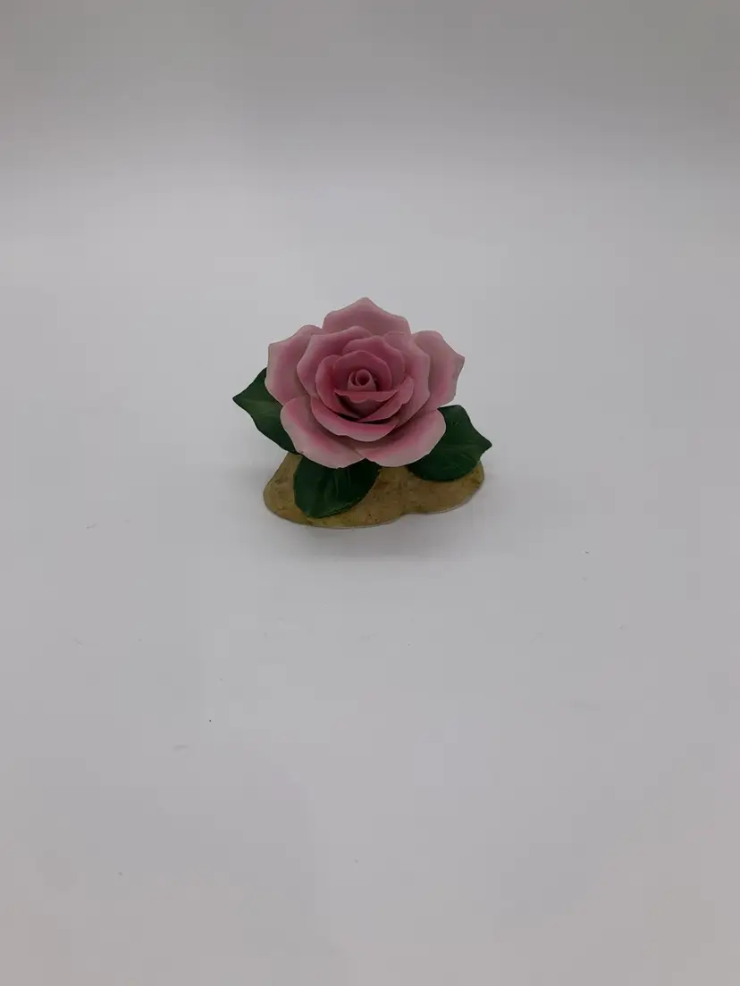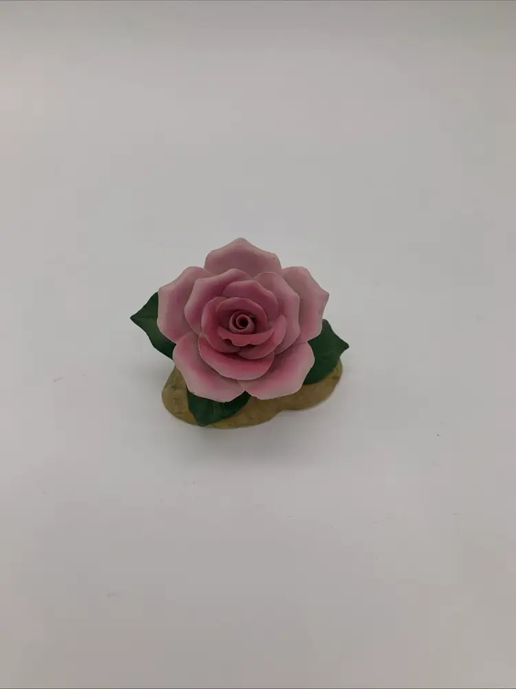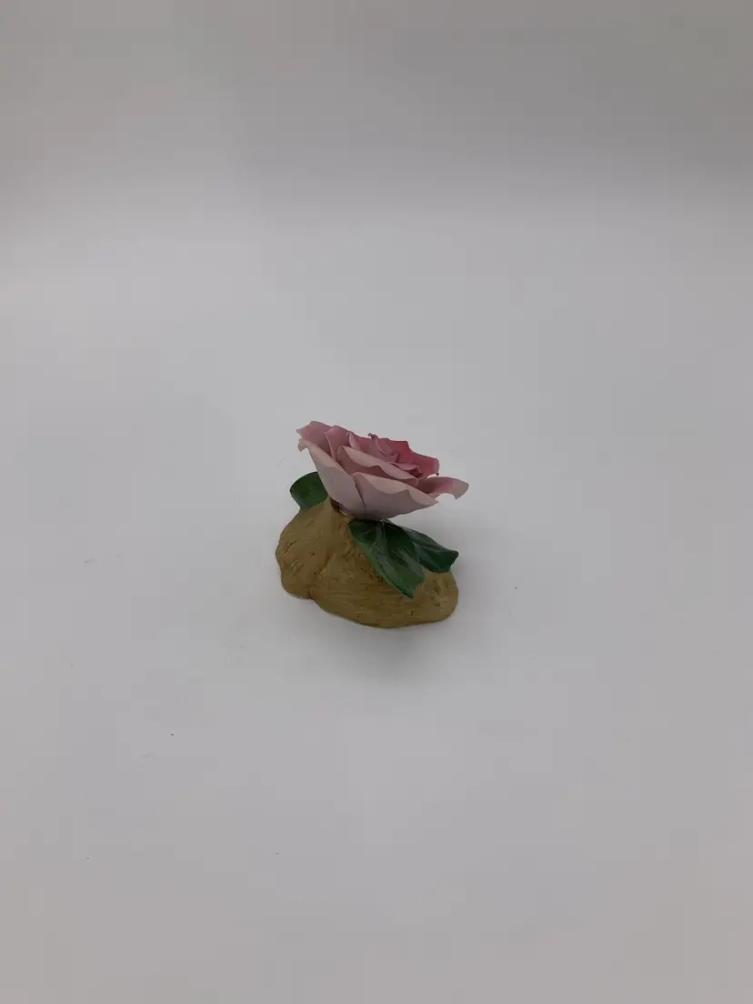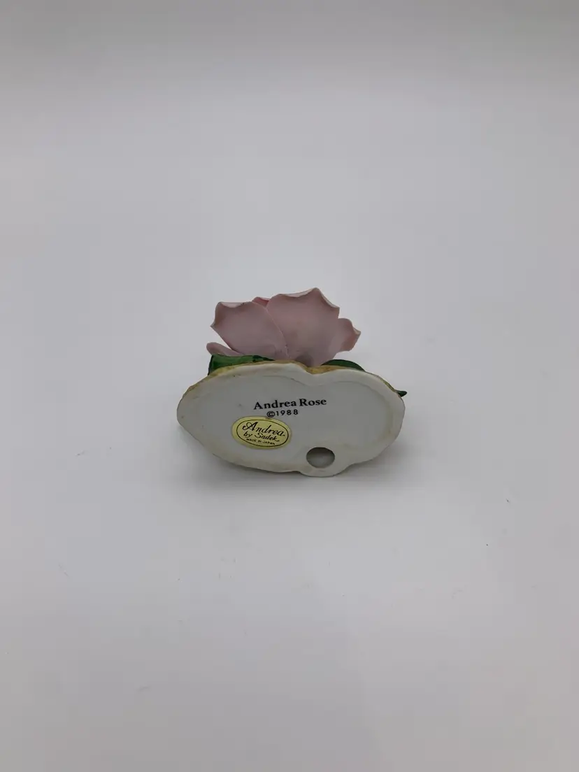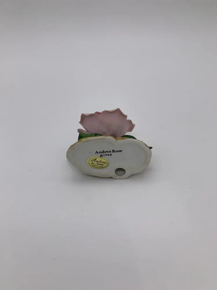 This vintage 1988 pink porcelain Andrea Rose figurine by Andrea Sadek is a small collectible piece that measures 4" in length and 3" in height. It features a hand-painted matte finish with a 3D effect, depicting the character Andrea Rose in a realistic style. The figurine is handcrafted, making it a unique addition to any room in the house, particularly the bedroom, living room, or study. With its pink, green, and beige color palette and delicate design, this collectible piece embodies a theme of art, flowers, love, and romance, making it a charming and nostalgic decor item for lovers of vintage and handmade pieces. This beautiful flower is very delicate and does appear to have a few very small flea bites and is in good condition for its age, this is usually common yet hard to find these in This good of condition. Please see all pictures for details.