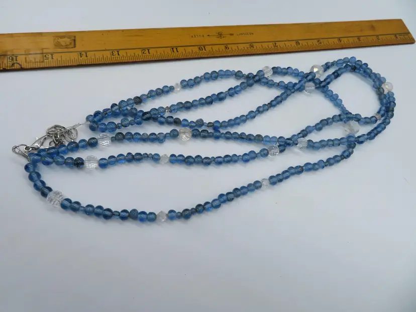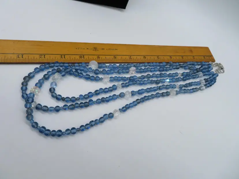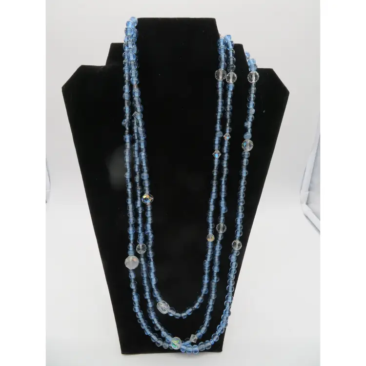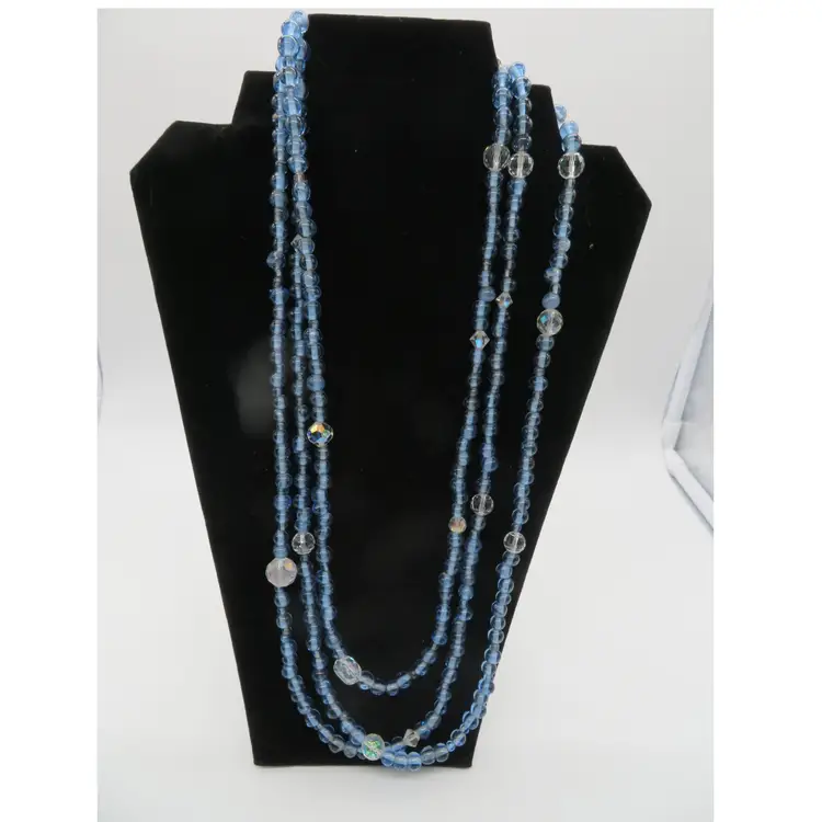 Item Description: For your consideration is a vintage 1990’s glass bead triple drop necklace. The glass beads range in size and are blue & clear. The drops range from 10.5” to 12.5”. It feels good on the neck, cold and smooth.