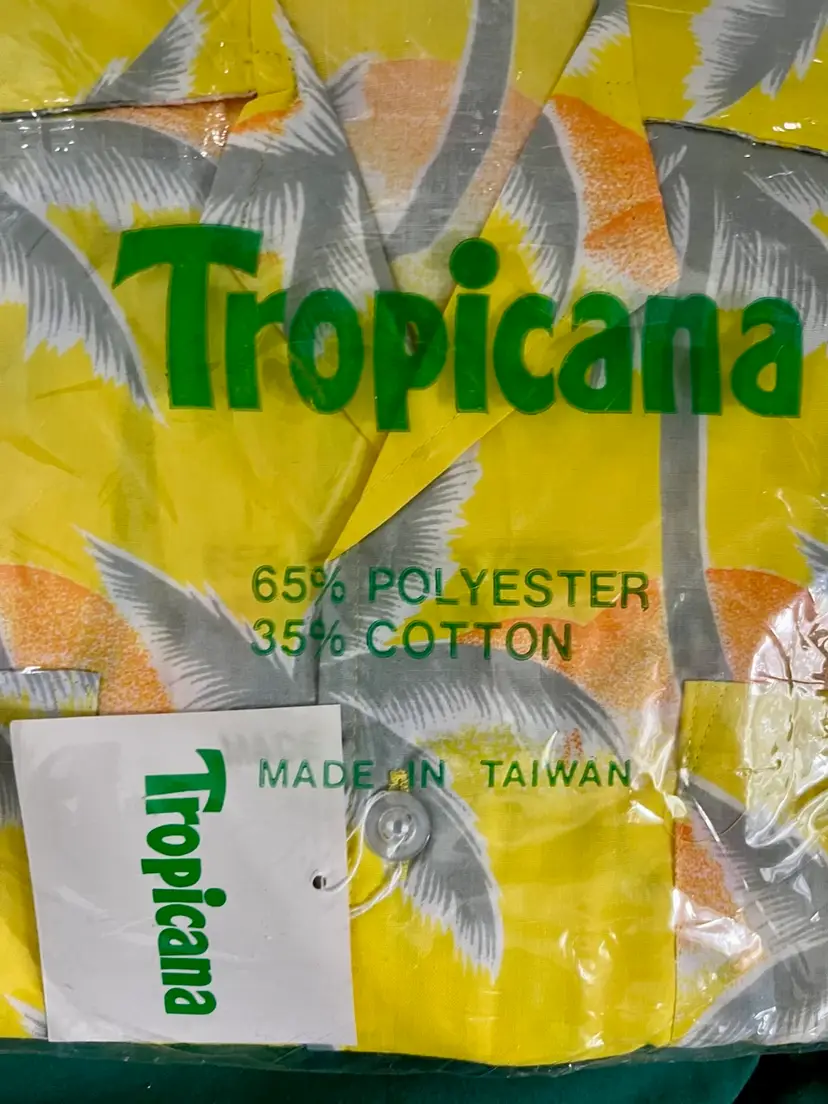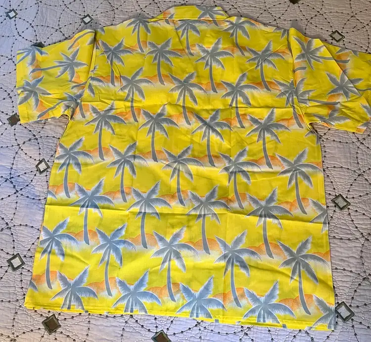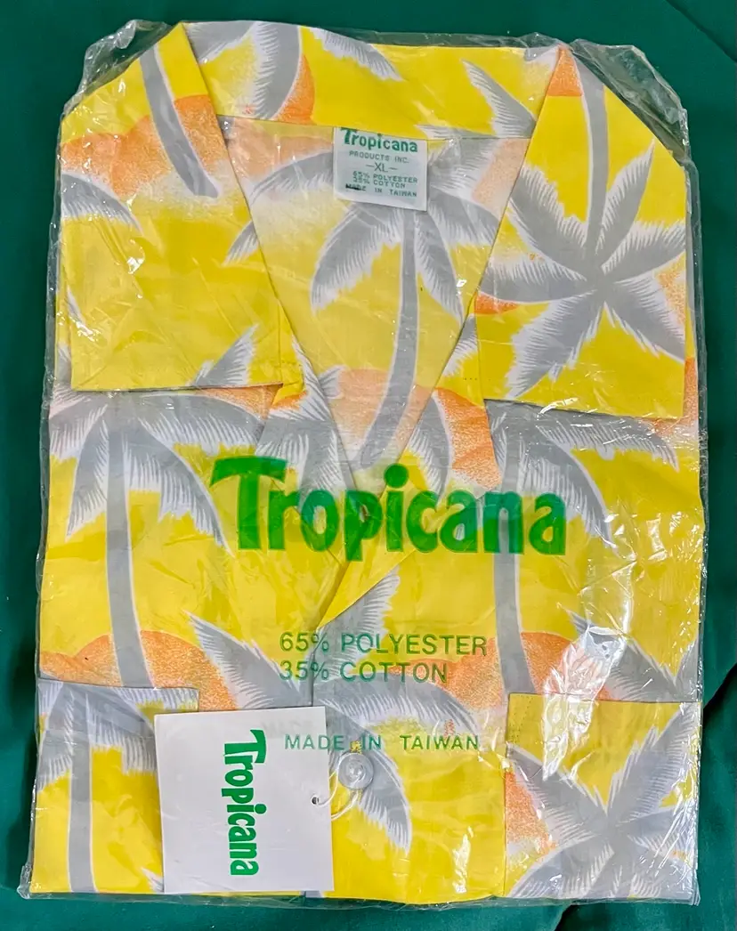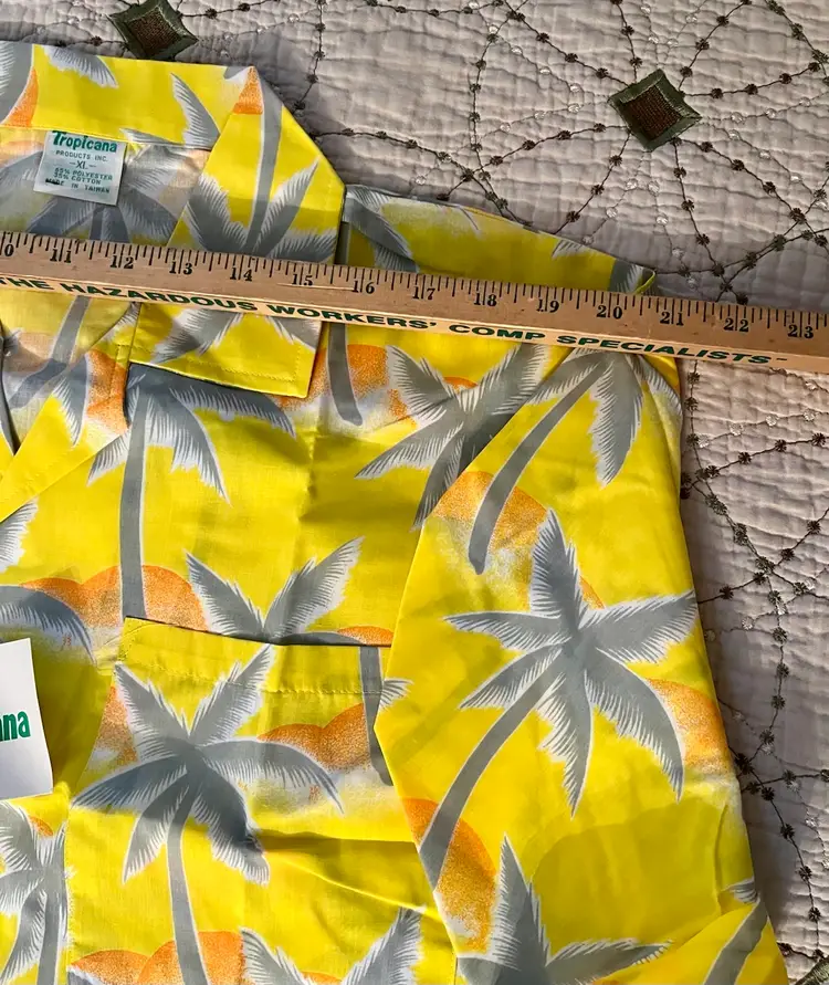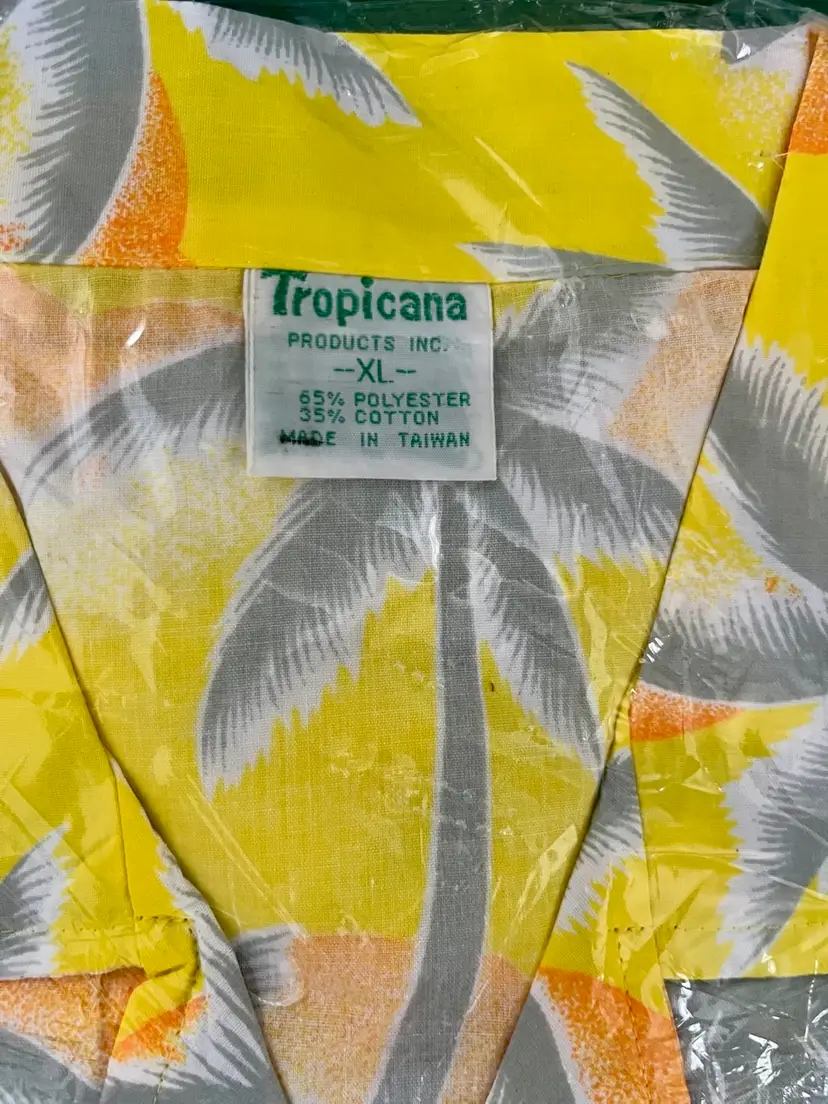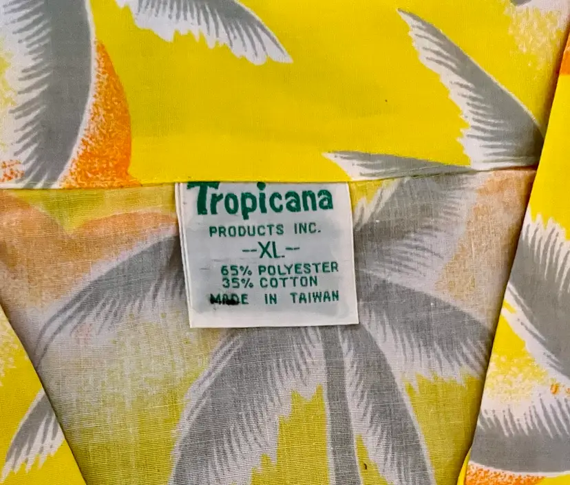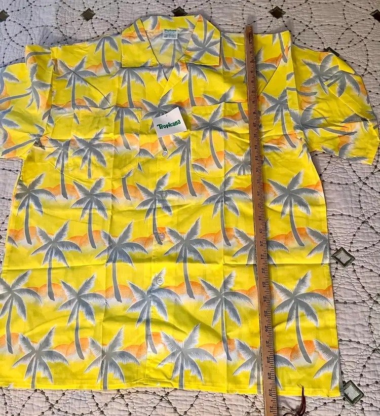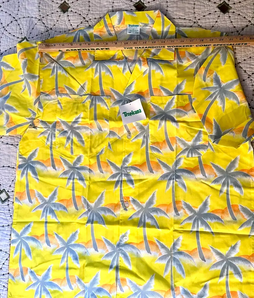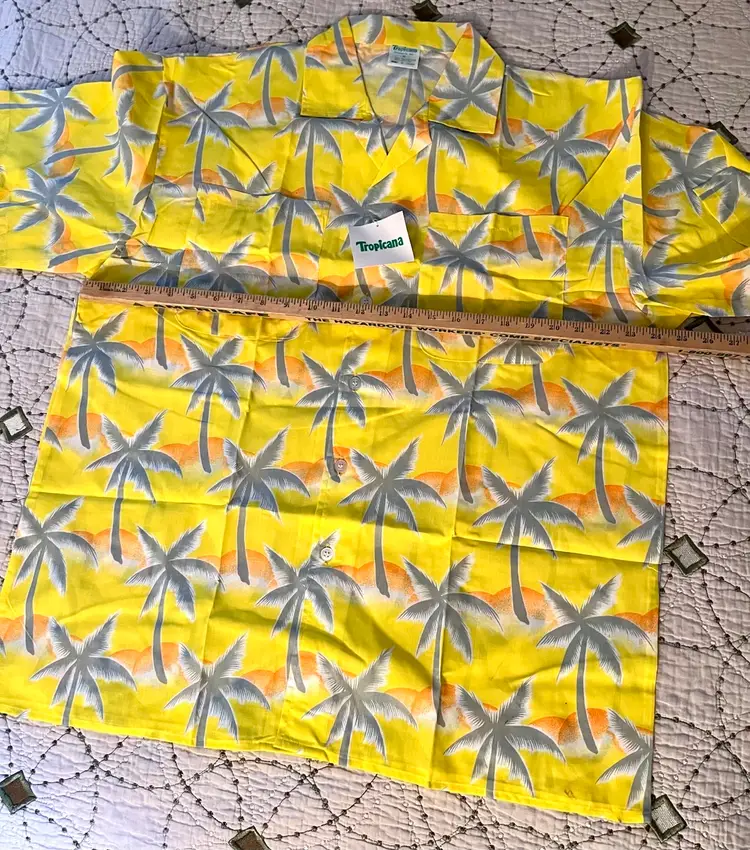 This vintage 1990s Hawaiian XL size shirt by Tropicana advertising promotional features a yellow floral design with palm trees, perfect for a casual, travel, beach wedding wear. Made from a blend of 65% polyester and 35% cotton, this collared shirt with a button closure and chest pocket is machine washable and has a regular fit with chest pocket. The shirt is approximately 49” in chest size (SEE PHOTOS) and is tropical theme, making it a fun retro addition to any wardrobe.