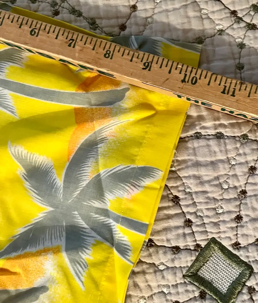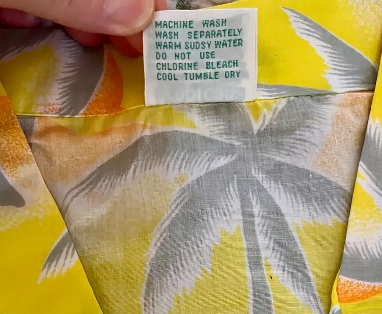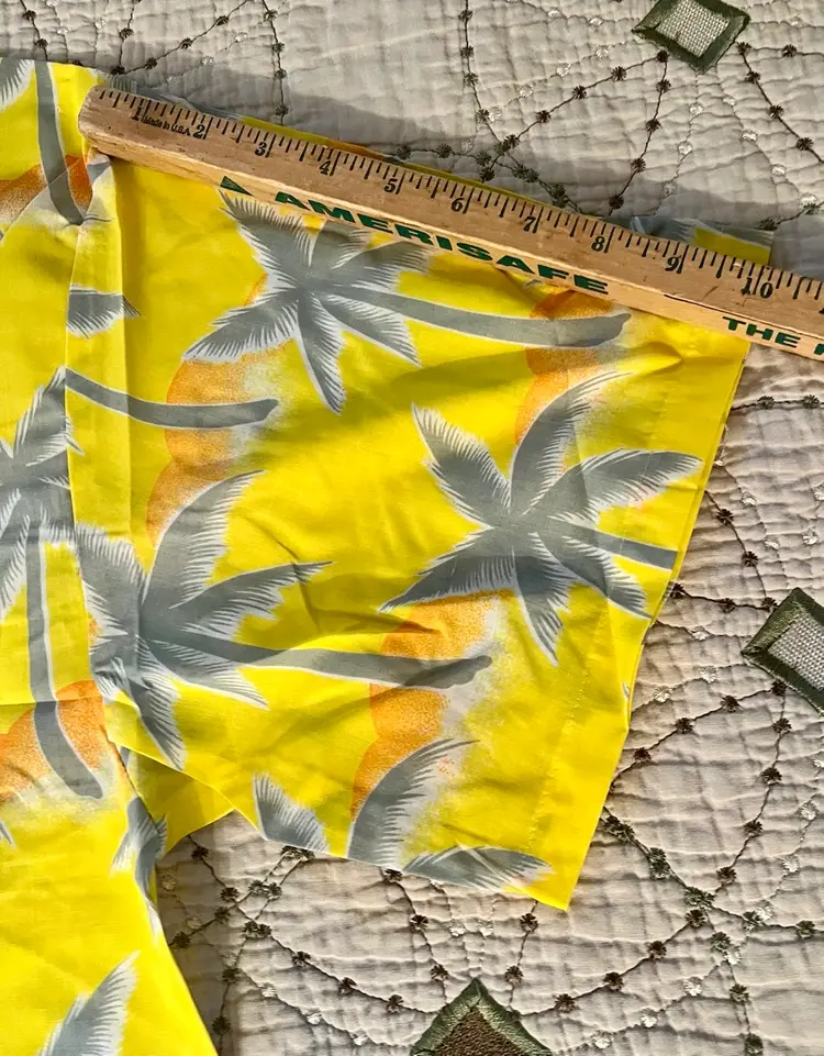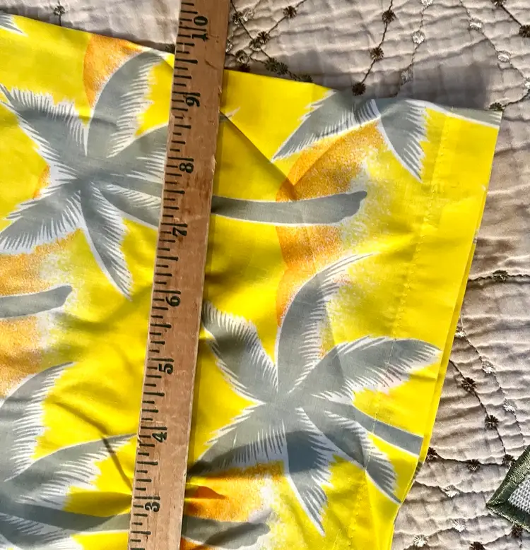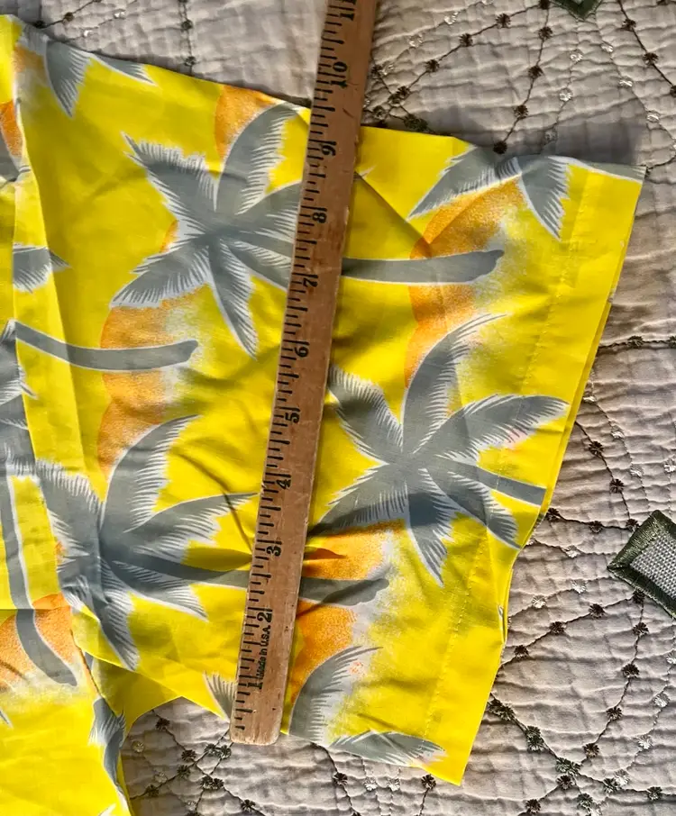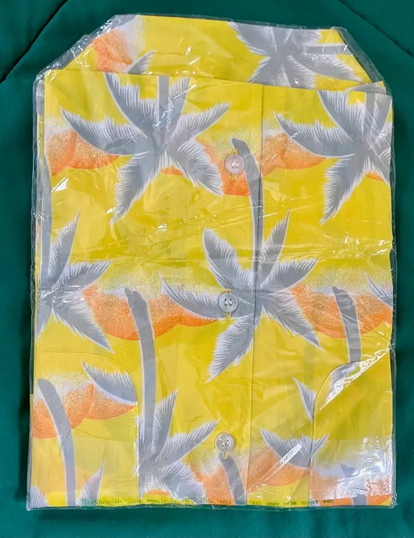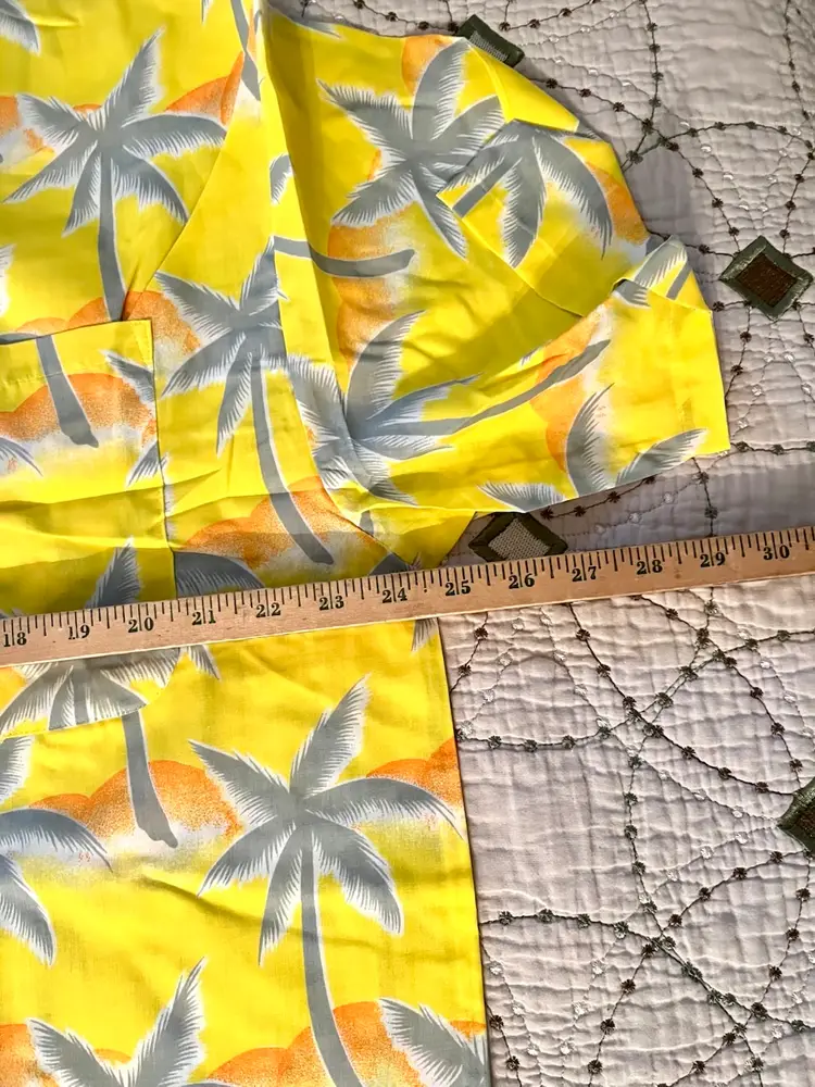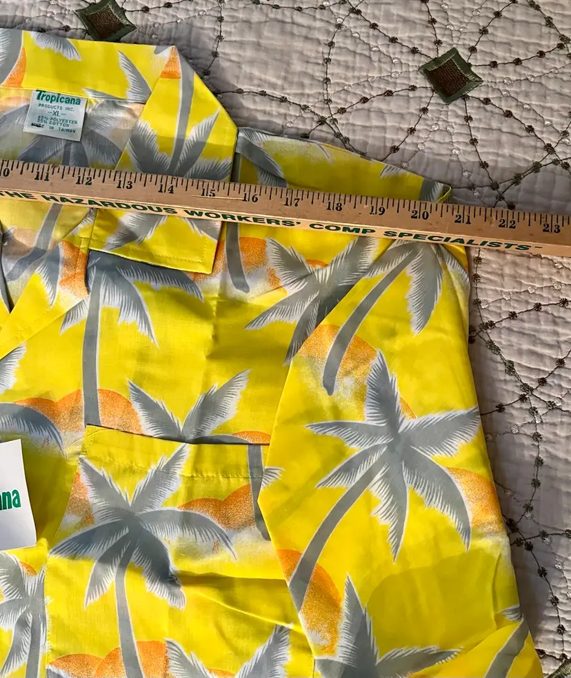 This vintage 1990s Hawaiian XL size shirt by Tropicana advertising promotional features a yellow floral design with palm trees, perfect for a casual, travel, beach wedding wear. Made from a blend of 65% polyester and 35% cotton, this collared shirt with a button closure and chest pocket is machine washable and has a regular fit with chest pocket. The shirt is approximately 49” in chest size (SEE PHOTOS) and is tropical theme, making it a fun retro addition to any wardrobe.