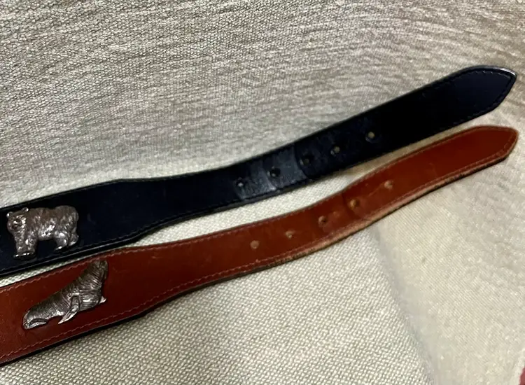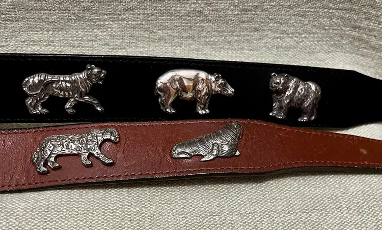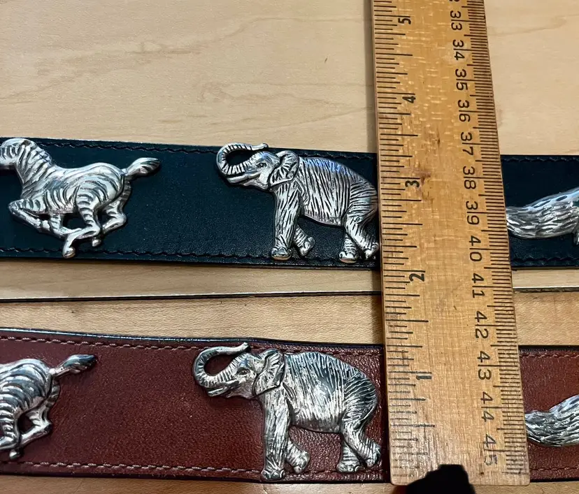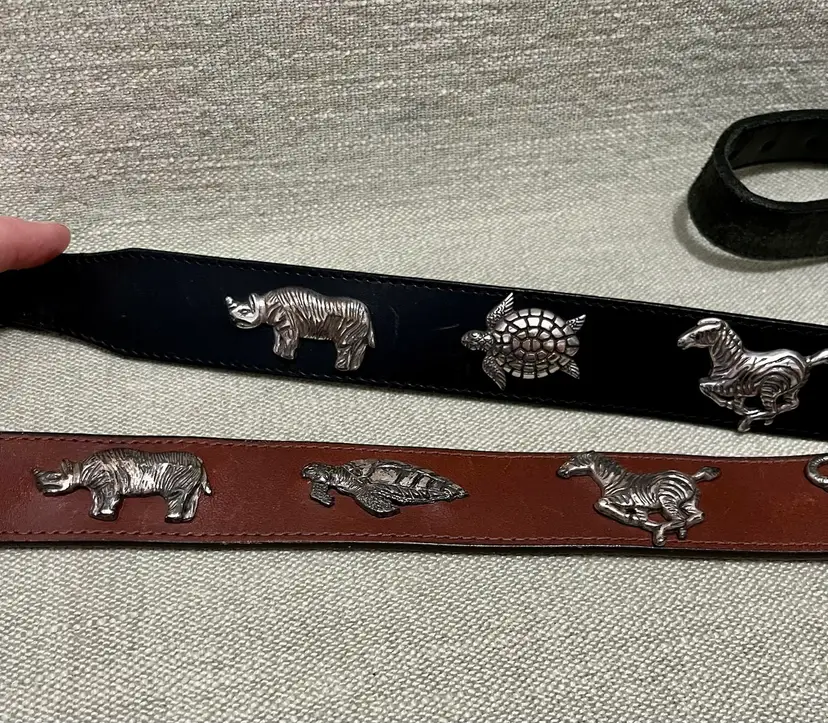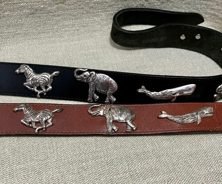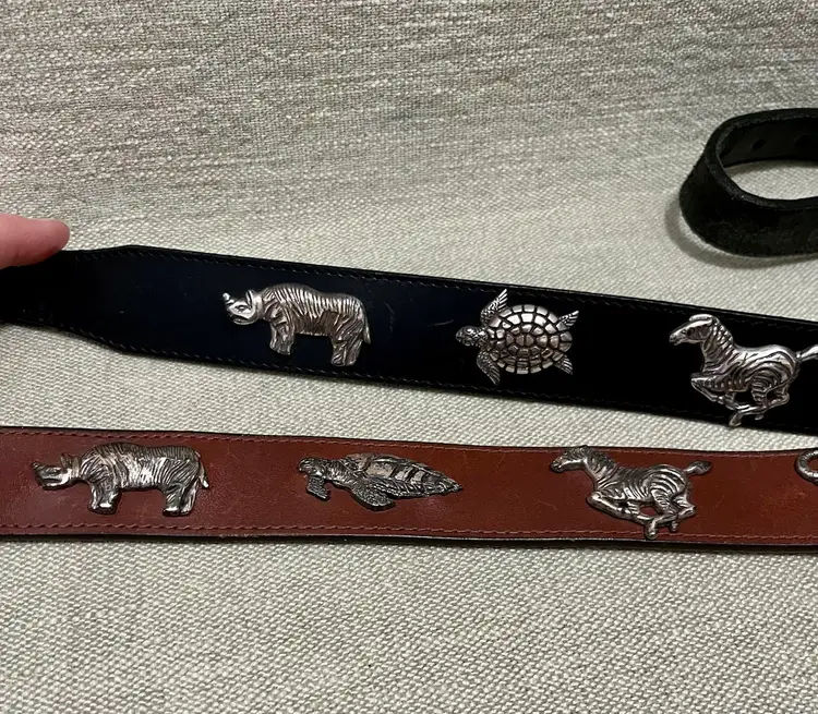 TWO BELTS: VTG 1992 HONEST by BRIGHTON Safari Animals Leather Belt are vintage pieces with a solid brown and black color design, featuring safari animal accents. The belt comes in two sizes, 26 and 28 inches, with a normal width (shown in photos) and a solid “aged” brass buckle and animal accents. With a 90s theme and adjustable feature, these are women's or teen accessories adding both stylish and unique addition to any wardrobe.
