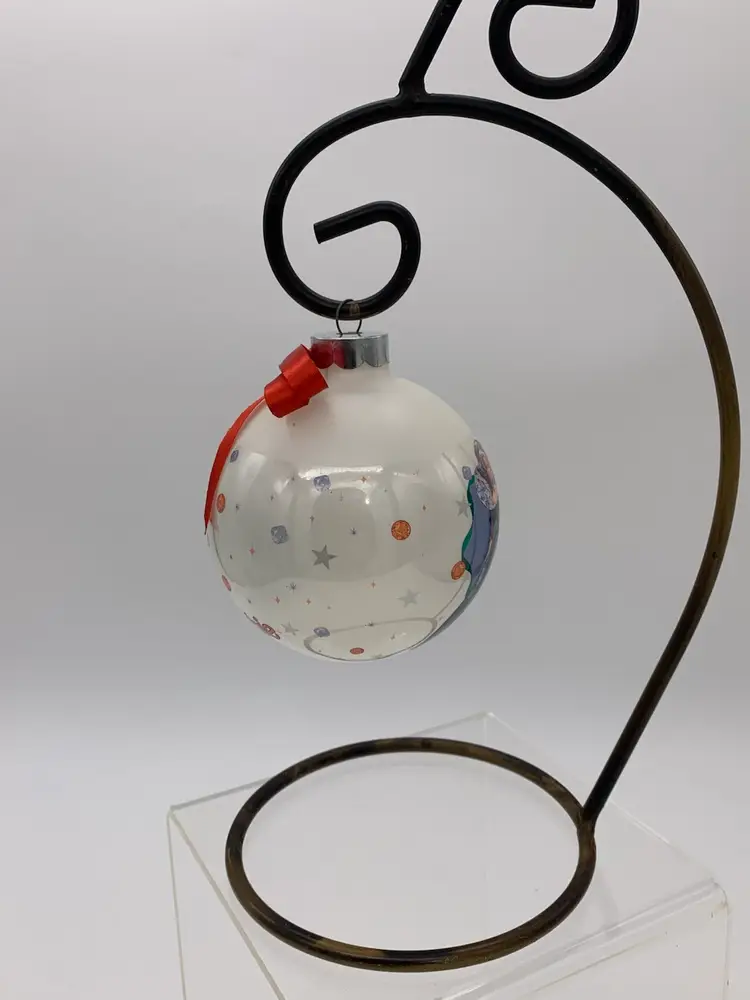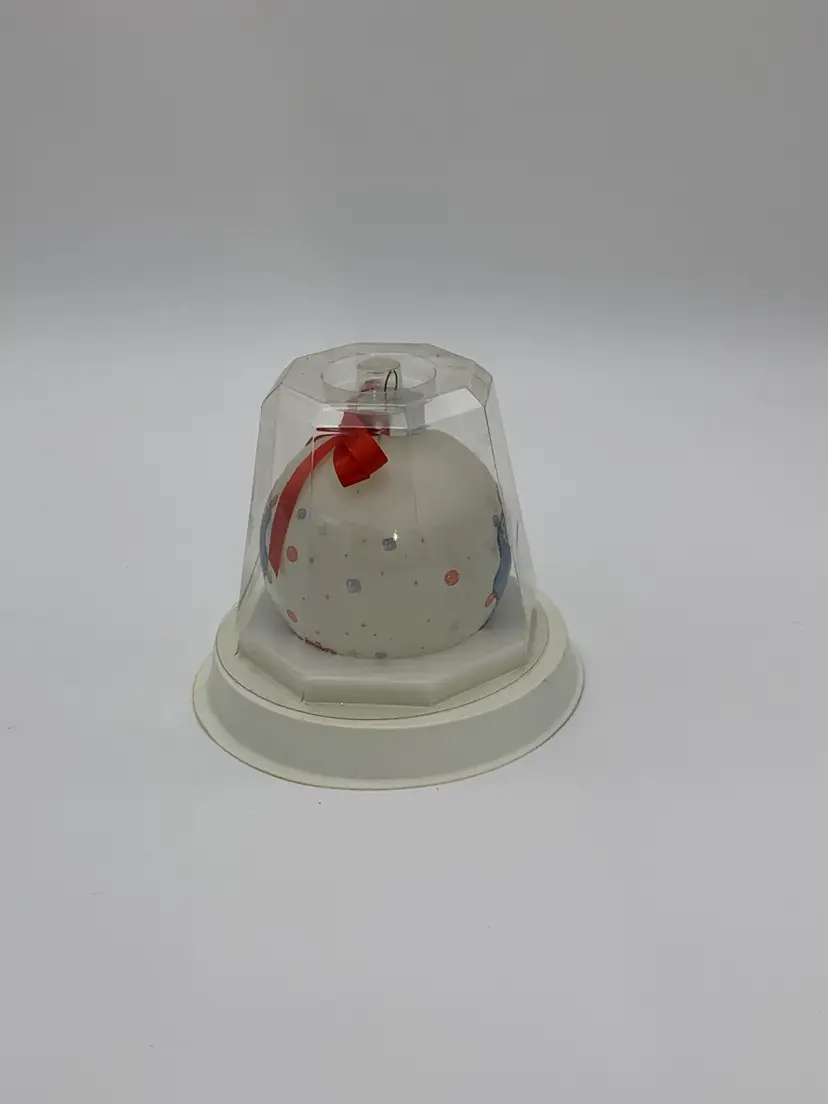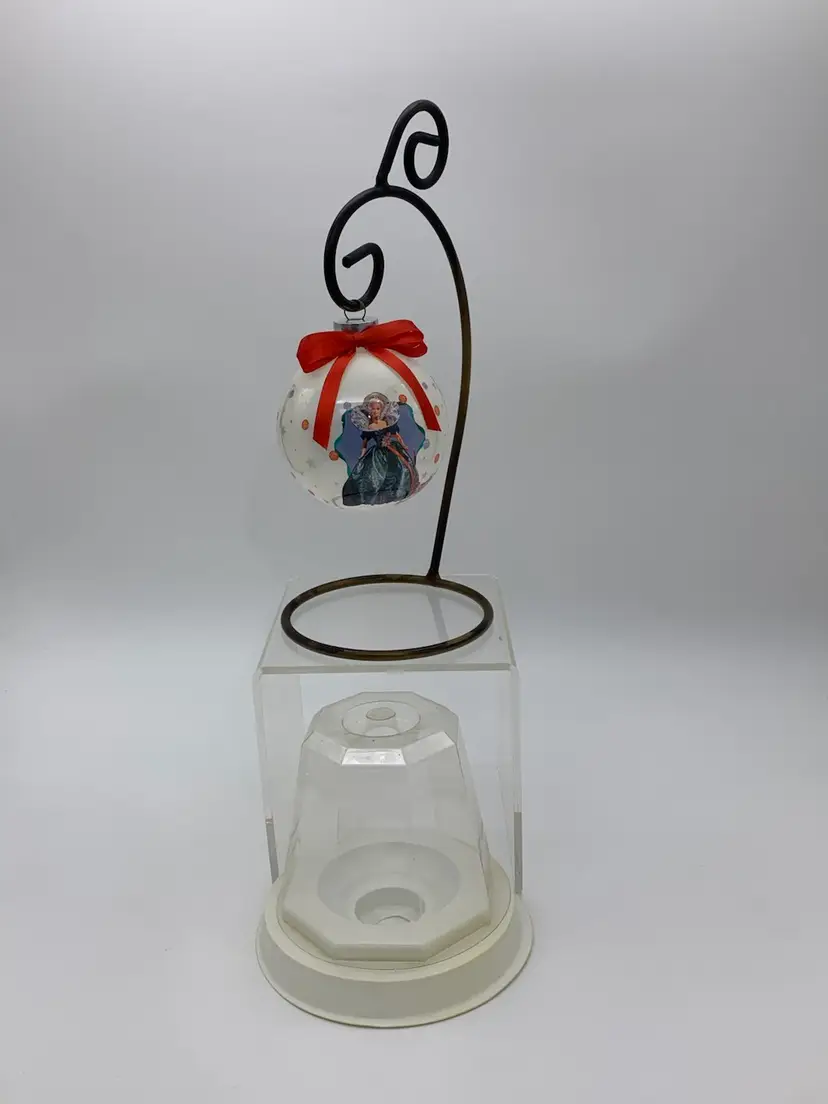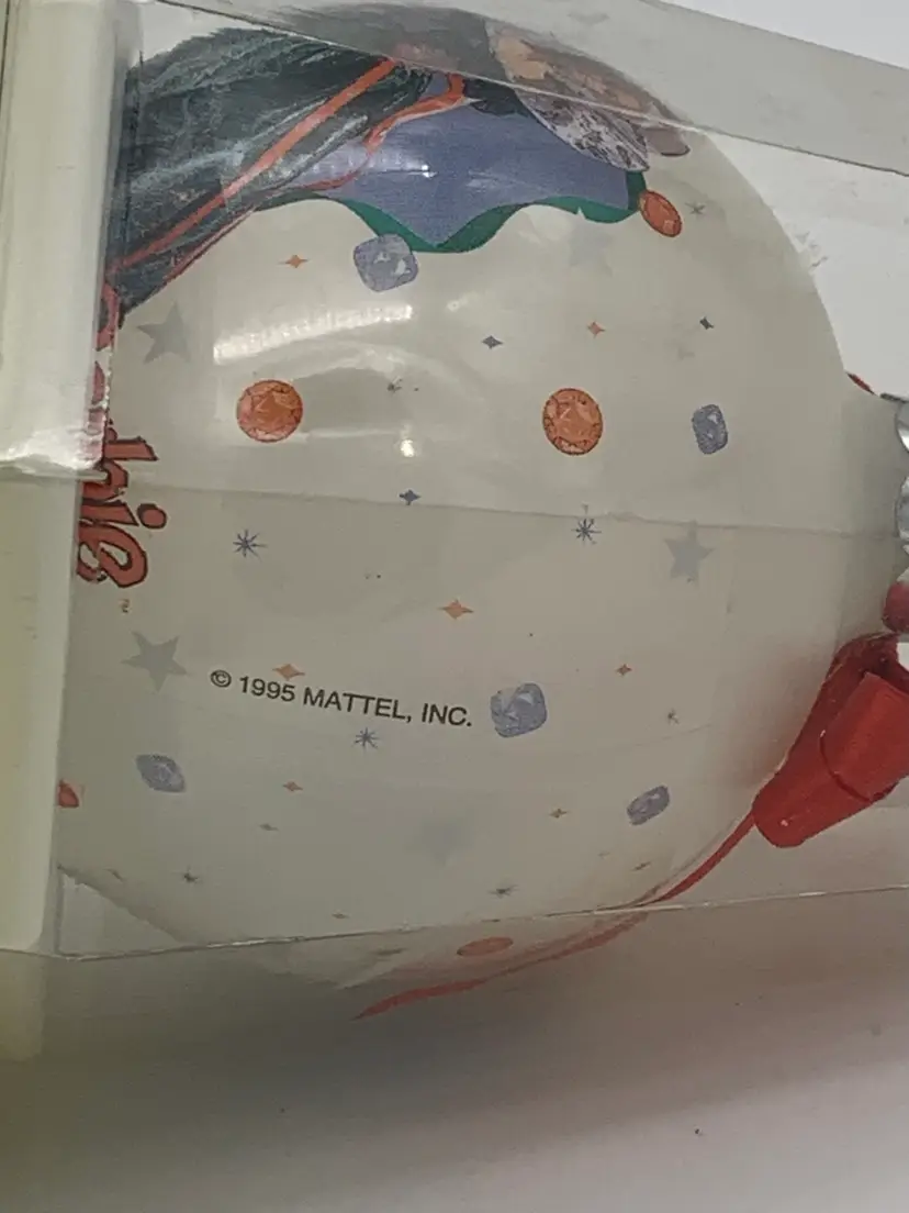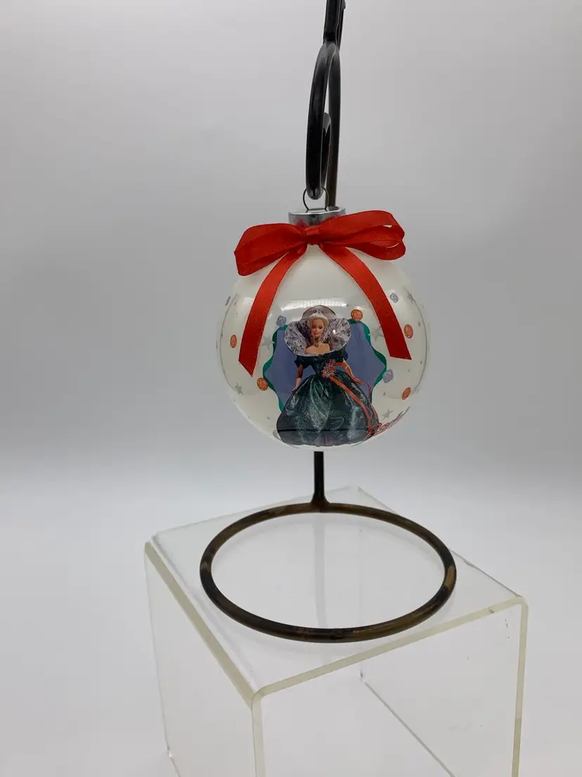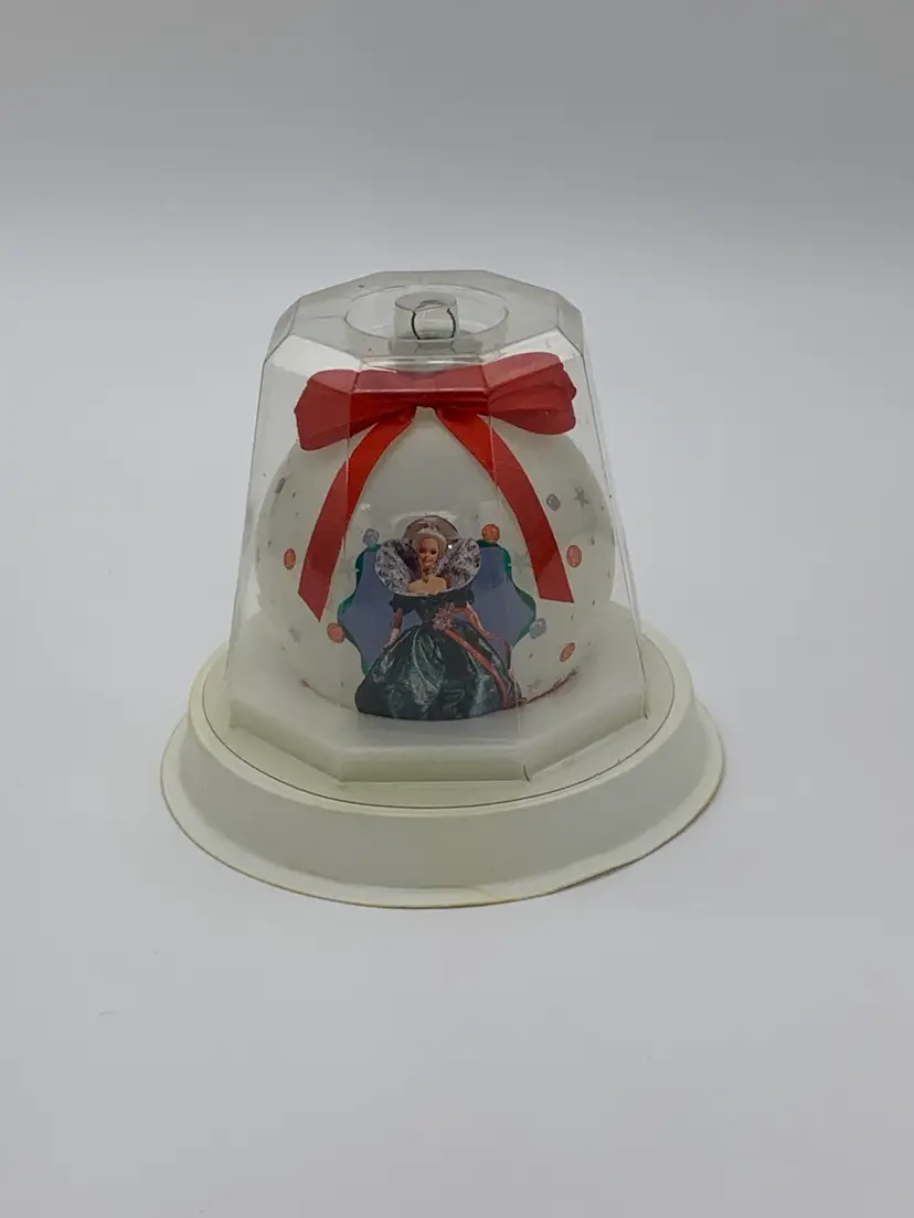 This vintage 1995 collectible MATTEL Barbie Round Glass Christmas Ornament with Display is a unique and festive addition to any holiday decor collection. The ornament features a holiday Barbie design in a solid white color with a multi-color pattern, standing at 5" tall in a round tower-shaped plastic display/storage box. This medium-sized ornament is made of glass, metal, materials, and comes with a red bow made of fabric, making it a decorative and nostalgic piece perfect for Christmas or any occasion. The Barbie ornament from the 1990s is a desirable item for collectors and fans of the Barbie franchise.