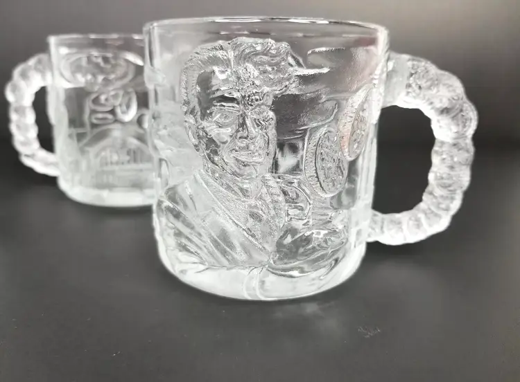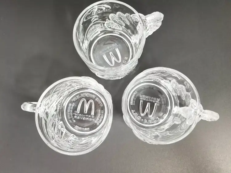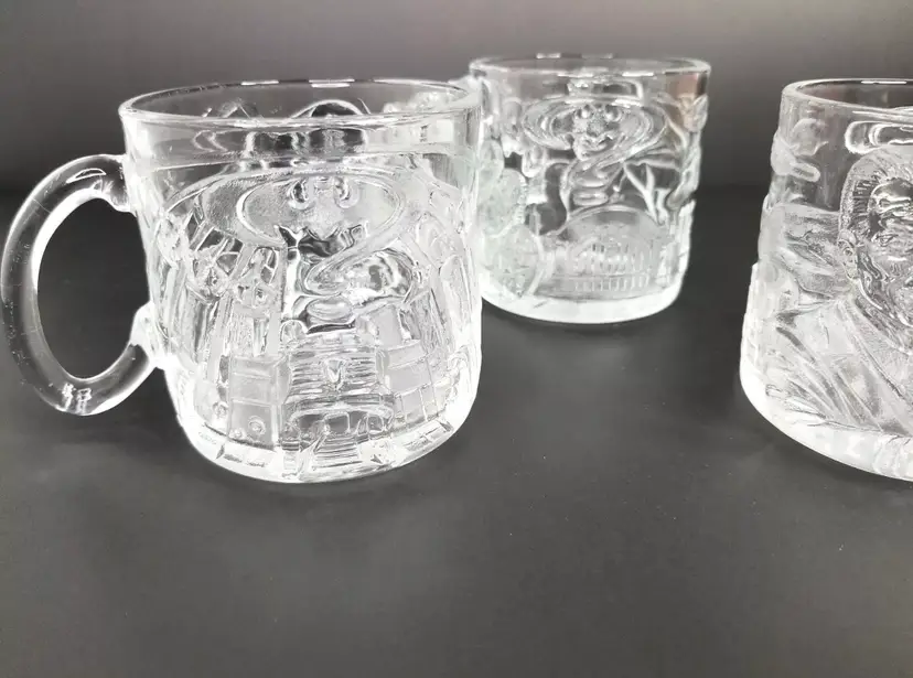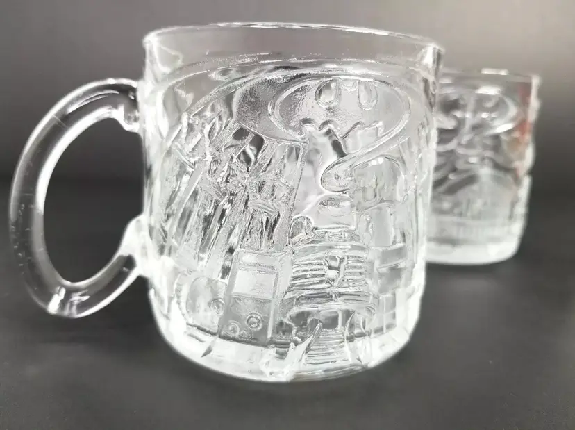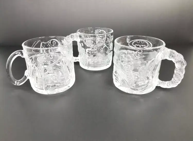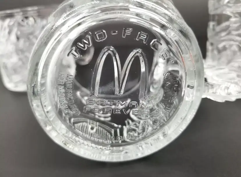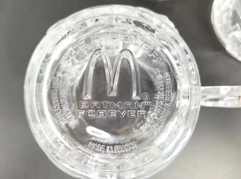 Vintage Collectible 1995 McDonalds Batman Forever Glass Mugs Set - made in France. Set of 3: 2 of - Two - Face 1 of - The Riddler Condition: mint, excellent. Measurement: 3" tall.