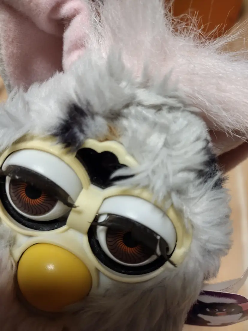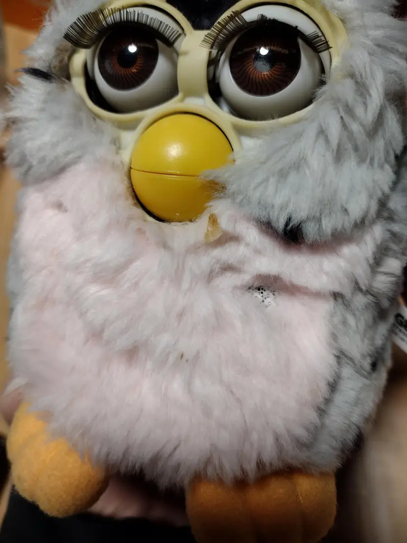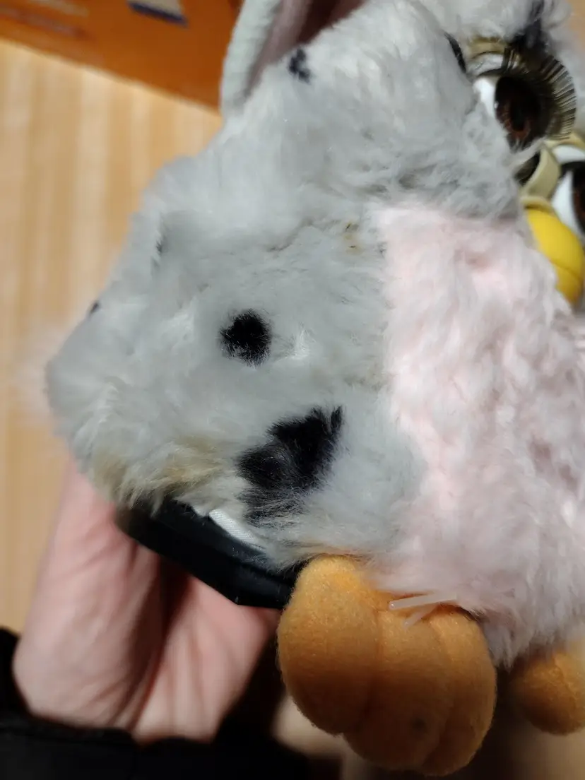 There are stains on the Furby see photos. There is a small piece of fabric missing see photo.