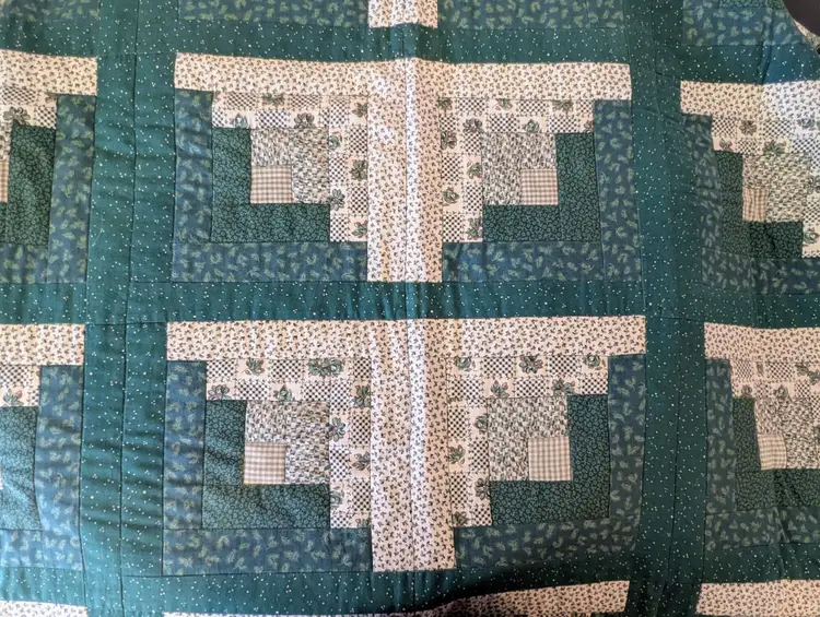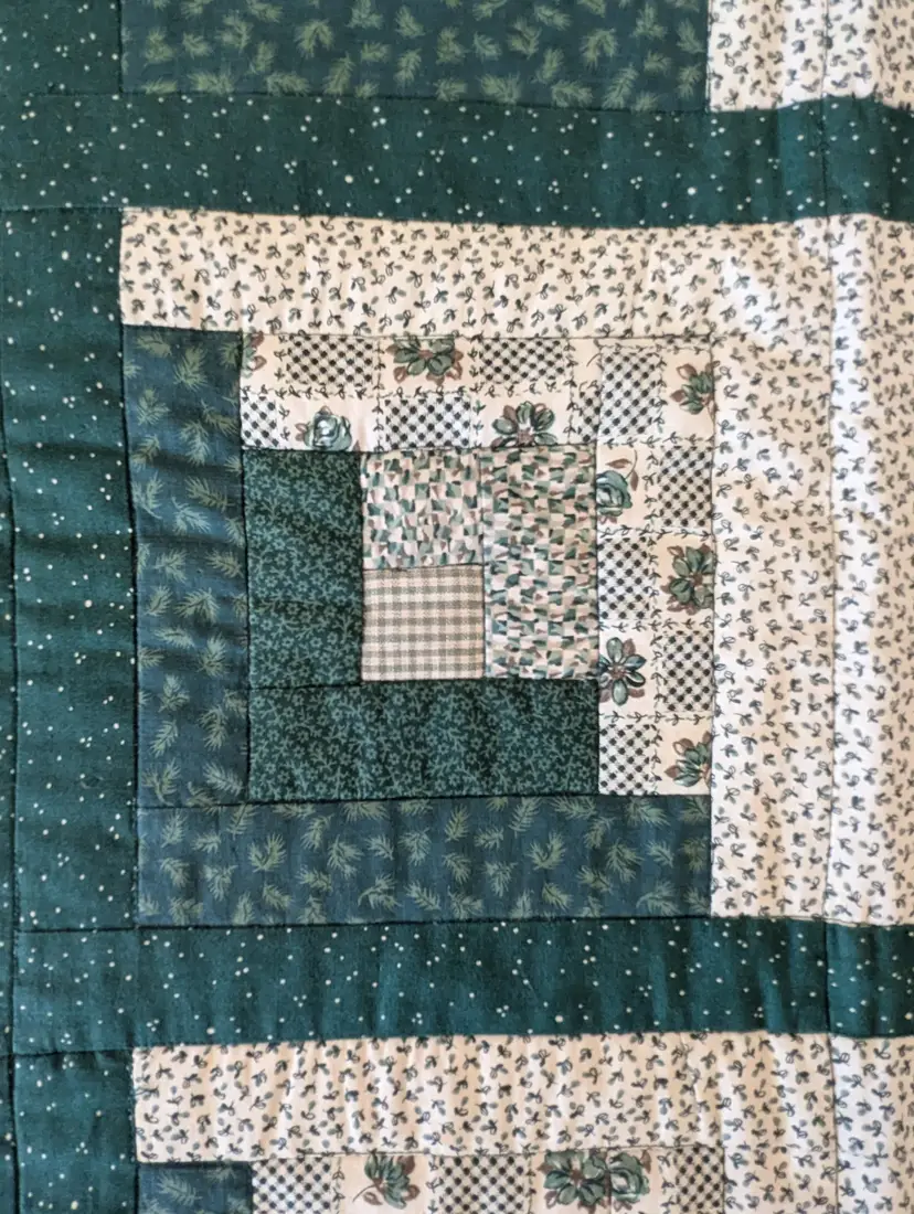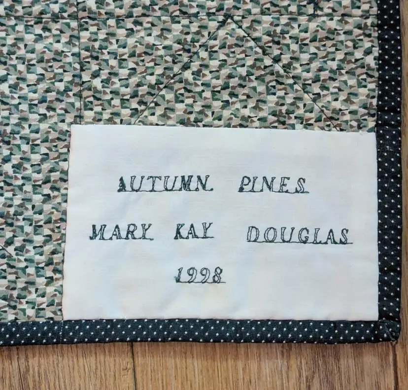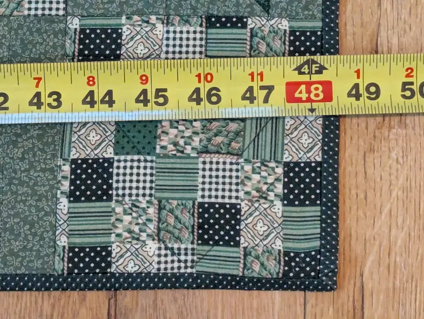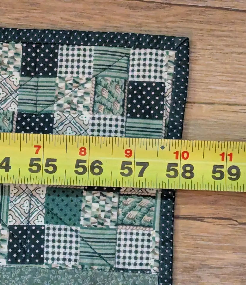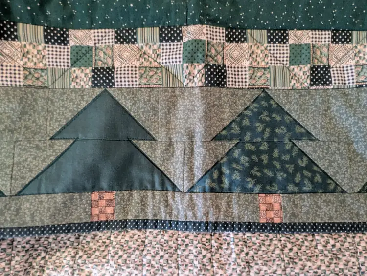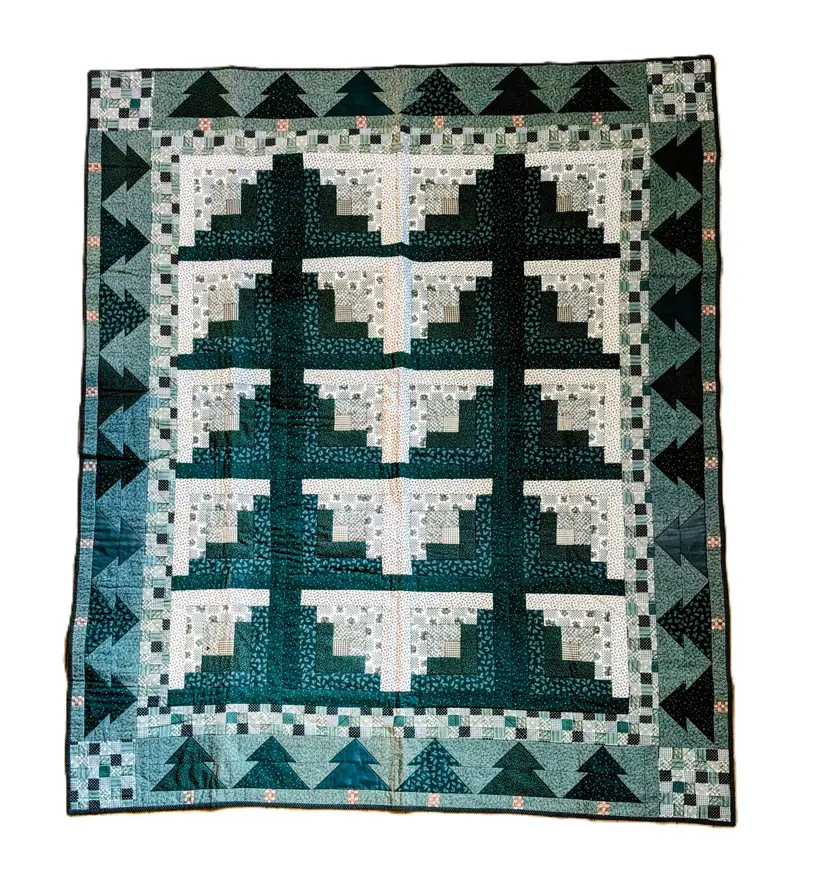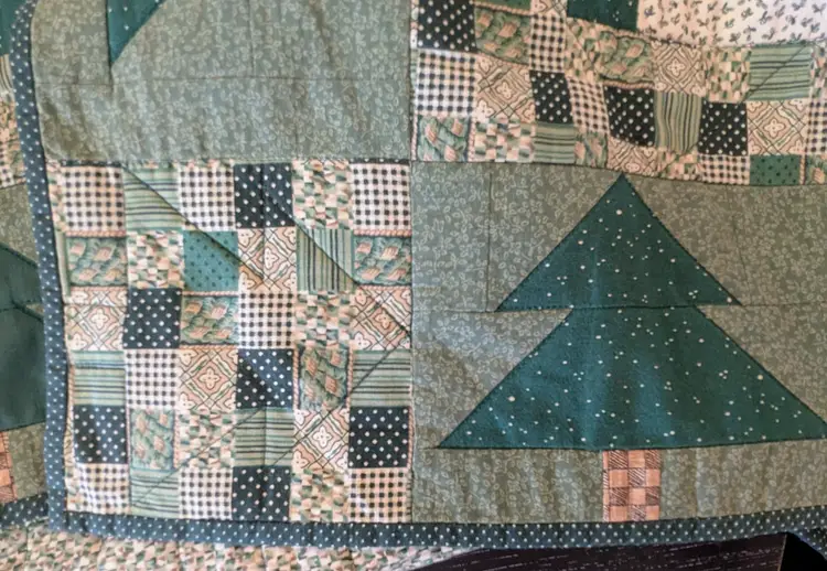 This vintage 1998 Pine Tree Sampler Quilt is a beautifully machine stitched piece that measures 70"x48". Made from 100% cotton, this original quilt features a charming Christmas tree design in shades of green, perfect for all seasons. The quilt is large enough for any room in your home and is a unique addition to any collection. Handmade in the United States during the 1990s, this vintage quilt is sure to add a touch of nostalgia and warmth to your decor. It's signed by the maker/artist.