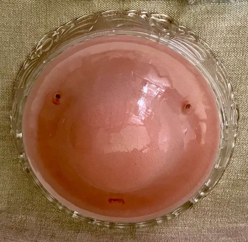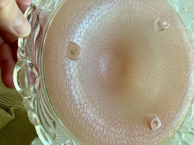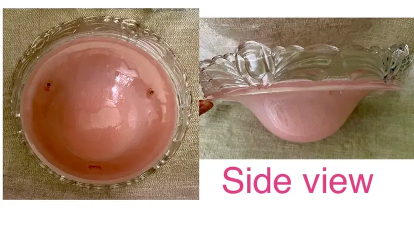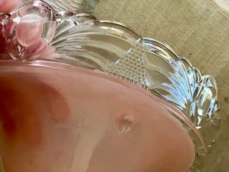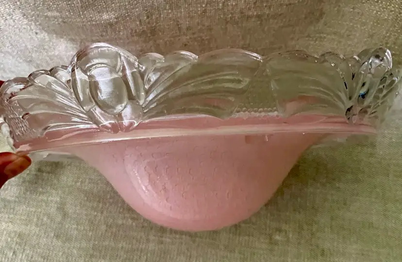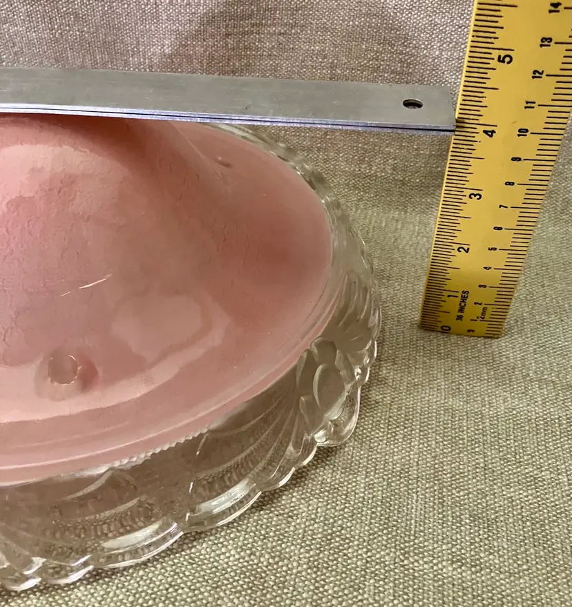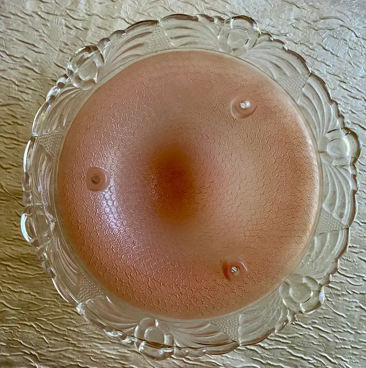 This vintage glass lamp shade features a soft pink and clear color scheme with an abstract scalloped border and interior pink repeating circles. Measuring approximately 10.25 inches in diameter and 4 inches in height, it has a round shape and is compatible with hanging (by modifying) and ceiling lighting. The shade weighs approximately 2 pounds 5 ounces.