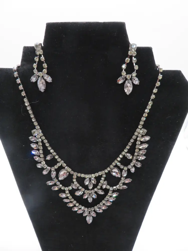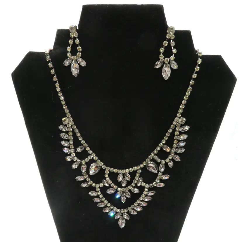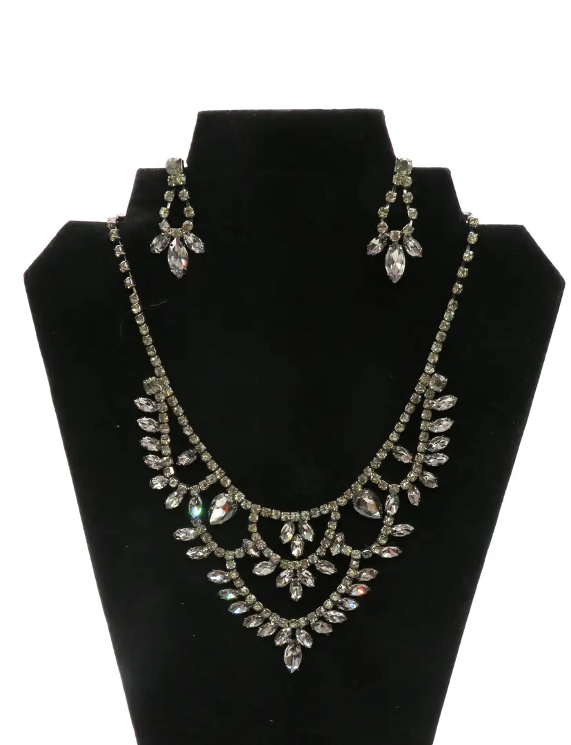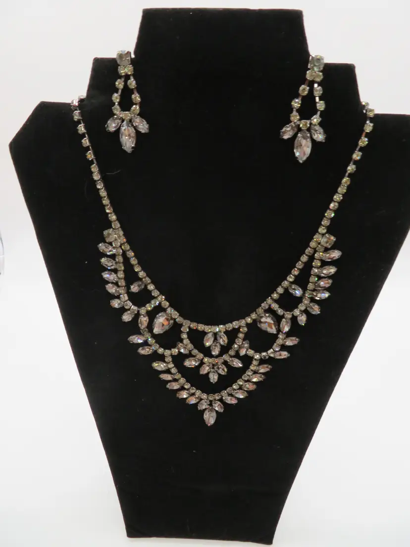 Item Description: For your consideration is a vintage 1990’s 3-piece set, Necklace and earring set done in black crystals. It is a single chain with a chandelier drop that falls nicely on the chest. It is unmarked.