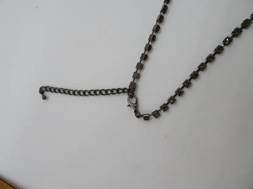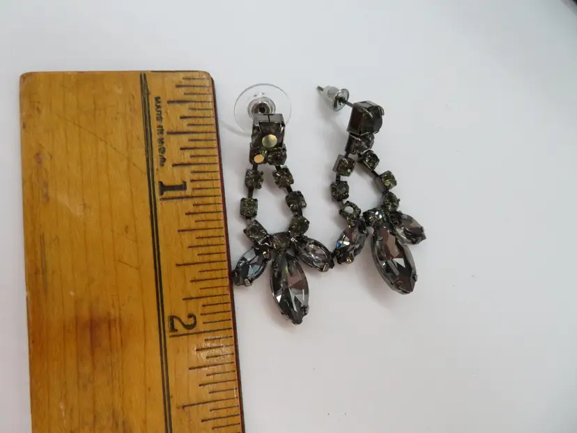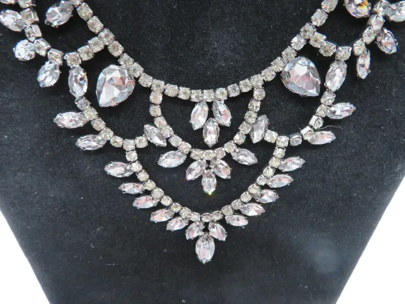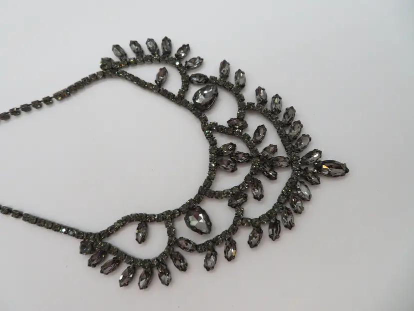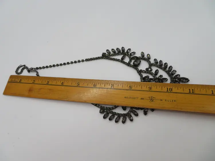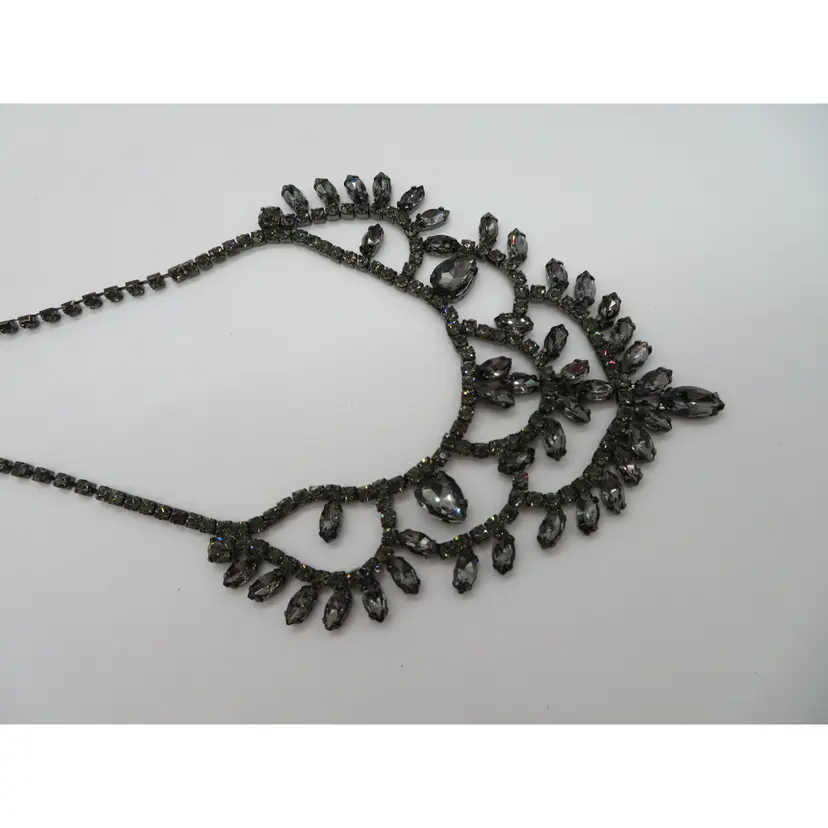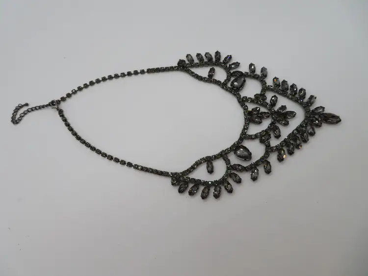 Item Description: For your consideration is a vintage 1990’s 3-piece set, Necklace and earring set done in black crystals. It is a single chain with a chandelier drop that falls nicely on the chest. It is unmarked.