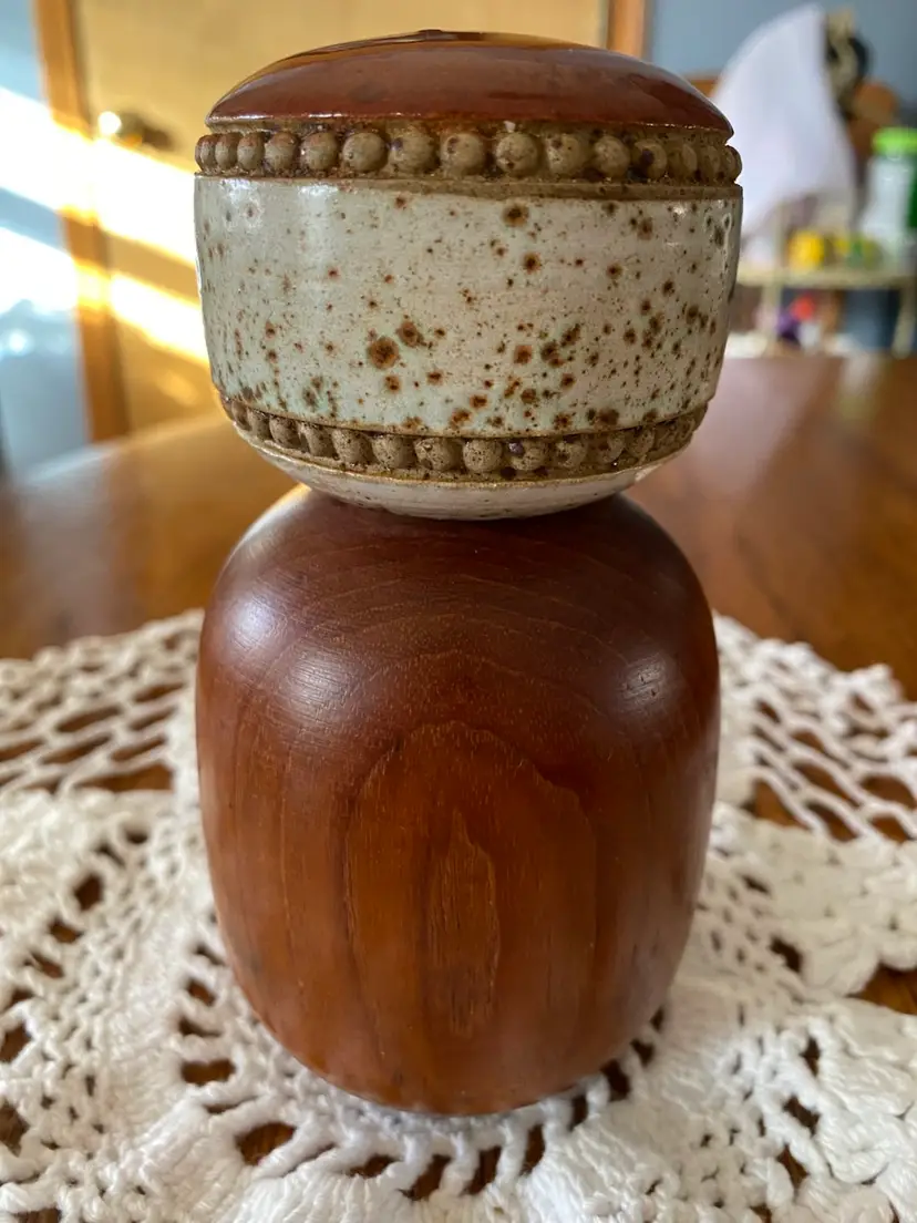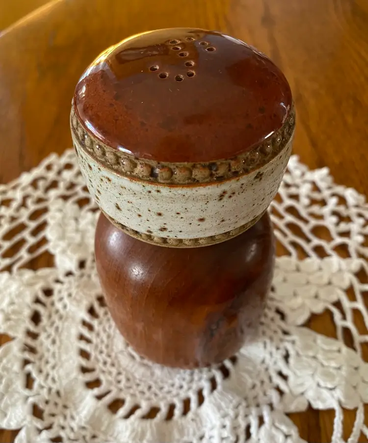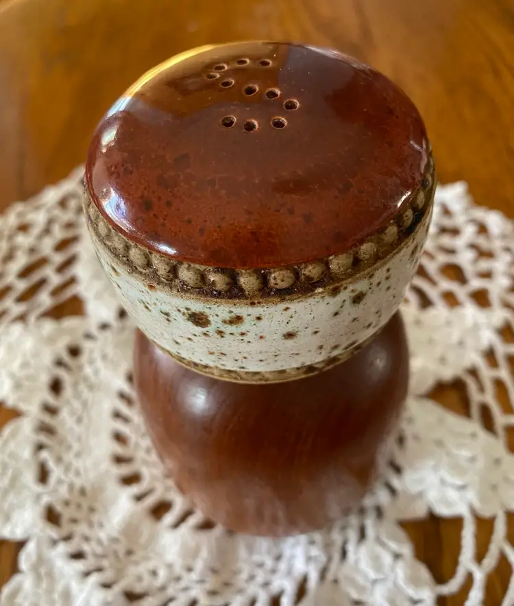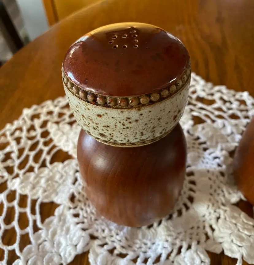 Beautiful Denby teak wood and pottery salt & pepper shakers. These are in very nice vintage condition. One of the stoppers has been replaced with a cork but it is still functional.