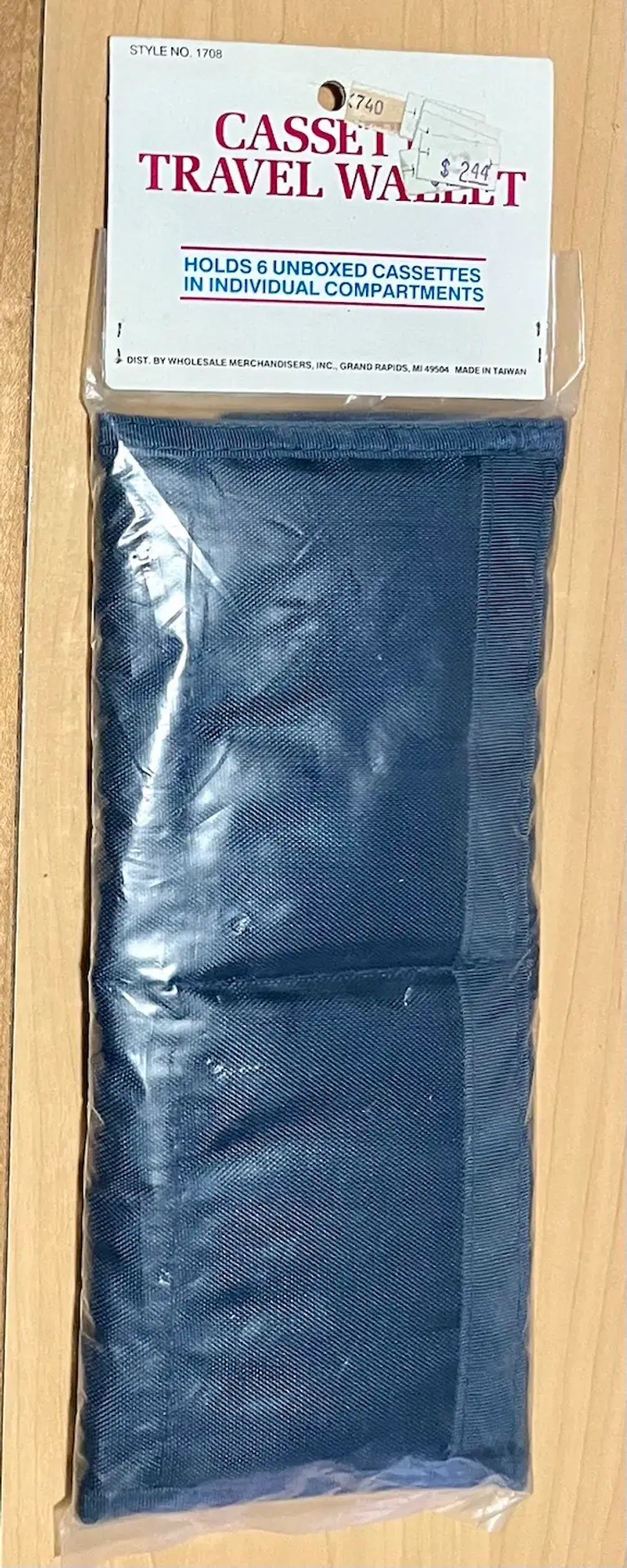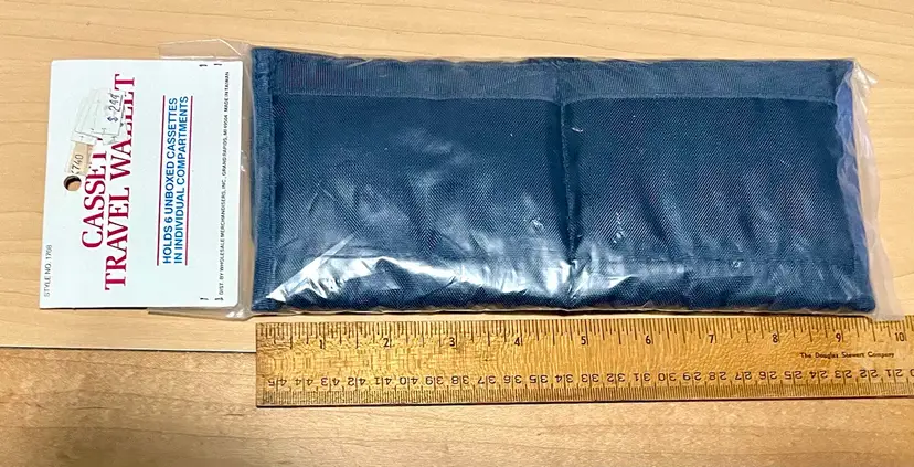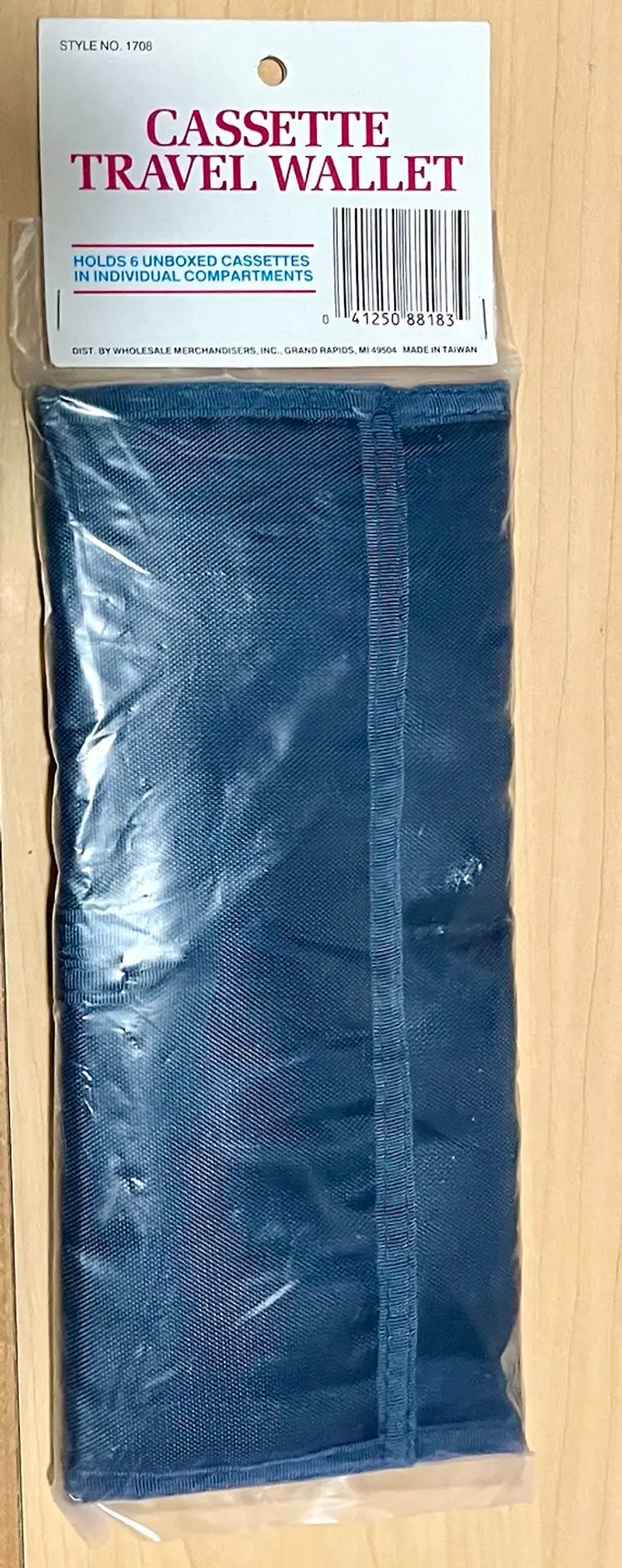 This vintage cassette tape wallet by Wholesale Merchandiser, Inc. is designed to hold up to 6 individual unboxed cassettes in its durable synthetic fabric compartments. The black-blue soft-sided travel wallet is manufactured in Taiwan and is perfect for storing and organizing your old audio cassette tapes while on the go. With its compact capacity and sturdy construction, this product provides a convenient and stylish way to transport your cassette tape collection.