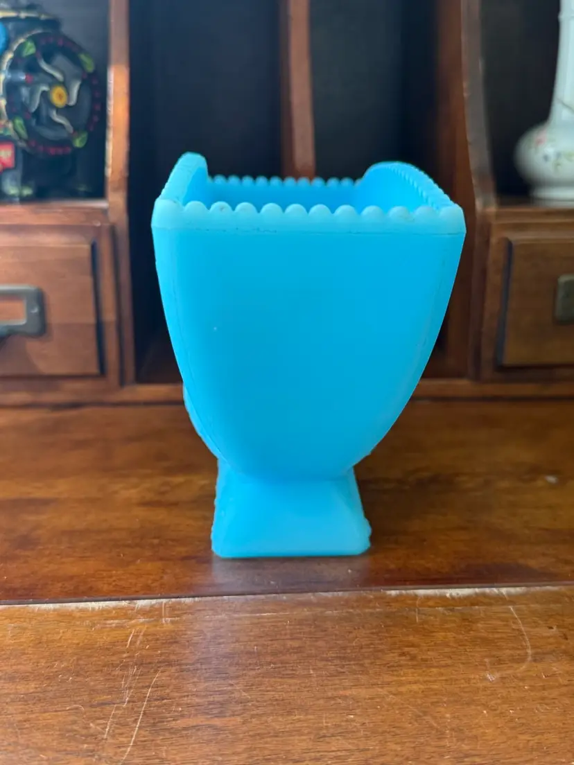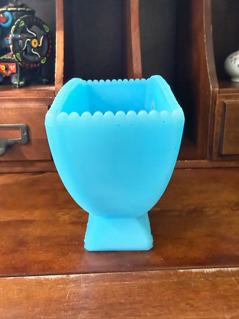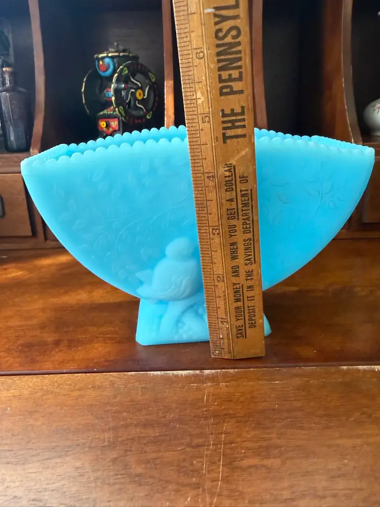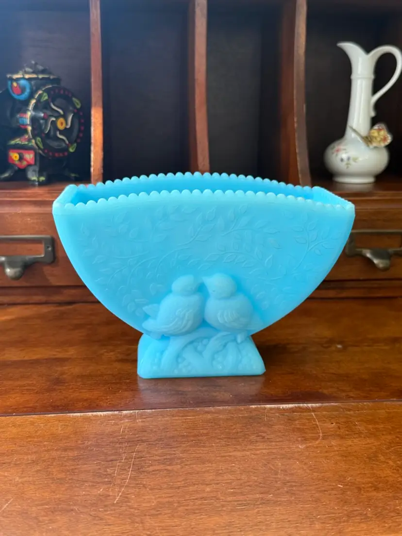 • Vintage Fenton blue satin glass planter • Embossed lovebirds on a leafy branch motif • Scalloped / ruffled rim with soft satin finish • Retains original Fenton foil sticker • Impressed Fenton mark on the bottom • Measures approx. 4 3/4” x 6 1/2” x 2 3/4” • Beautiful color, crisp embossing, and smooth satin texture • No chips or cracks noted • Ideal for collectors of Fenton Art Glass, satin glass, or bird‑themed décor • Lovely for display, vanity organization, faux florals, or shelf styling