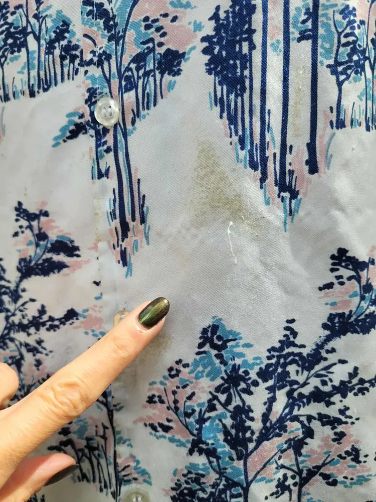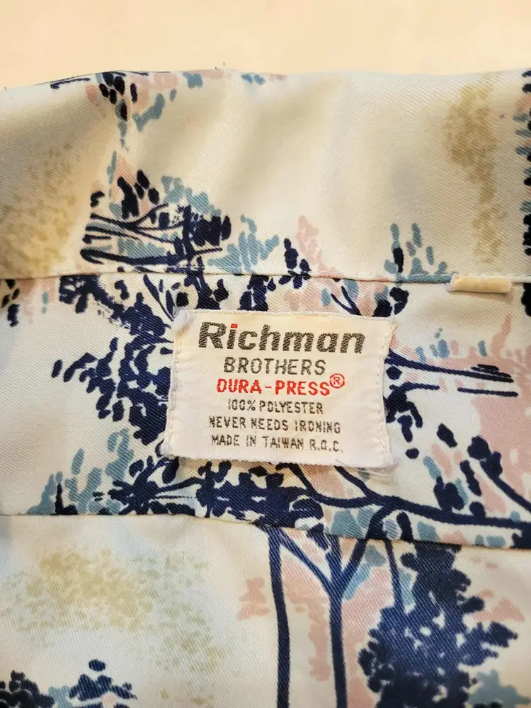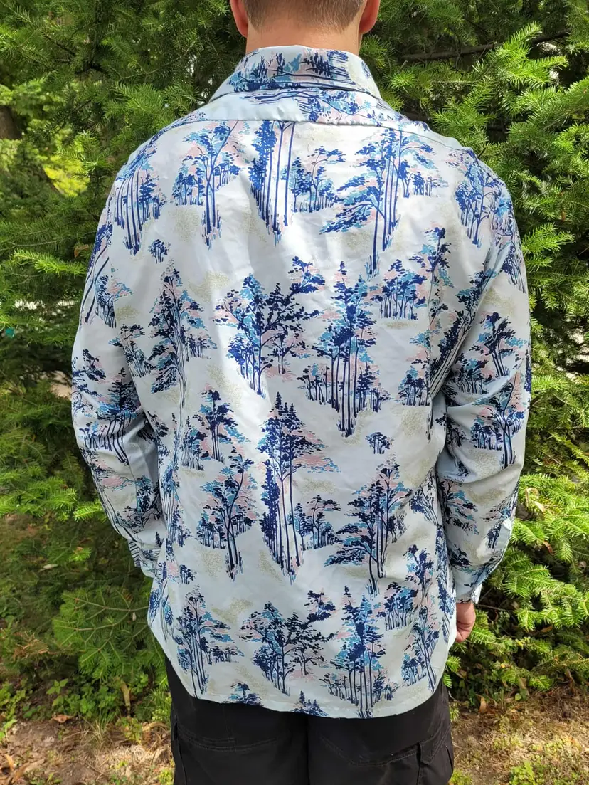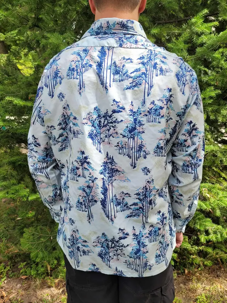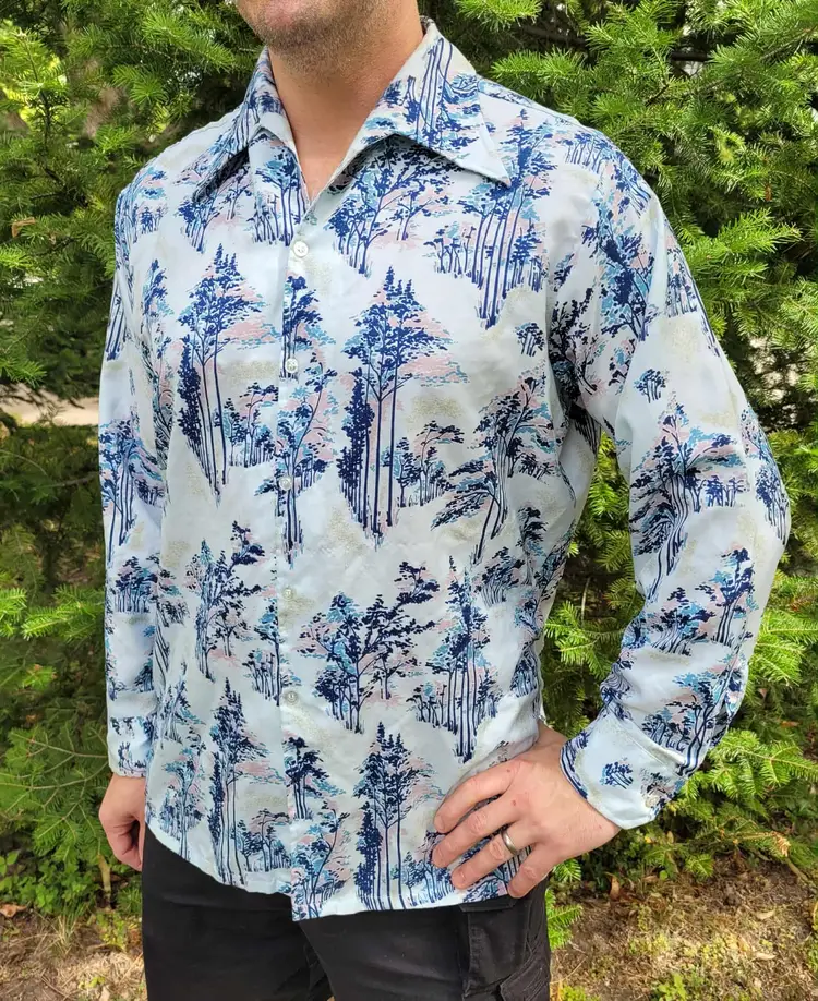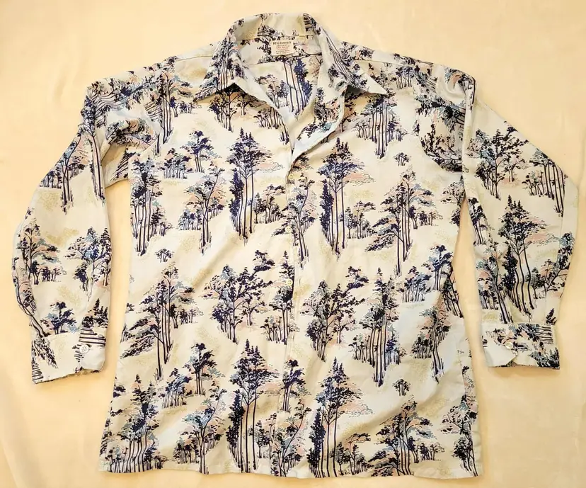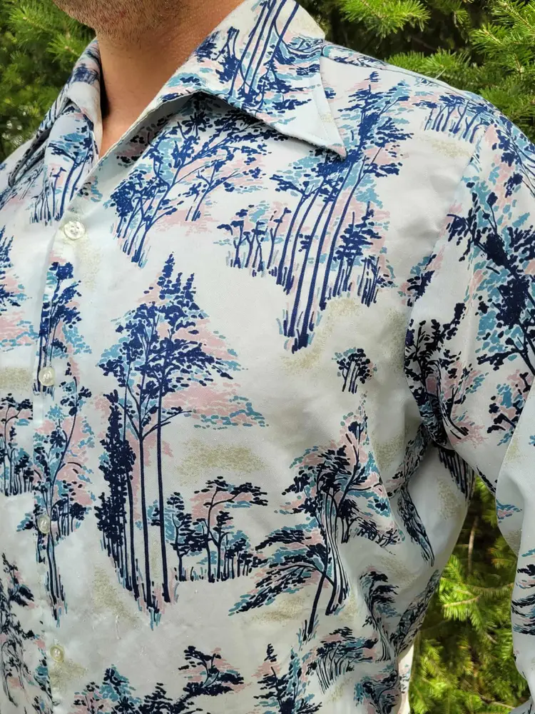 Groovy blue & pink tree pattern fitted men's button down! This is in good condition from an estate, with the only flaw being some snags in the fabric in one spot that I've pointed out in pictures. Please see pictures for details and see measurements below to ensure it'll fit you before purchasing.