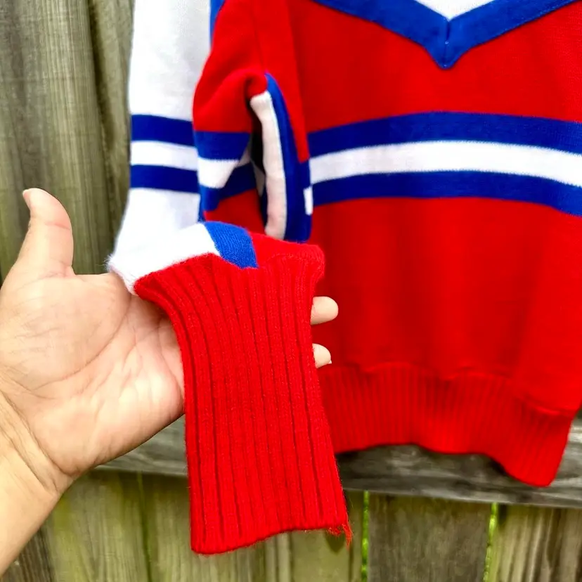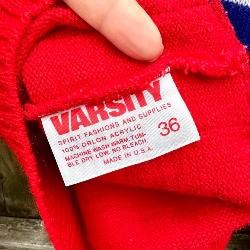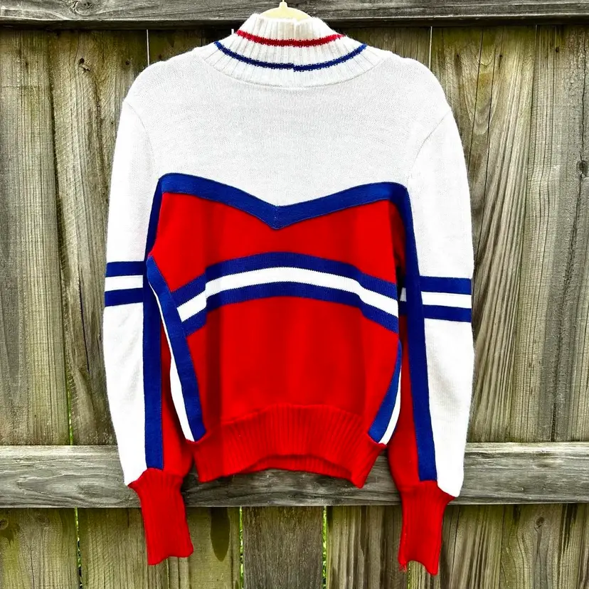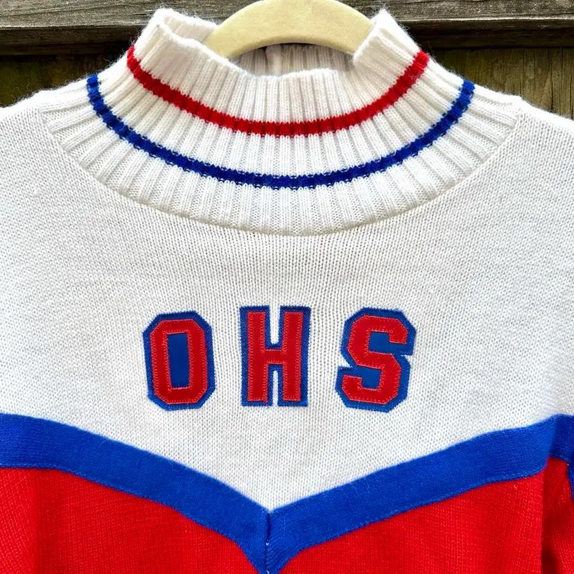This sweater is a vintage 1970s/1980s era Varsity cheerleading knit mock neck sweater in red, white, and blue colors. OHS embroidered on chest. Made of acrylic material in the United States, this original women's size medium sweater features a classic cheerleader look. The sweater has a chest size of 42 inches and a shoulder to hem length of 25 inches, making it a casual and nostalgic addition to any wardrobe.