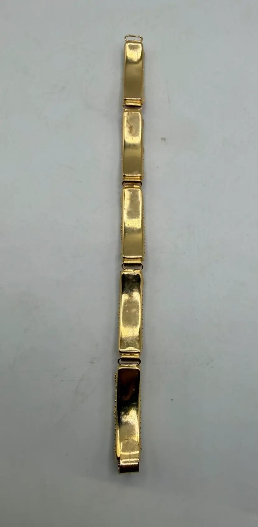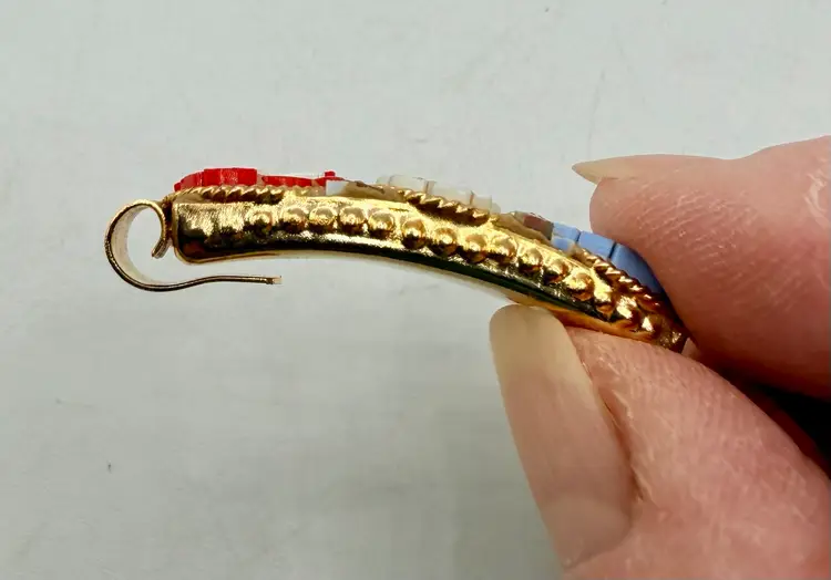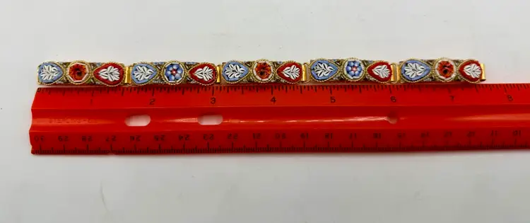 On each link, three individual glass designs each outlined in ultra-thin gold plated filigree trim (duplicated on each link) created using micro mosaic millefiori glass technique in shades of oranges, blues, greens, whites. (Micro mosaic millefiori means using tiny fragments of glass called "tesserae" to create an intricate mosaic pattern). Back: Gold plated Sides: Gold "dotted" filigree pattern No markings or ID