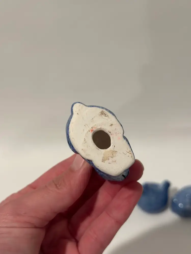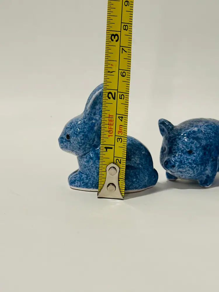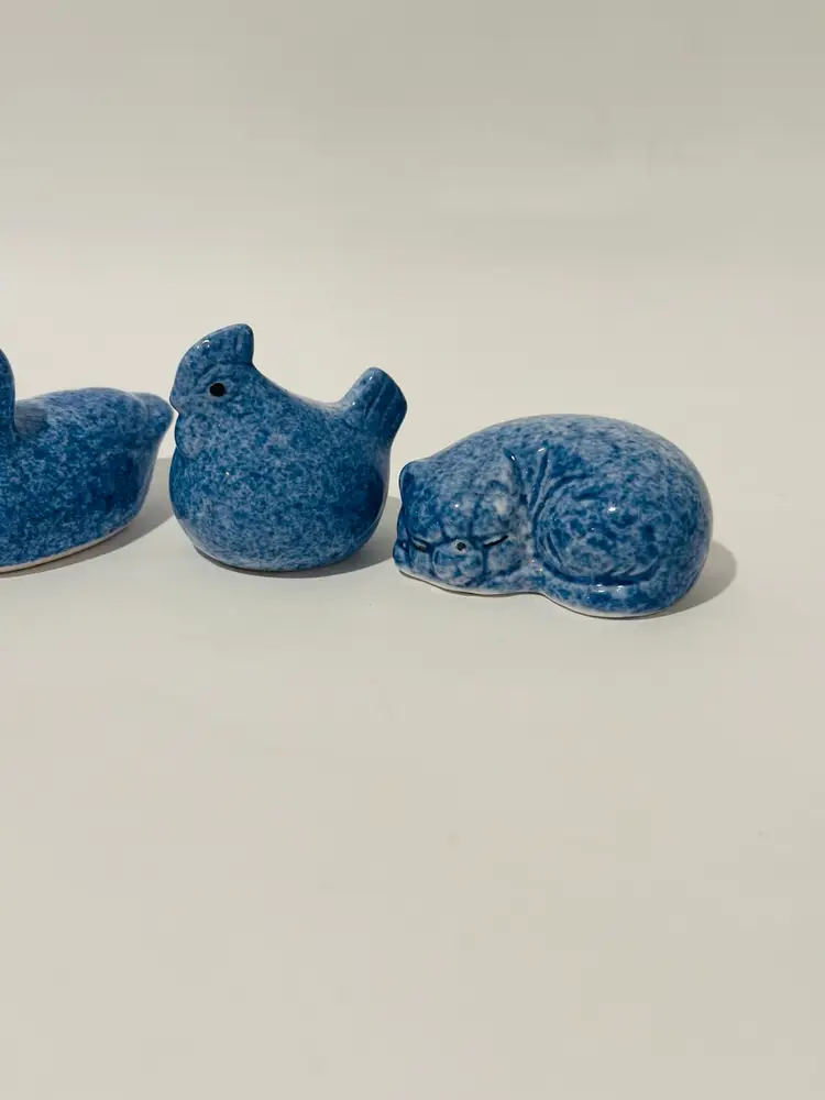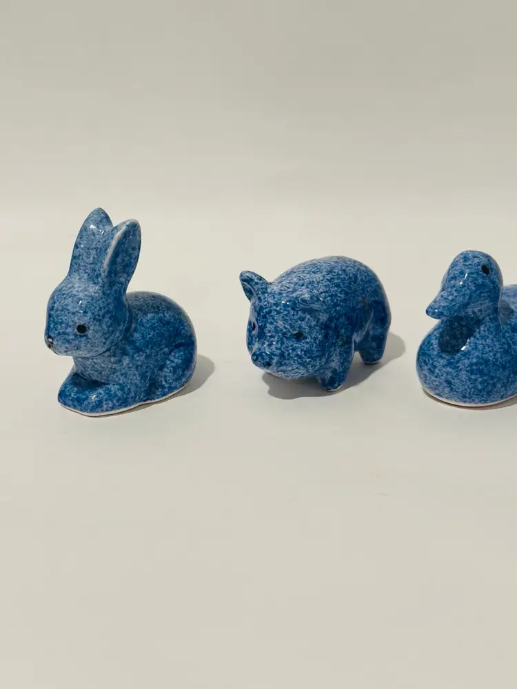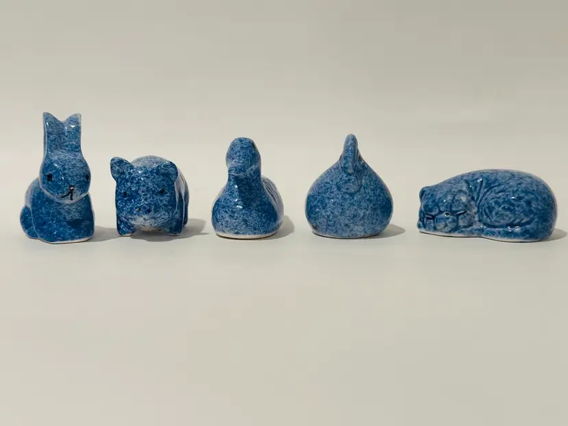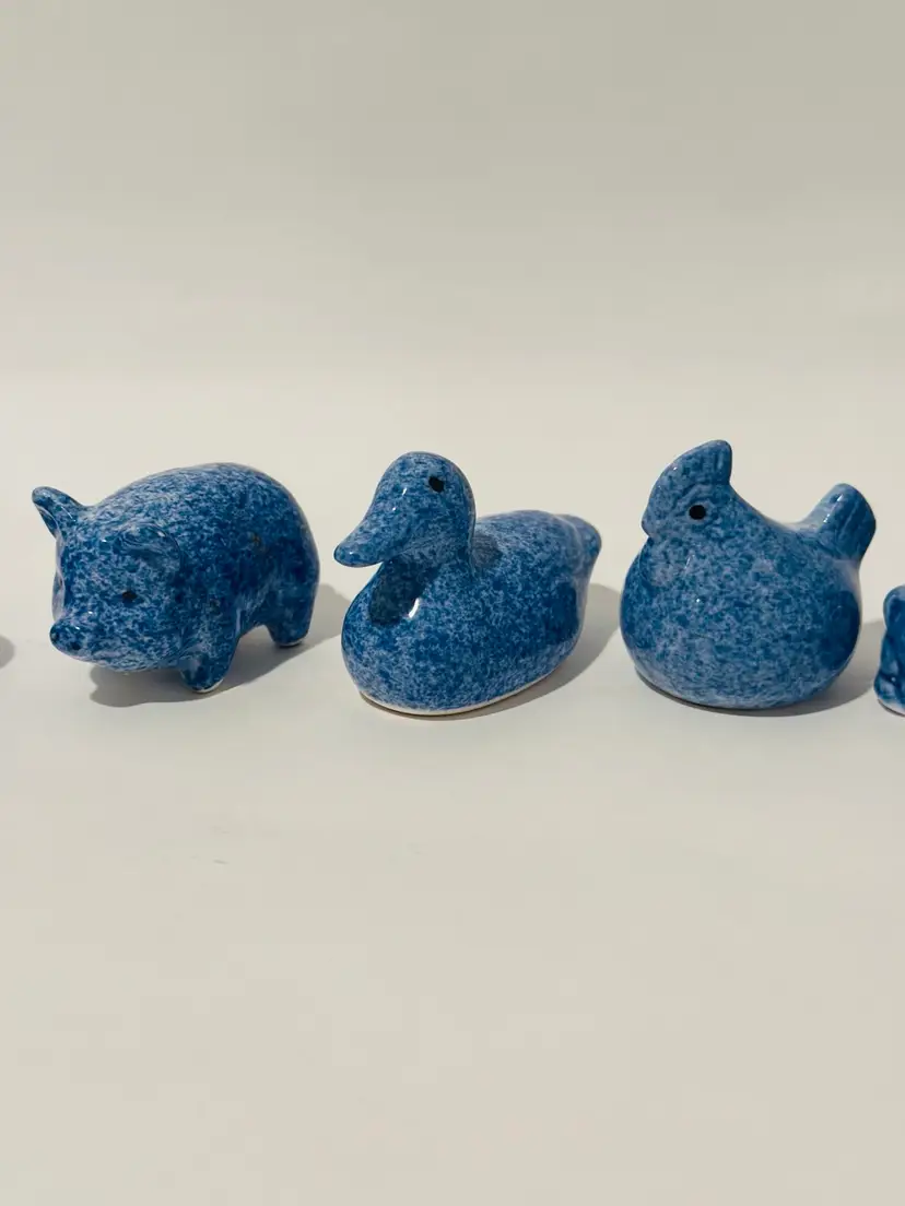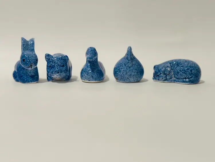 This vintage set of five Enesco miniature figurines is perfect for collectors and animal lovers alike. The set includes a cat, duck, chicken, bunny, and pig, all made of ceramic and porcelain with a beautiful blue spongeware pattern.