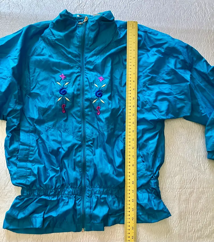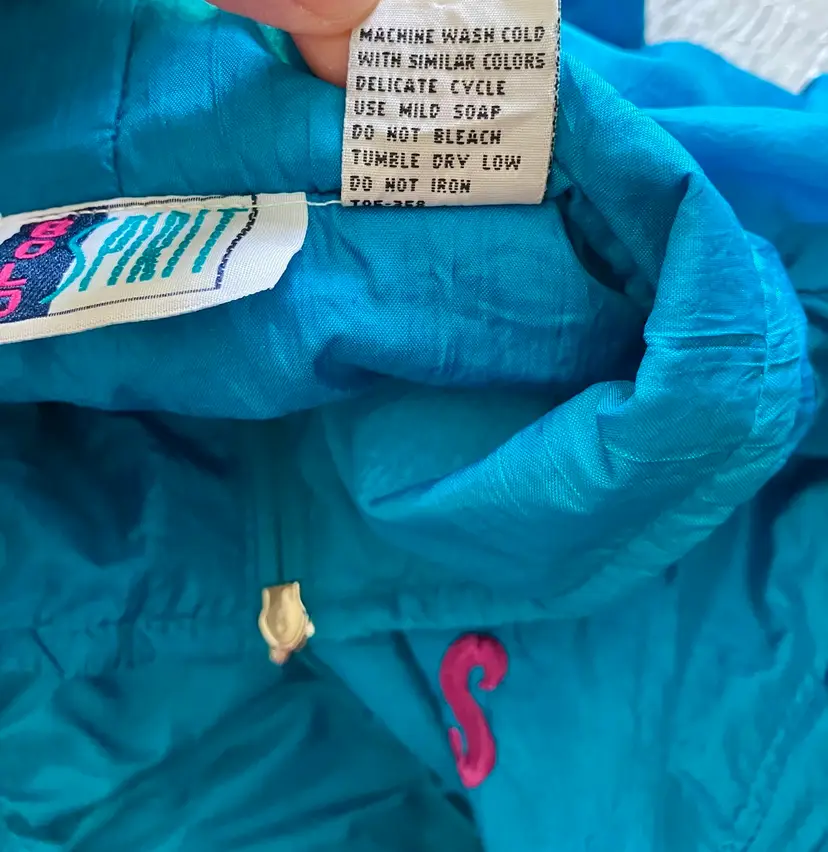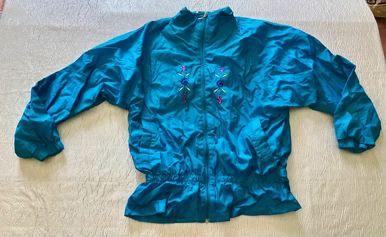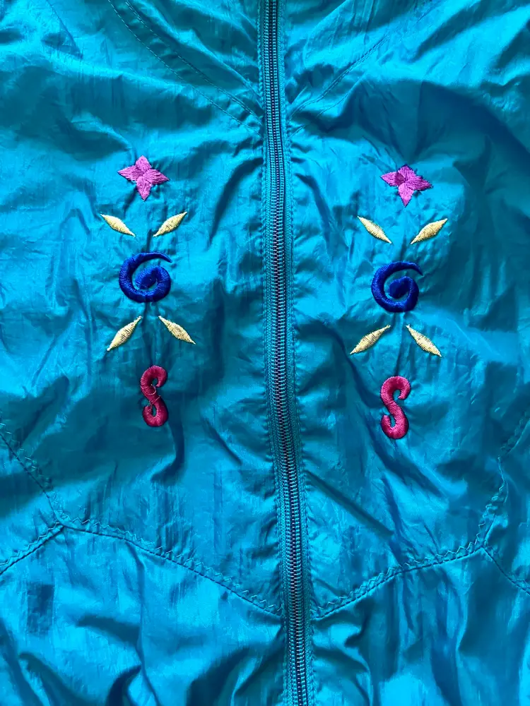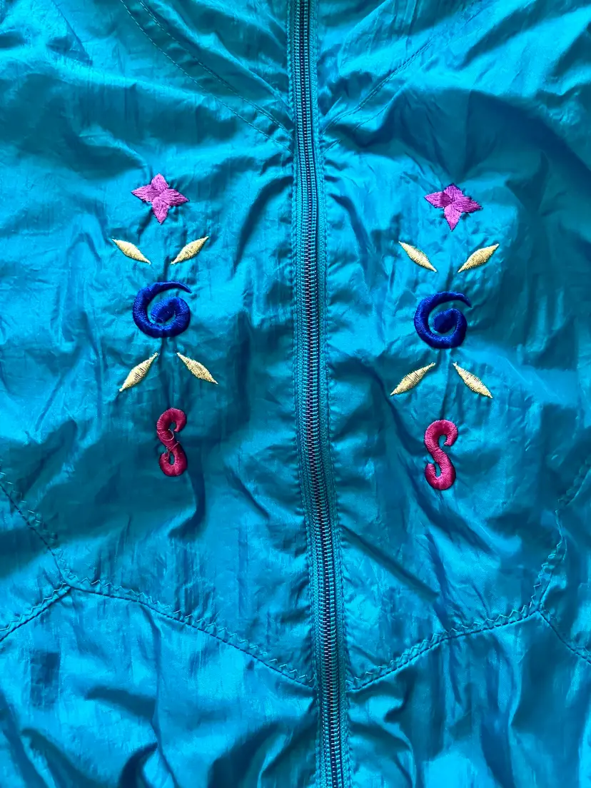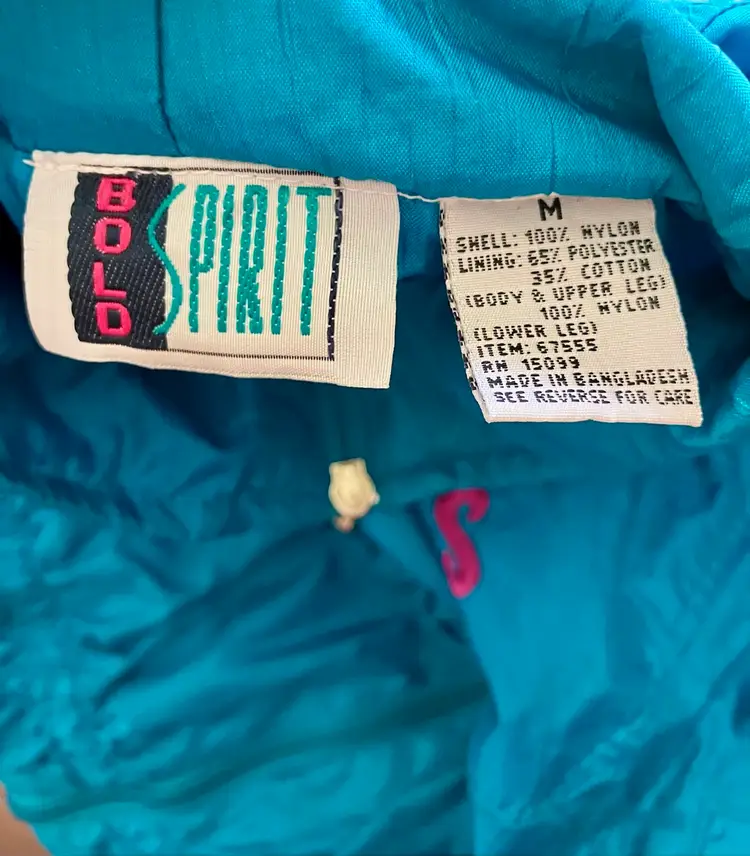 This vintage Bold Spirit track suit jacket is a statement piece for any casual day activity. The teal color with hot pink, purple, and gold embroidered accents/details adds a pop of color to your wardrobe. The jacket is made of mixed materials, and the size is approximately M with a chest size of 42" and waist size of 31". The shoulder to hem length is approximately 24.5". Shell material: 100% Nylon / Lining: 65% Polyester and 35% Cotton