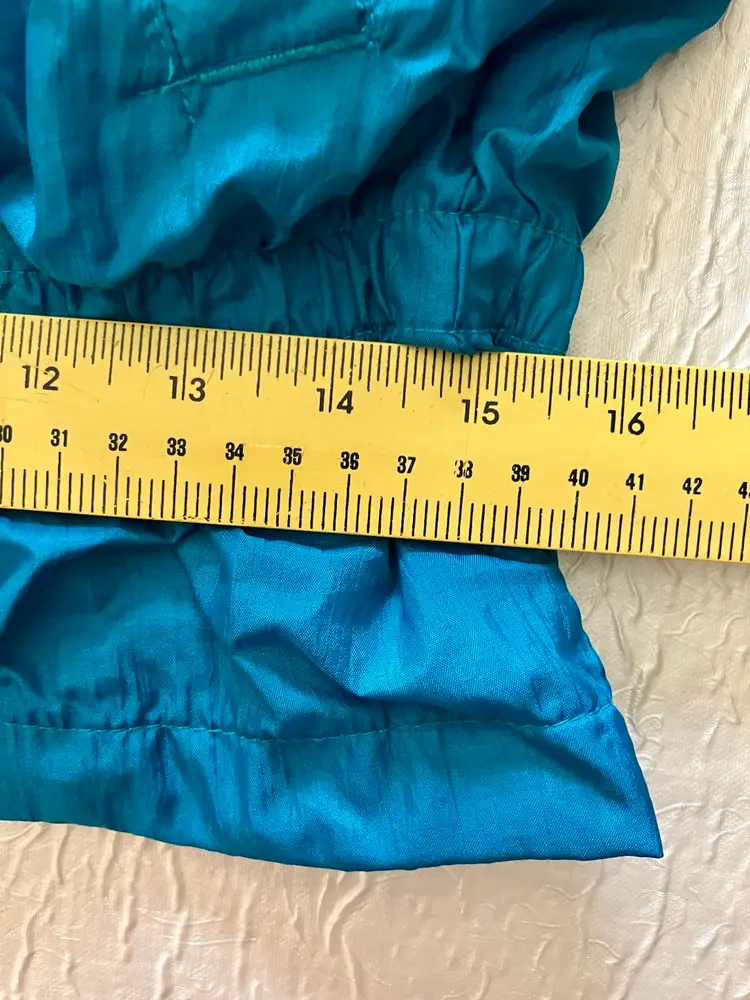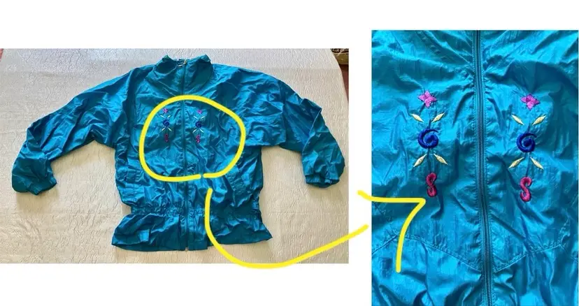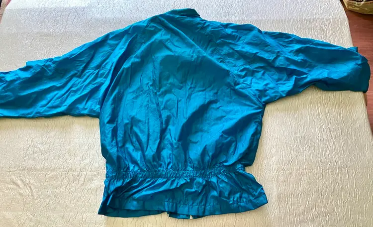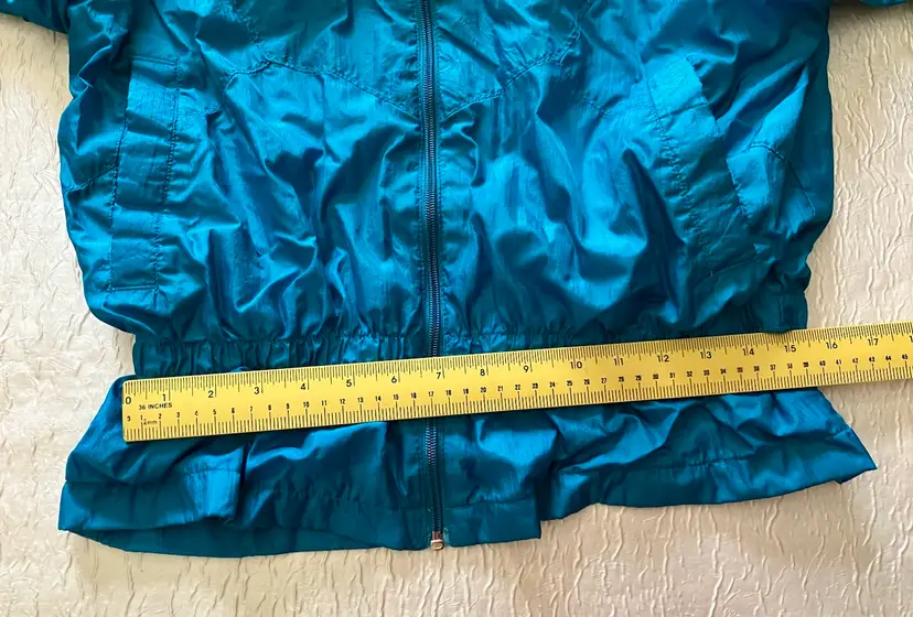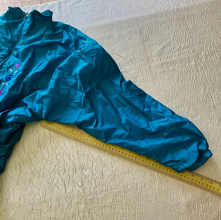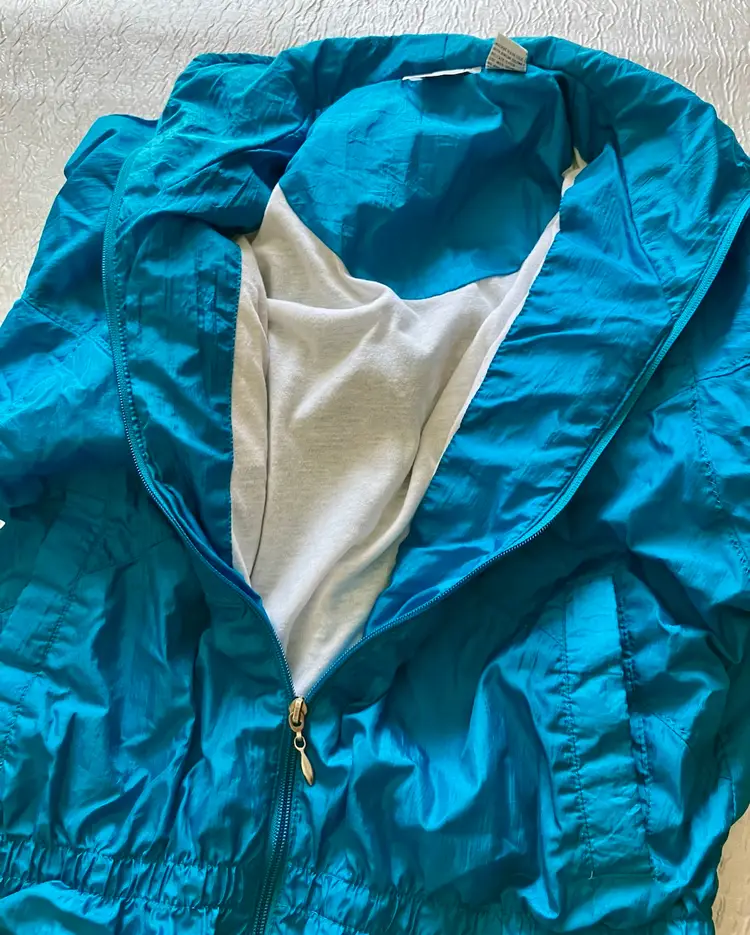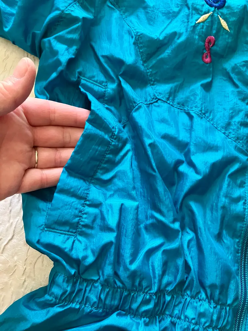 This vintage Bold Spirit track suit jacket is a statement piece for any casual day activity. The teal color with hot pink, purple, and gold embroidered accents/details adds a pop of color to your wardrobe. The jacket is made of mixed materials, and the size is approximately M with a chest size of 42" and waist size of 31". The shoulder to hem length is approximately 24.5". Shell material: 100% Nylon / Lining: 65% Polyester and 35% Cotton
