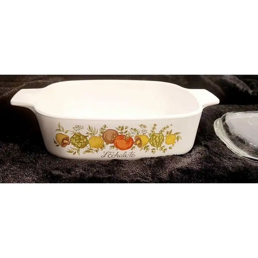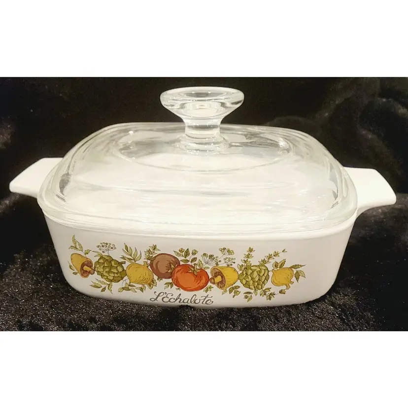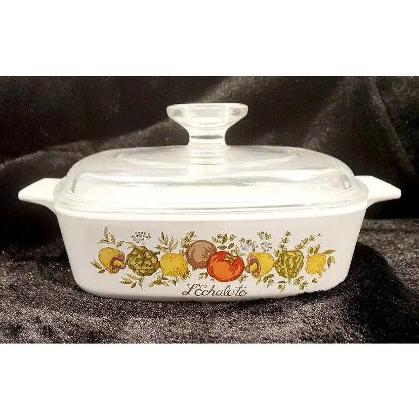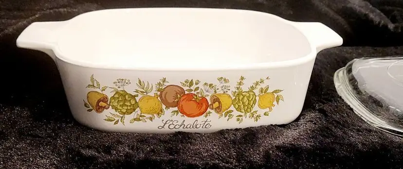 The Spice of Life pattern has wonderful tomatoes, mushrooms, artichokes, peppers and spices in a bright pattern on 2 sides of the casserole dishes. Most are also inscribed with phrases in French, like these ( L’Echalote ). These casseroles have been discontinued / retired, and are now a collectible and classic cookware, and they are Microwave, Oven (Electric and Gas) and Dishwasher safe. They are very durable and will make a beautiful addition to any kitchen – they are perfect for serving your favorite dishes to family and friends!