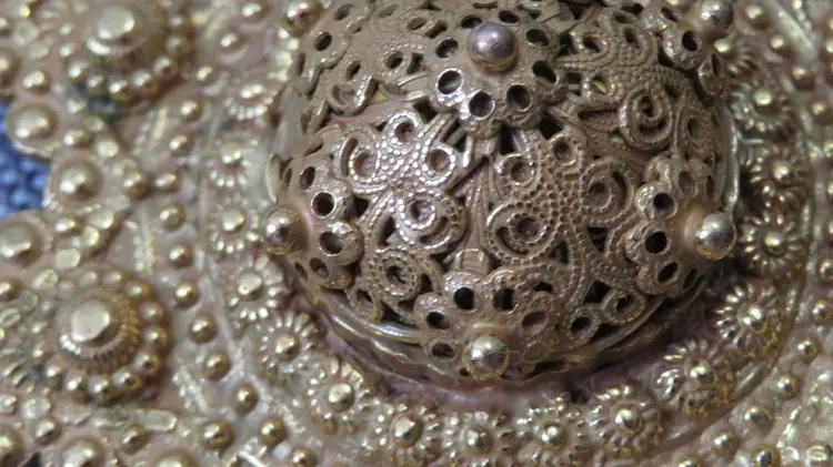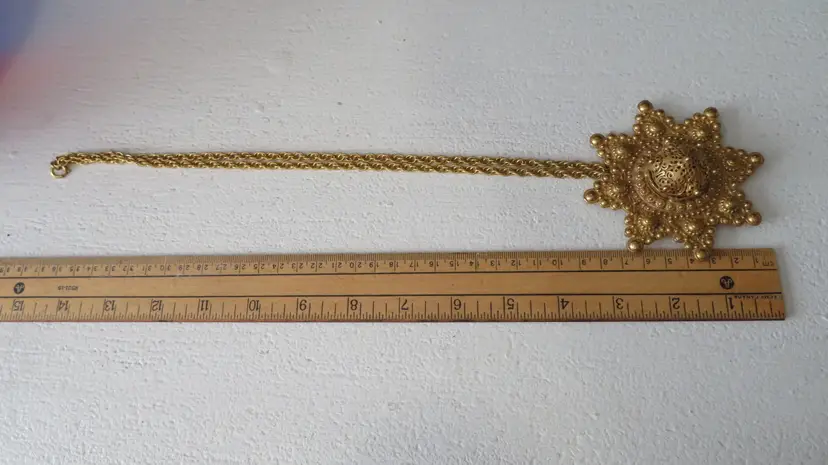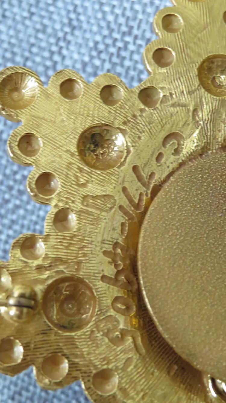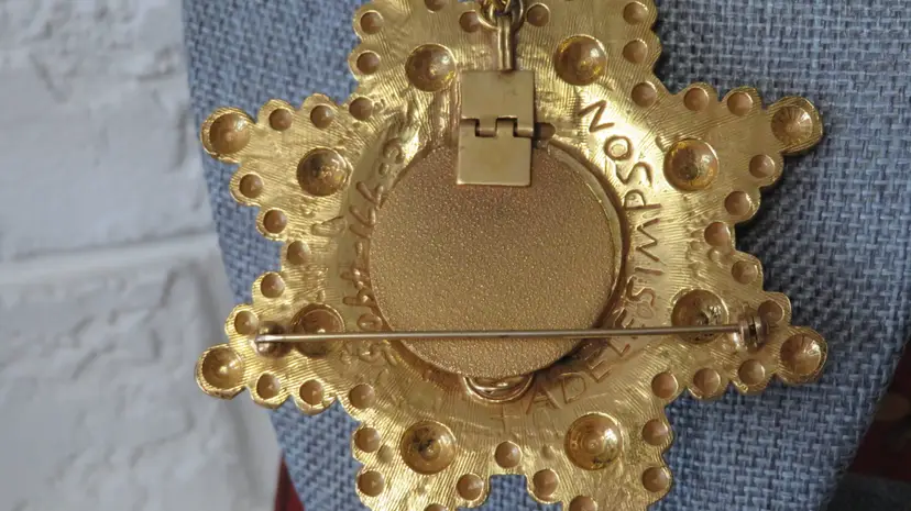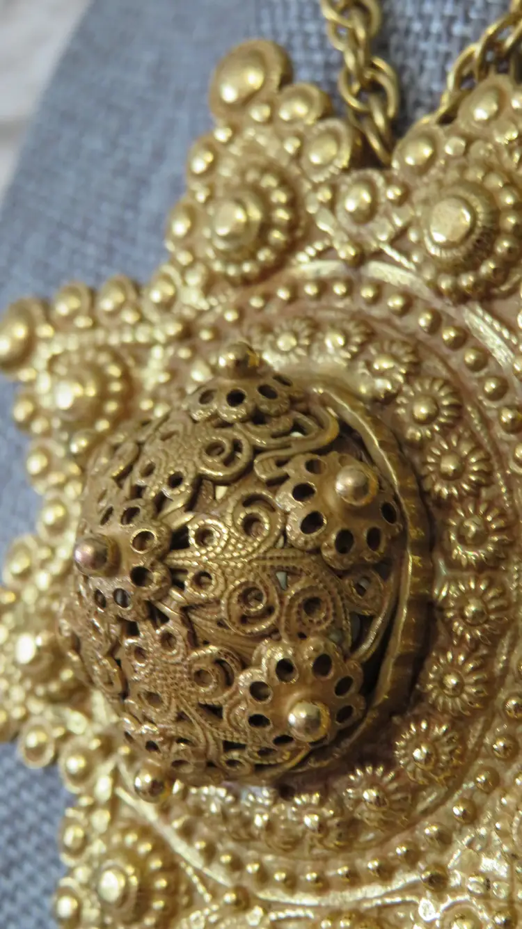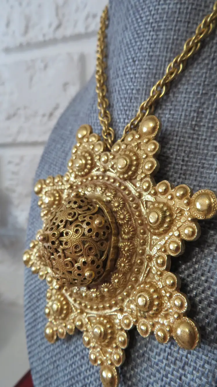 Elevate your accessory collection with the vintage Adele Simpson large statement necklace. Exuding elegance, this rare piece showcases a stunning gold color that gracefully complements any outfit. The unique necklace is featured in a 1997 book by Cherri Simonds. The chain adds a touch of sophistication and ensures that this necklace will stand out in your collection. The pendant can become a brooch and the back can open to add a scented cotton ball that will carry your favorite fragrance with you all day. Crafted with care, this necklace reflects the distinguished style of its brand, Rare, and is designed to make a statement. Whether you're accessorizing for a special event or adding a touch of luxury to your everyday wear, this Adele Simpson necklace is an exquisite choice that promises to enhance your look