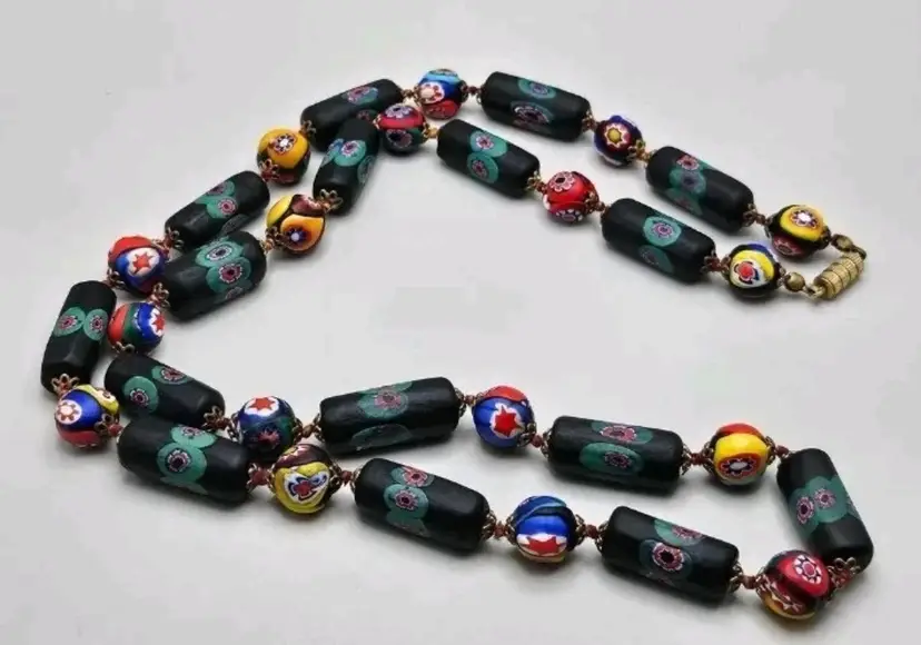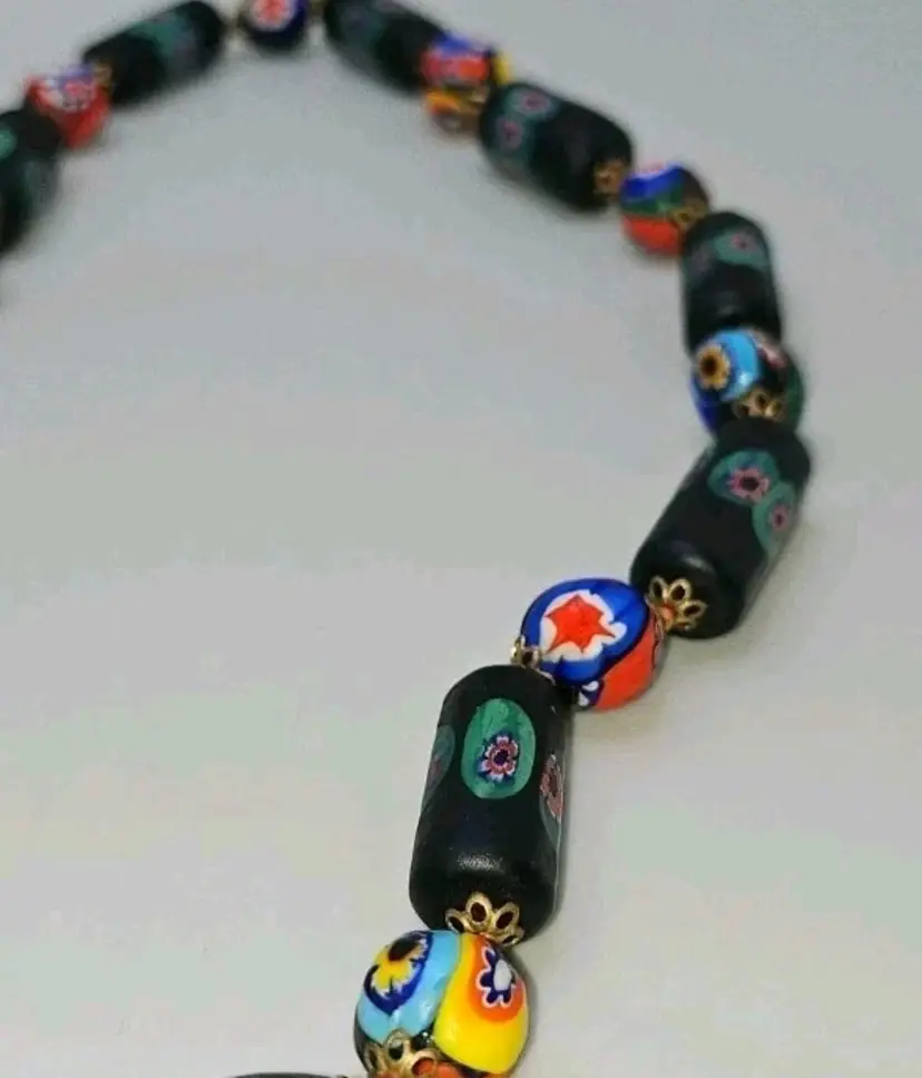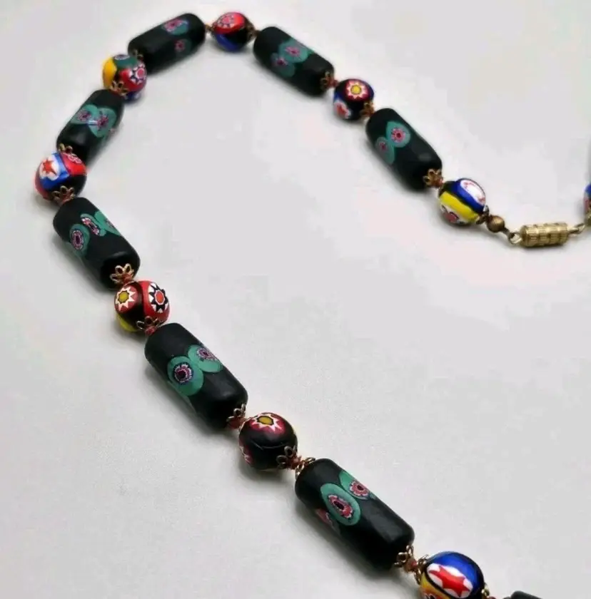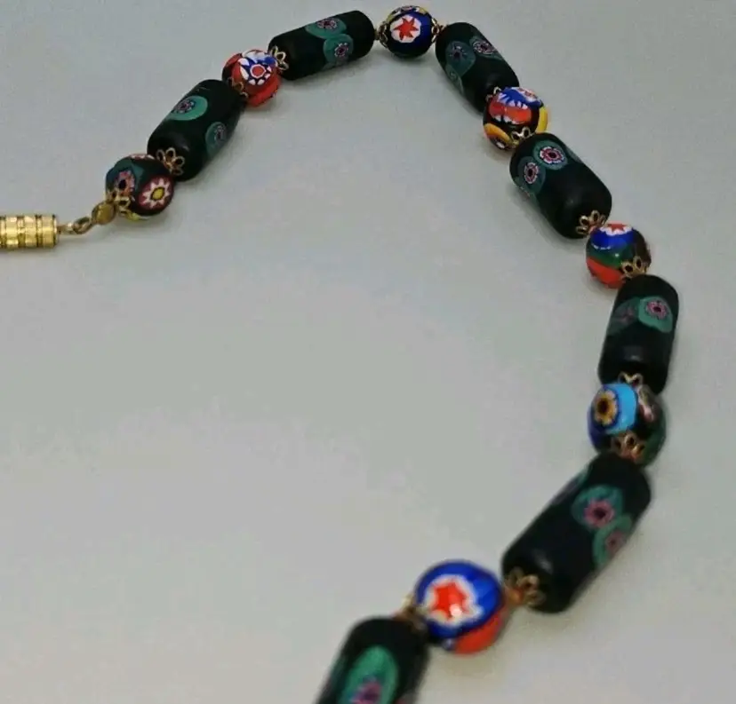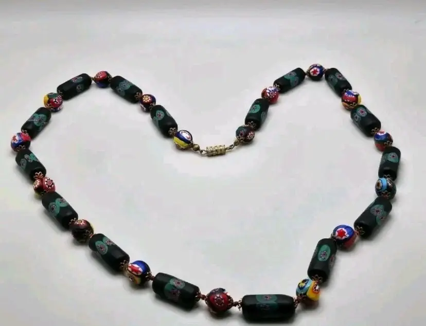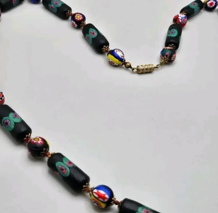 30" long vintage murano satin frosted matte millefiori murrine cut cane large rectangle and small round beads with barrel clasp. Each is hand tied with a small floral like gold tone/brass accents between. Item is in used, vintage condition showing minor signs of use. Note has one chipped round bead at the bottom, middle. Necklace is quite heavy for what it is. The main color is black glass with shades of greens, reds, oranges, and yellows. This is one of my favorites from my collection!