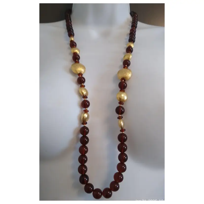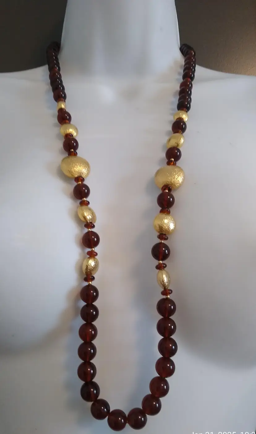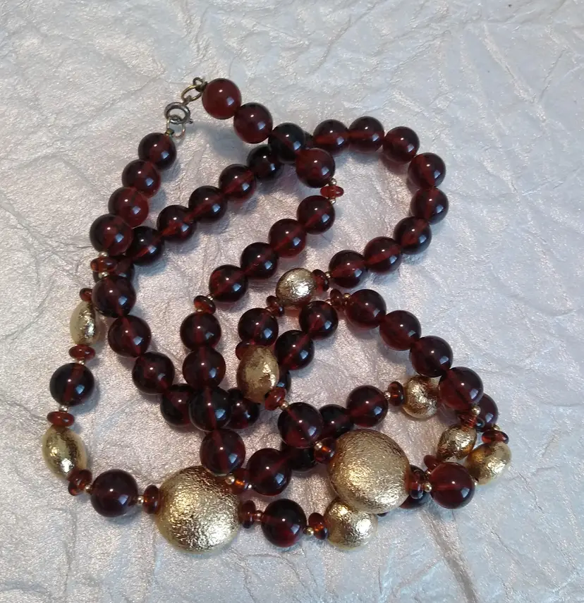 Elegant vintage necklace featuring rich clear root beer brown lucite beads paired with textured gold accents.