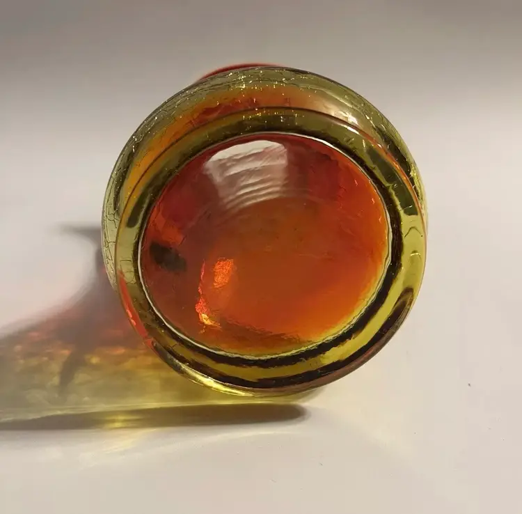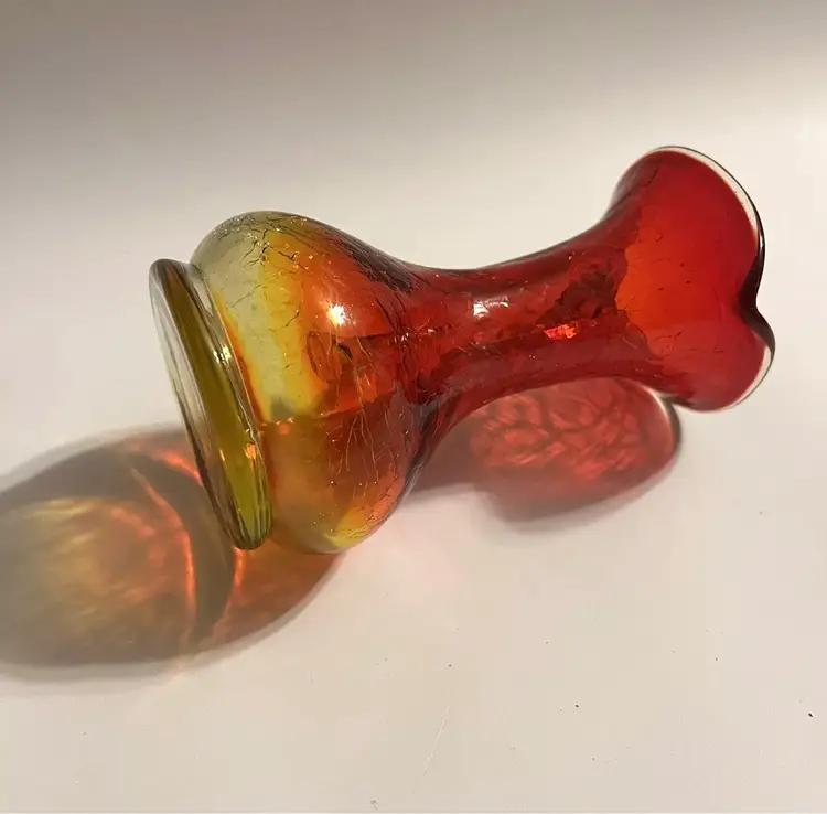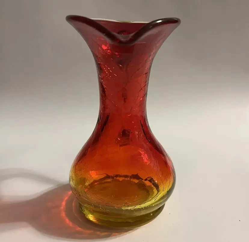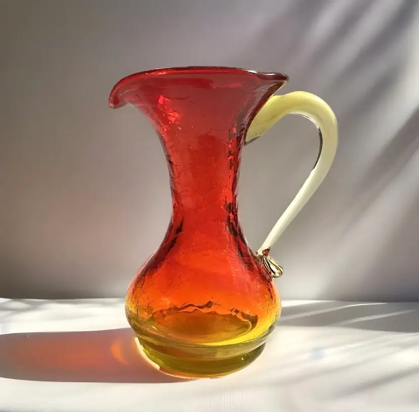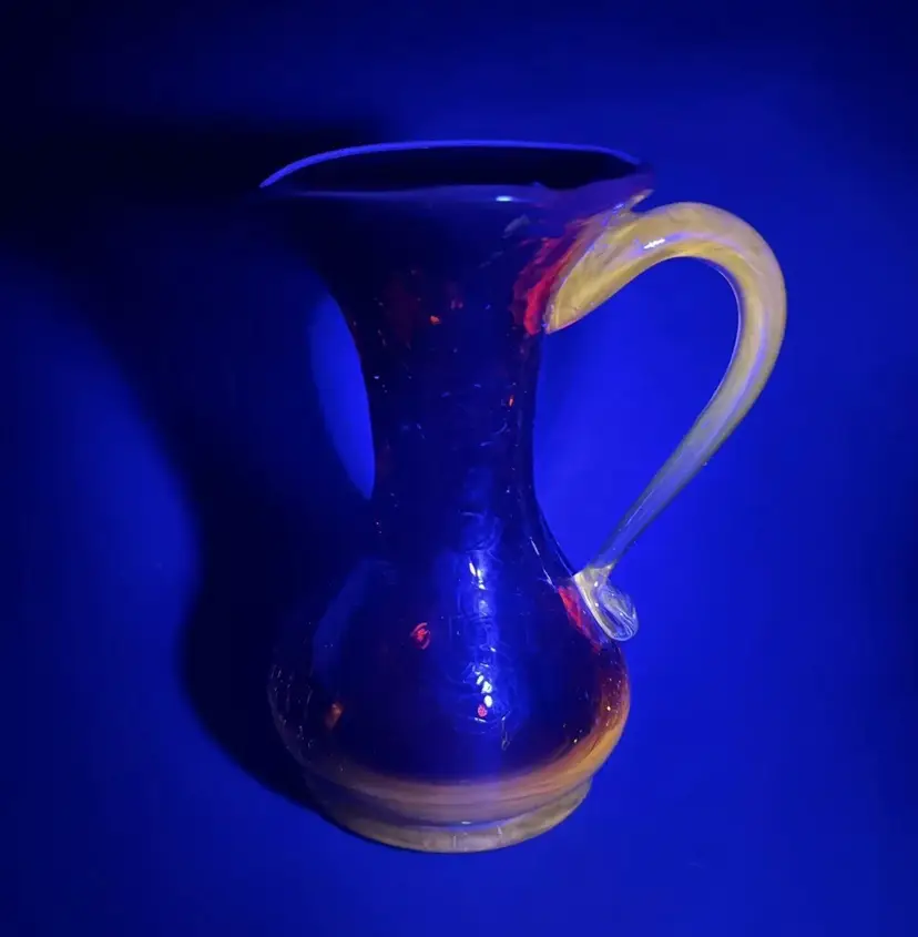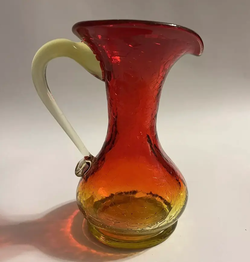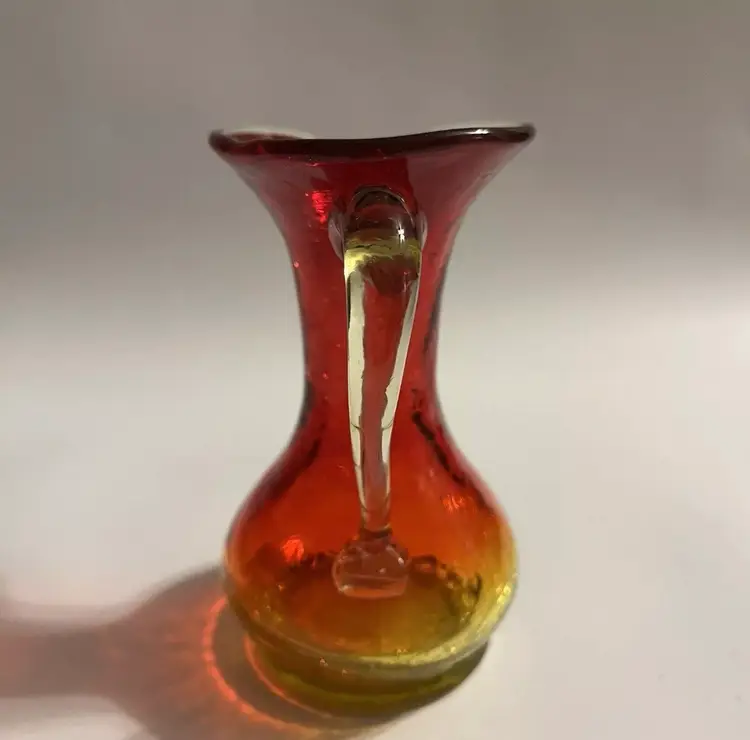 Cadmium Amberina Crackle Blown Glass Pitcher This 5" mini pitcher with applied handle fades from yellow base to red and has yellow applied handle. Measures 4" wide including the handle and spout and body diameter is 2.75" at widest points. The yellow portions are UV reactive and have a nice glow under black light. Excellent pre-owned. No chips, cracks or damage. SEE PHOTOS.