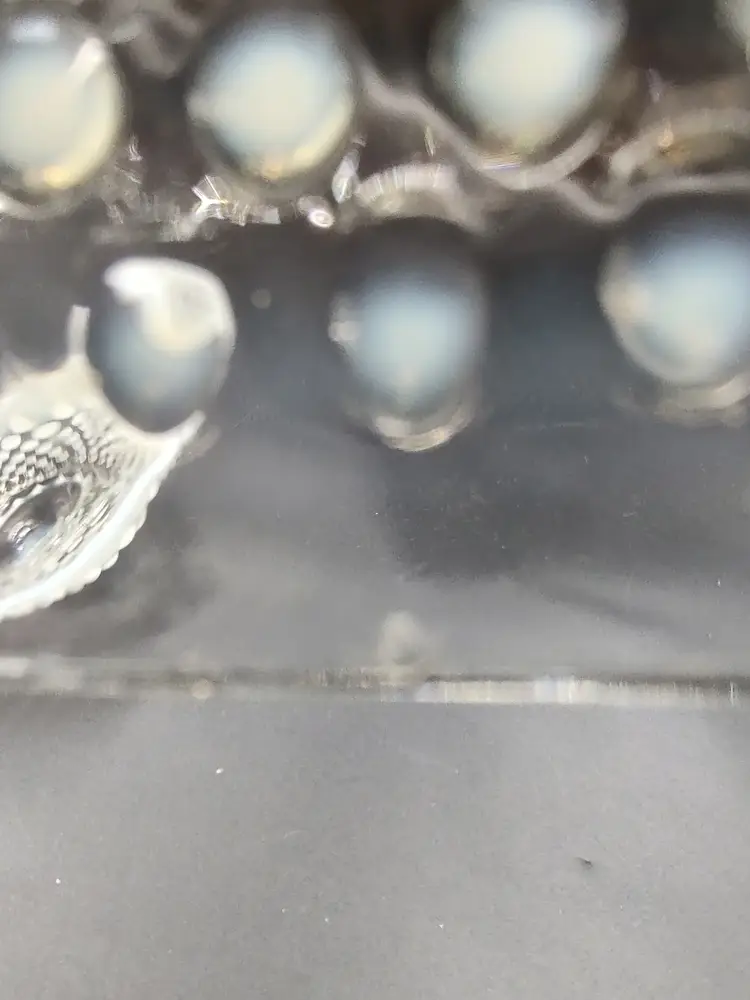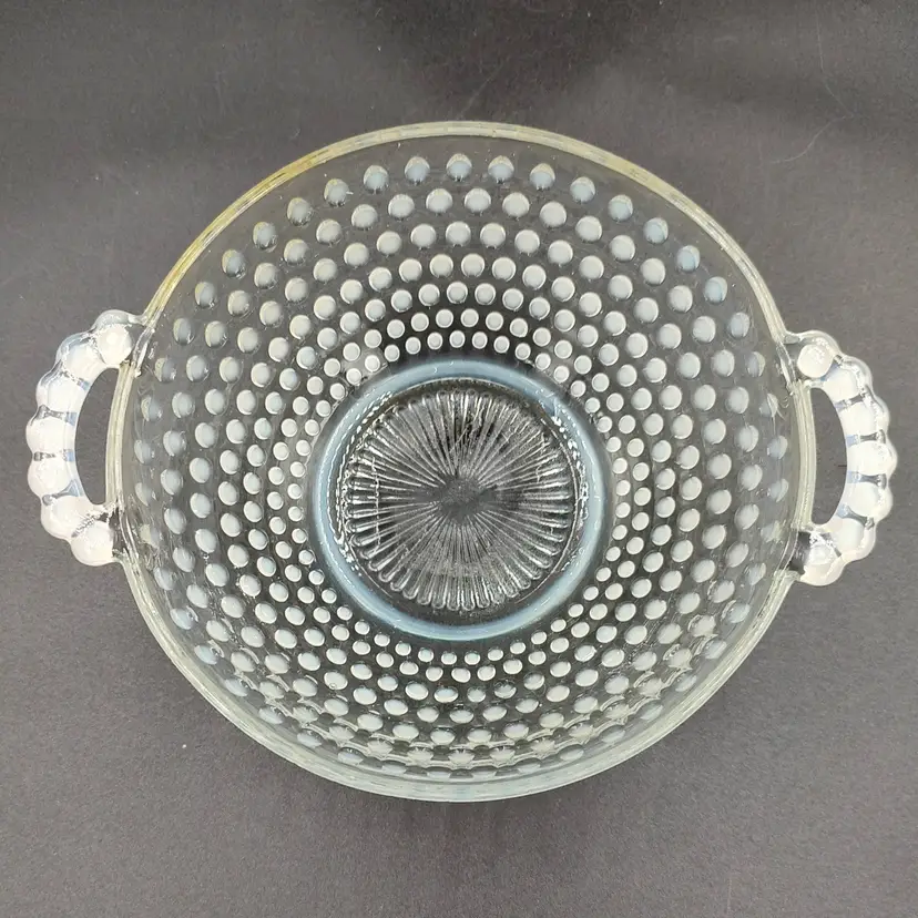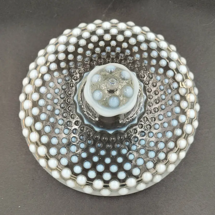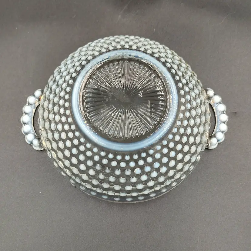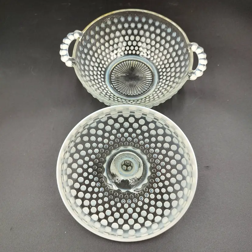 Vintage 1940-1950 Anchor And Hocking Moonstone Opalescent Hobnail Candy Dish With Lid and Handles. Height 4" x diameter 6". This item has two chips as shown in pictures. Made in the USA