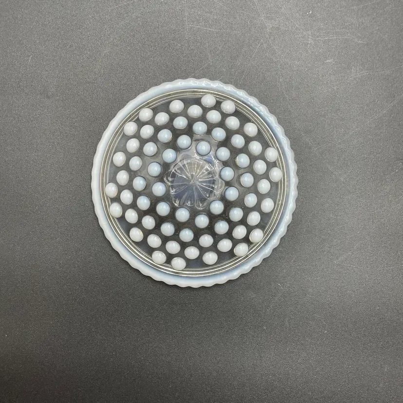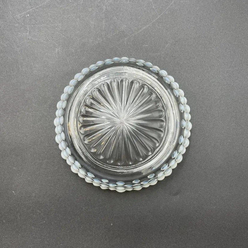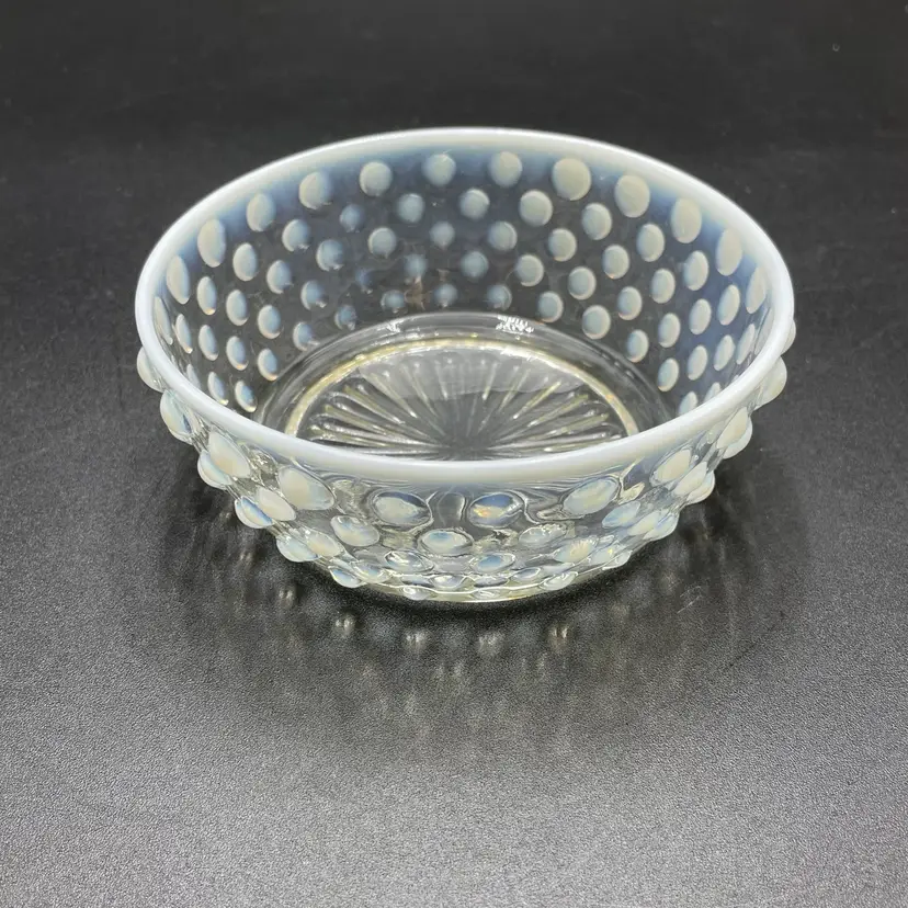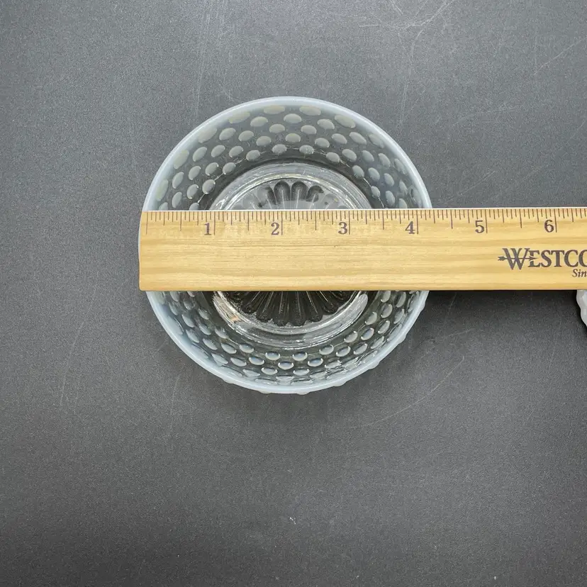 This is a vintage 1940s Anchor Hocking glass white opalescent moonstone lidded puff jar. Measures approximately 2.5" tall x 4" across the top. No chips or cracks. #BC