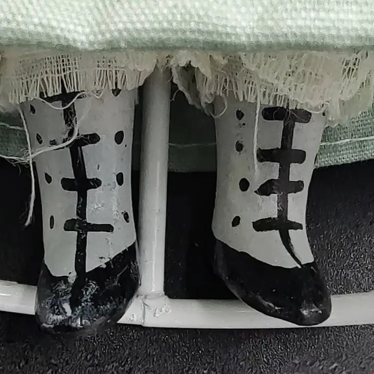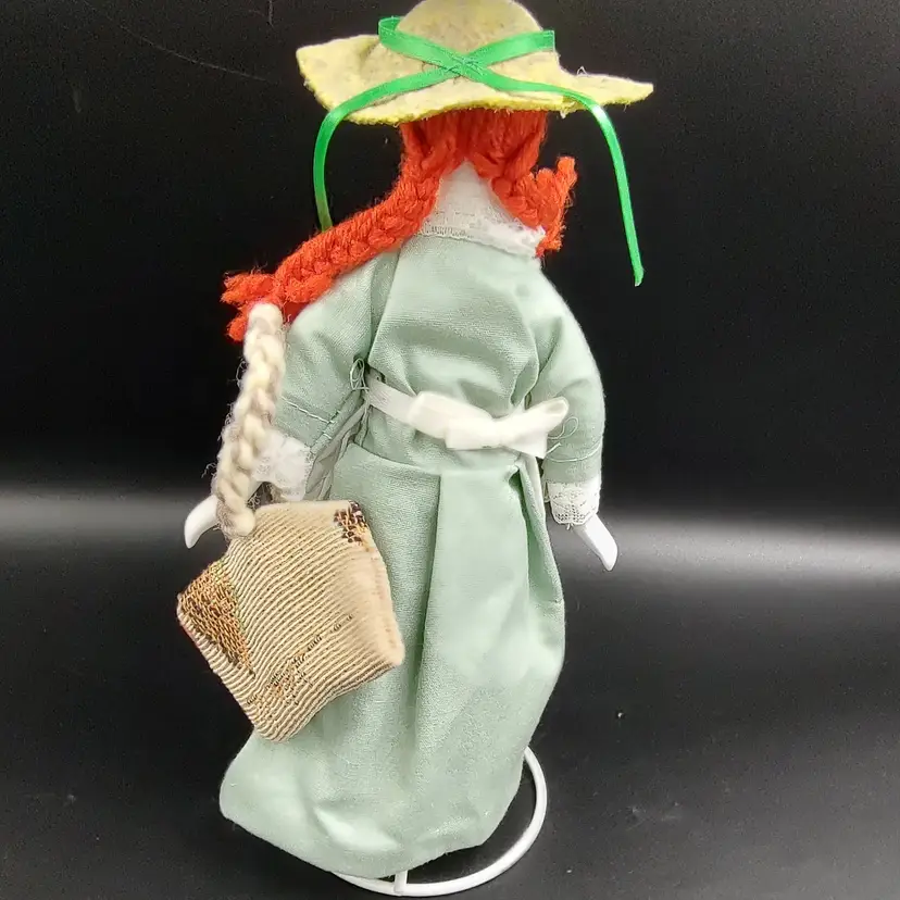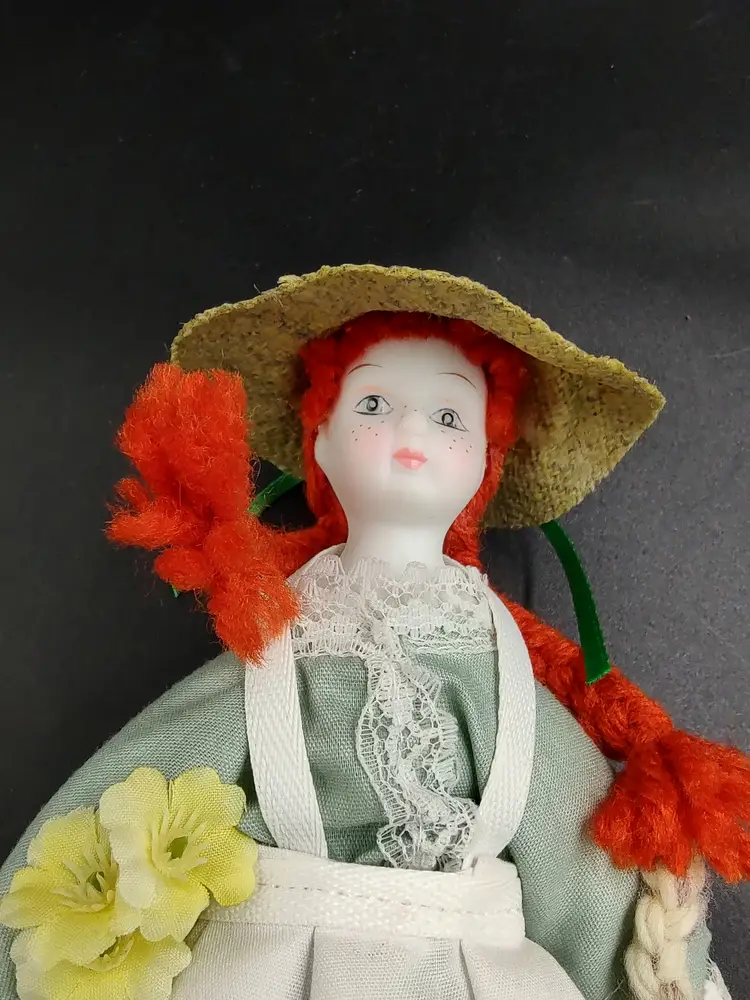Vintage 1990 Anna Of Green Gables Porcelain Doll soft body orange yarn hair green eyes. Comes with stand, apron, dress, bloomers, purse and hat. Height 8" x width 3". Made in Taiwan