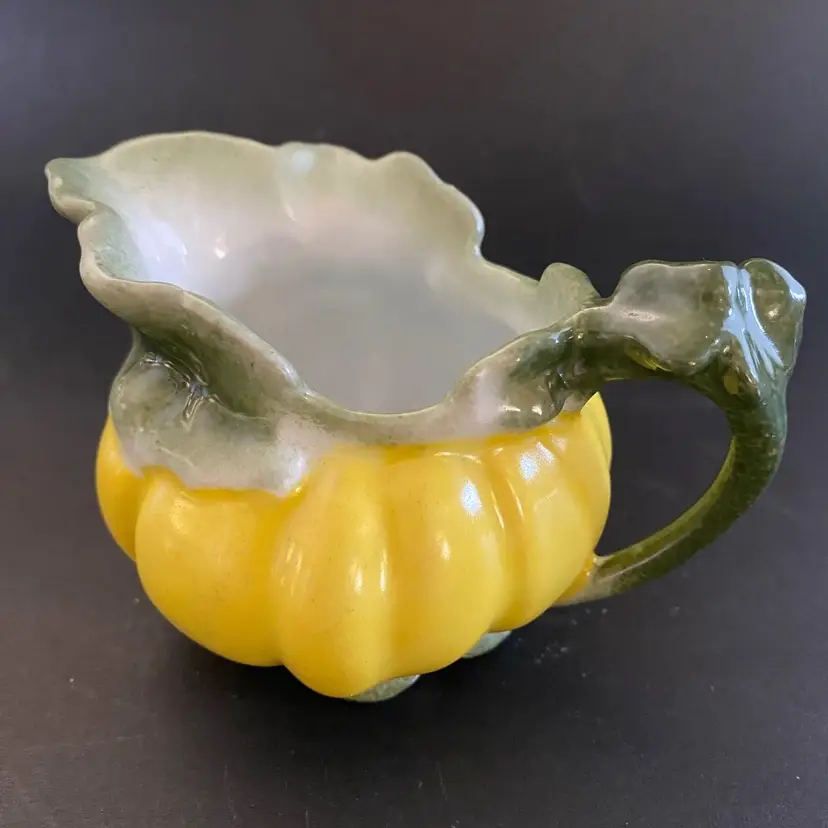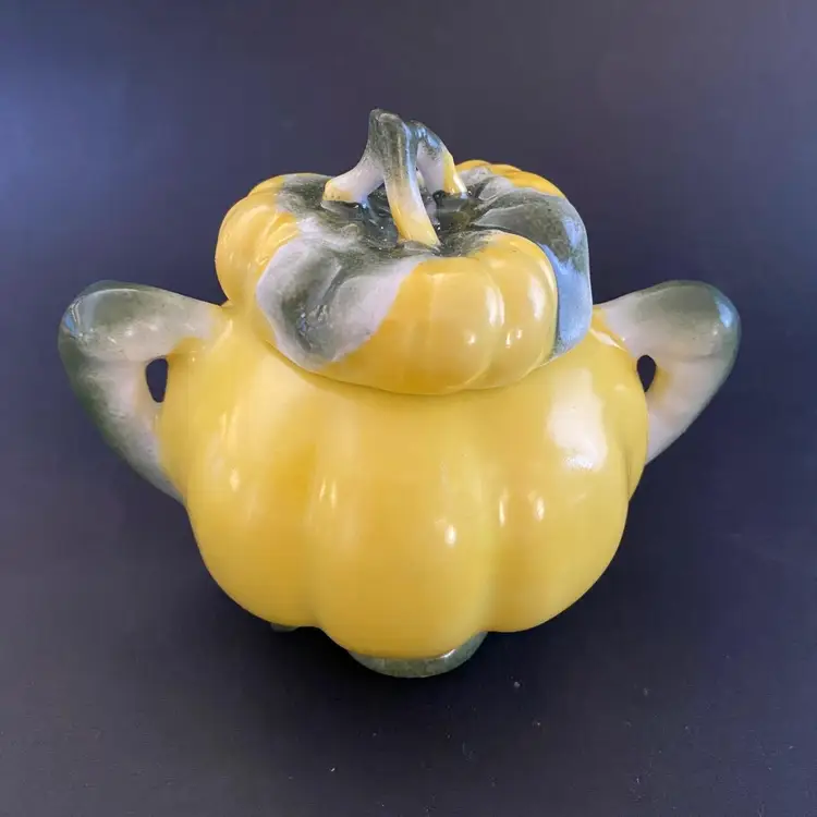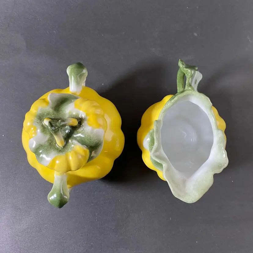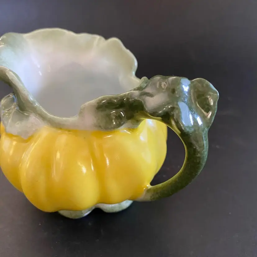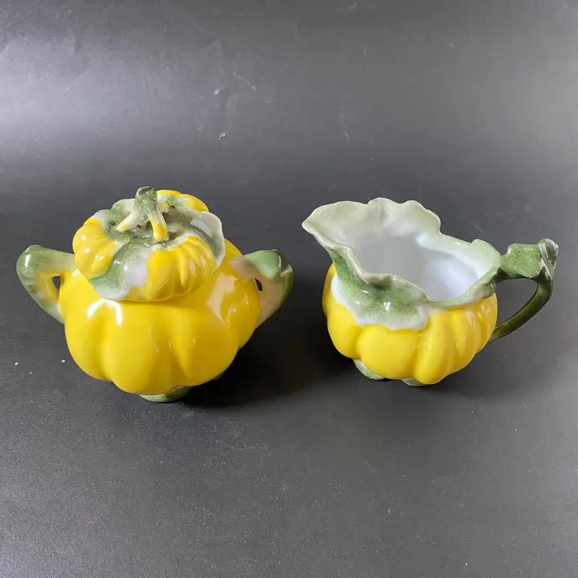 VTG Anthropologie Pumpkin Gourd Cream & Sugar Set. Handcrafted - hand painted. Measurements: Creamer is 3" tall x 4.5" wide w/handle. Sugar bowl is 4" tall w/Lid x 4.75" wide w/handles. This set has never been used. HARD TO FIND ITEM