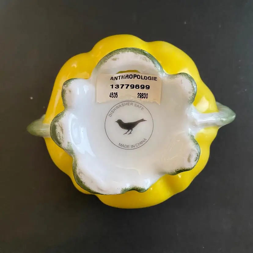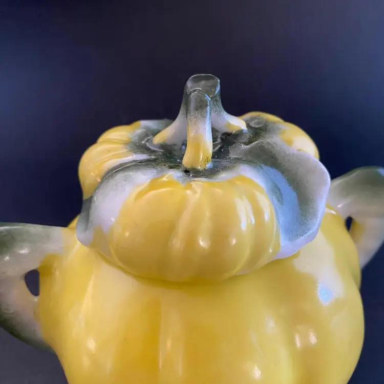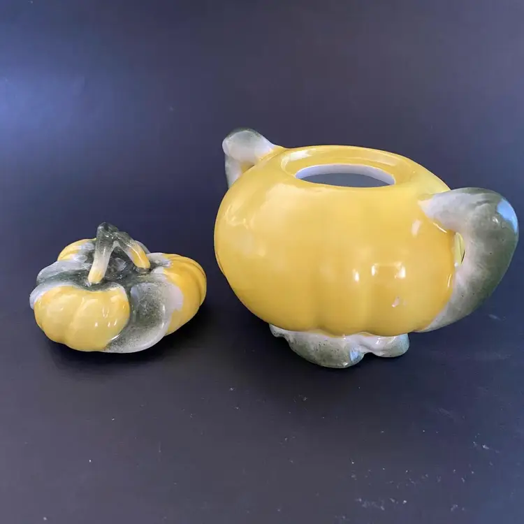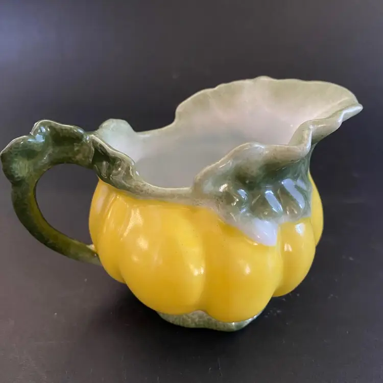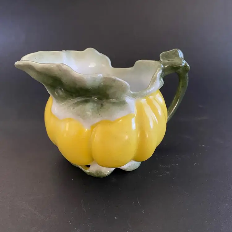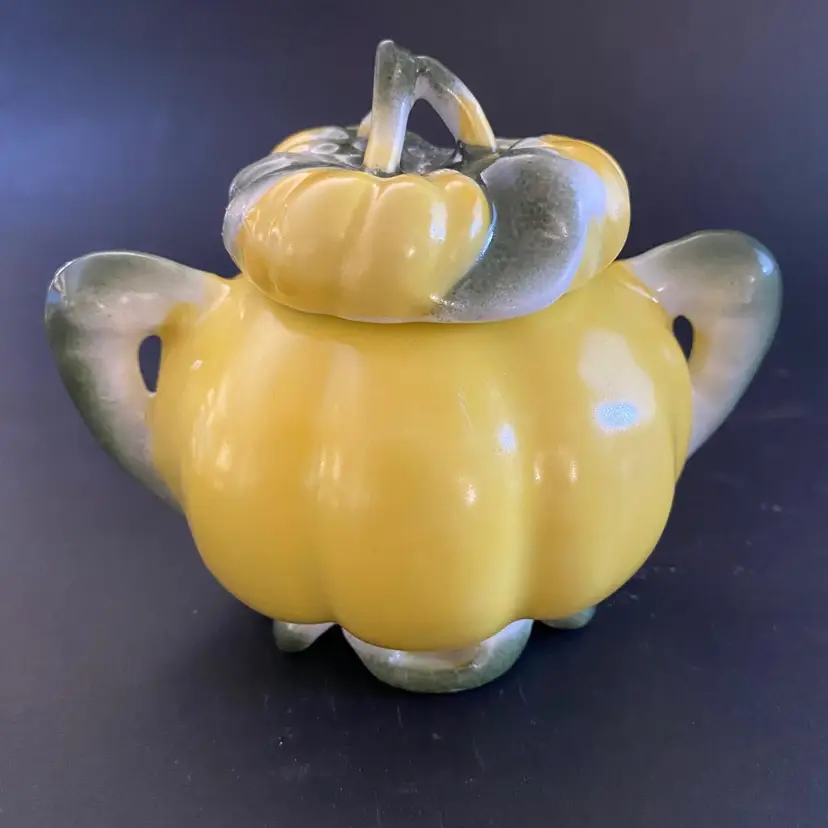VTG Anthropologie Pumpkin Gourd Cream & Sugar Set. Handcrafted - hand painted. Measurements: Creamer is 3" tall x 4.5" wide w/handle. Sugar bowl is 4" tall w/Lid x 4.75" wide w/handles. This set has never been used. HARD TO FIND ITEM