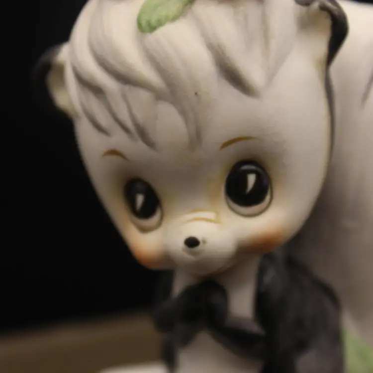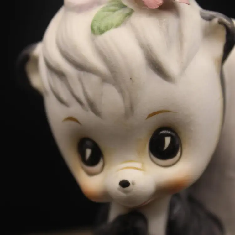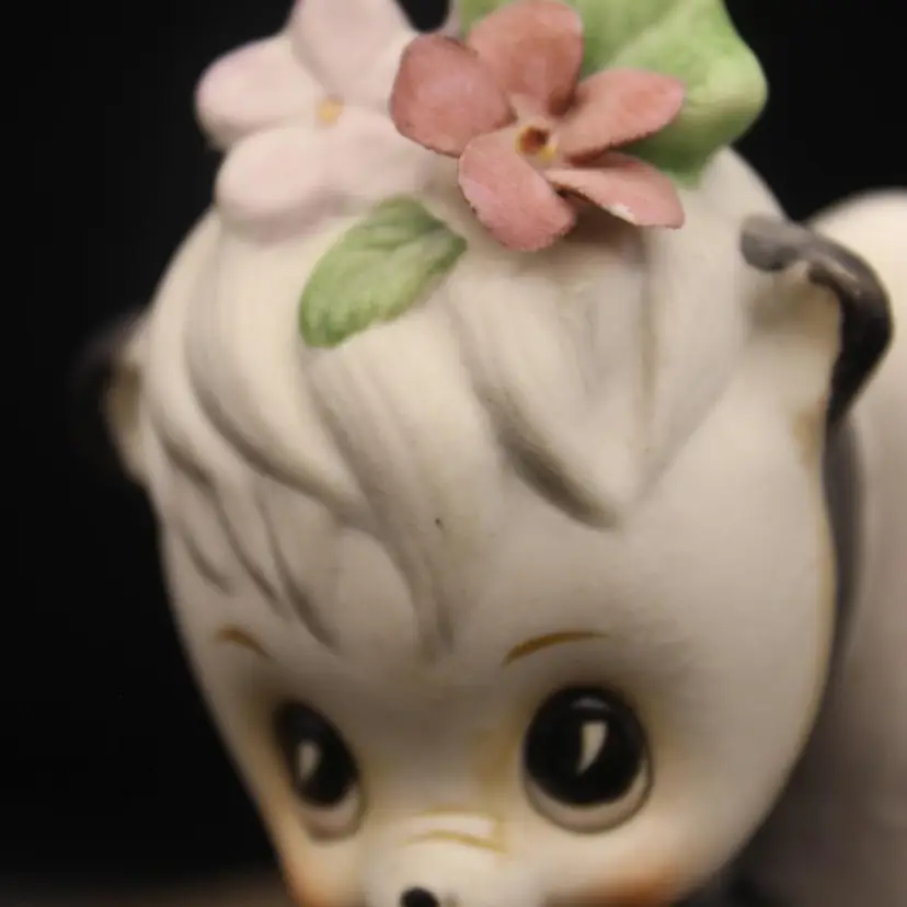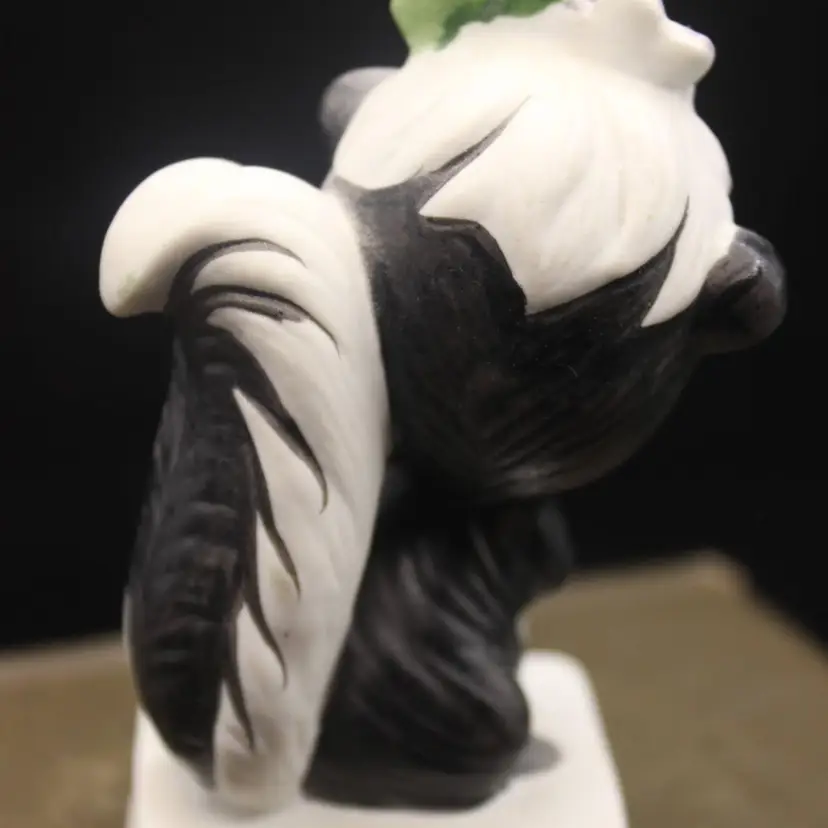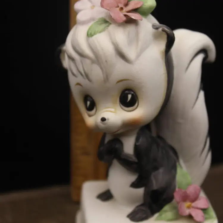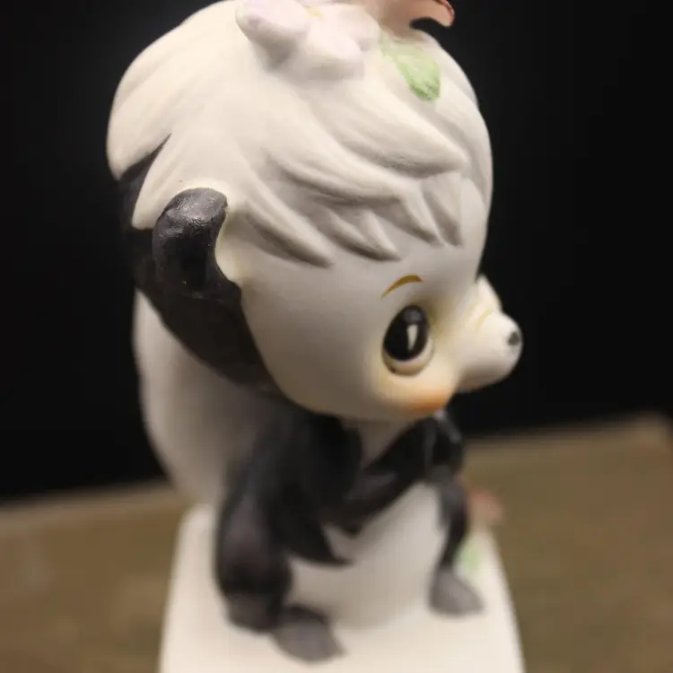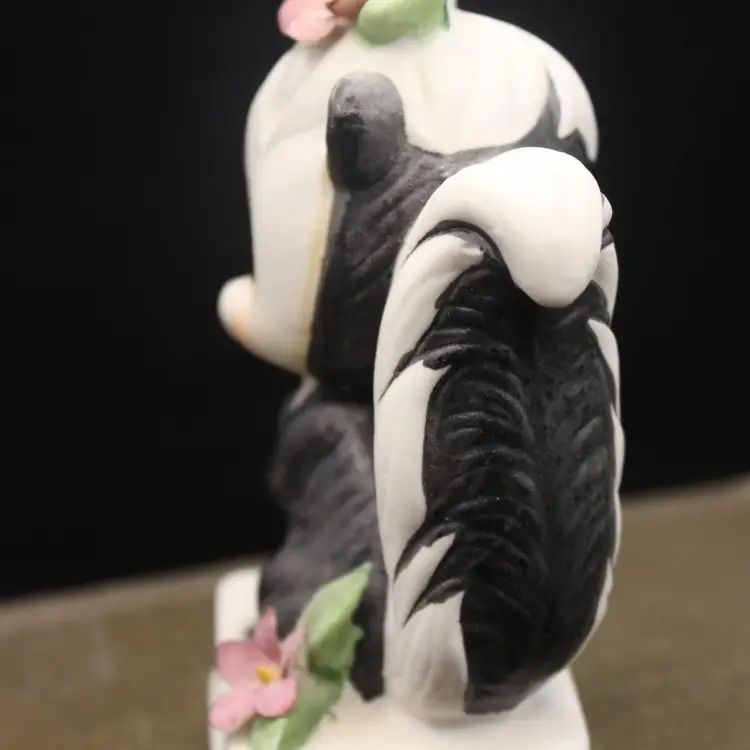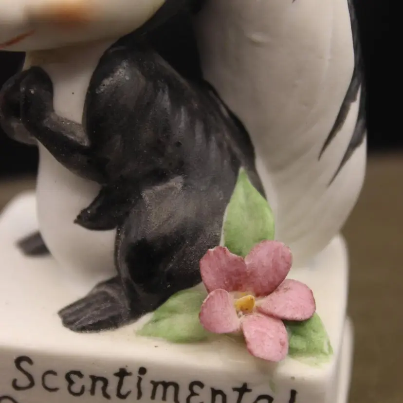Adorable Anthropomorphic Skunk Figurine Stands 4" tall. Made in Japan Excellent condition for age. Minor chip to one petal (have to really look to see)Perfect for your Valentine