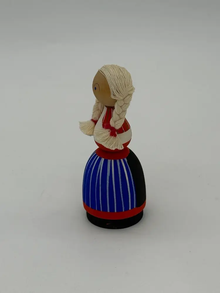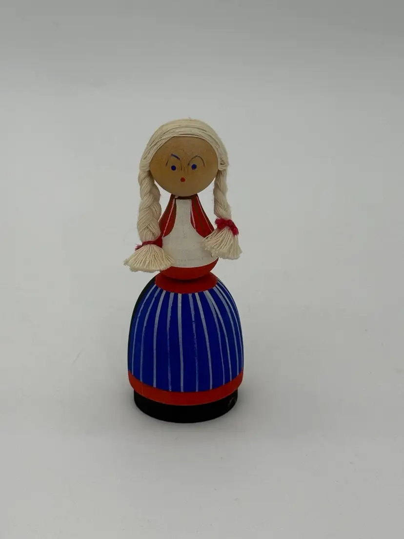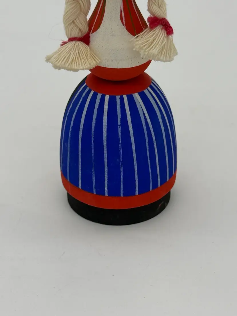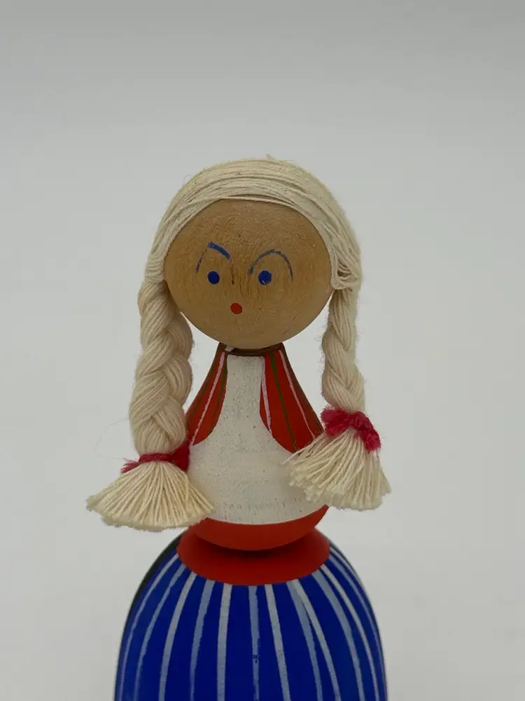 This vintage handmade Delsbo Swedish Folk Art wooden doll house doll is a small 4" figurine with cream-colored straight hair and blue hand-painted eyes. The doll is Rare and hard to find. She is made of wood and features a Swedish Folk Art theme, she is wearing a hand painted detailed red, white, and blue dress, perfect for all occasions. Handmade in Delbo, Sweden, this unique piece showcases traditional craftsmanship and details characteristic of Swedish Folk Art. With its lightweight design and freestanding feature, this girl doll is a charming addition to any doll collection or as a standalone decorative item.