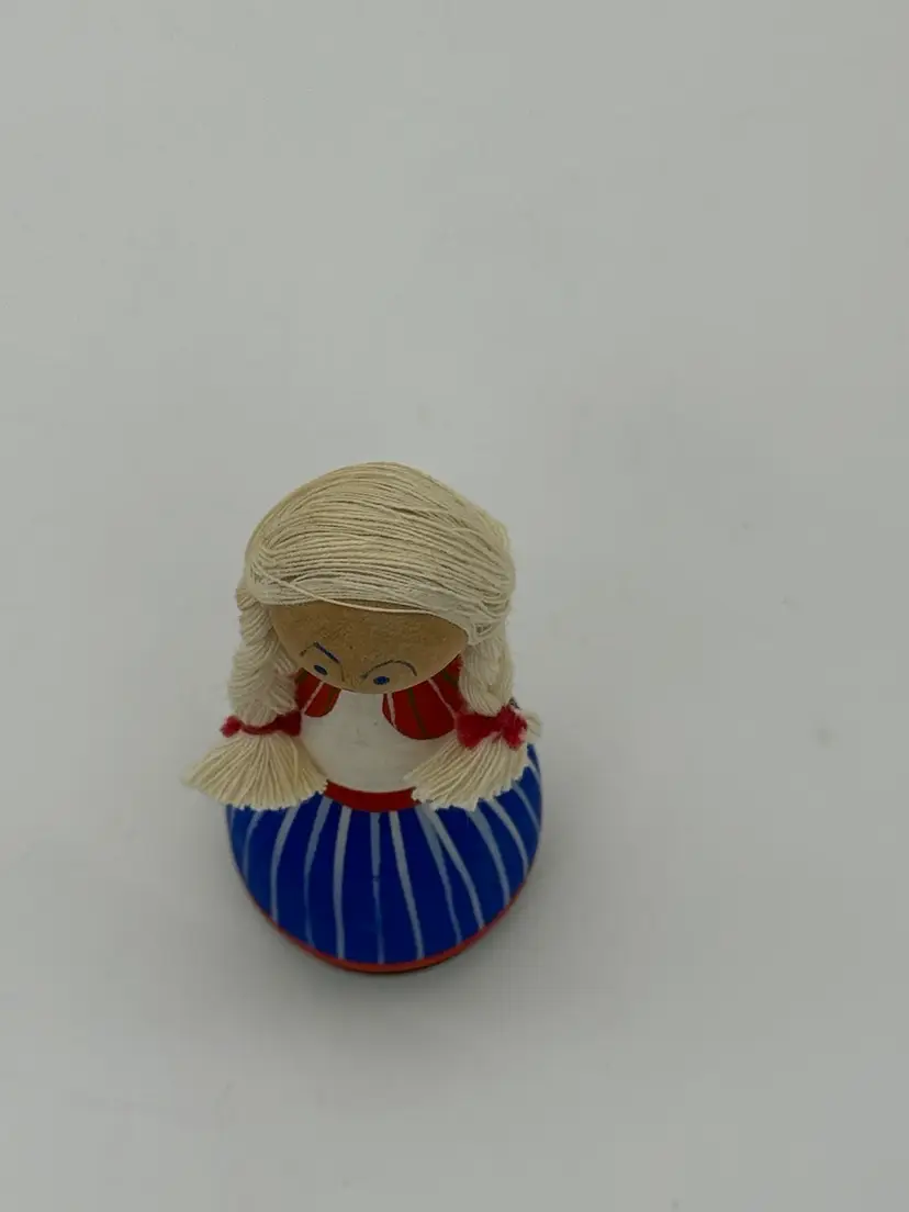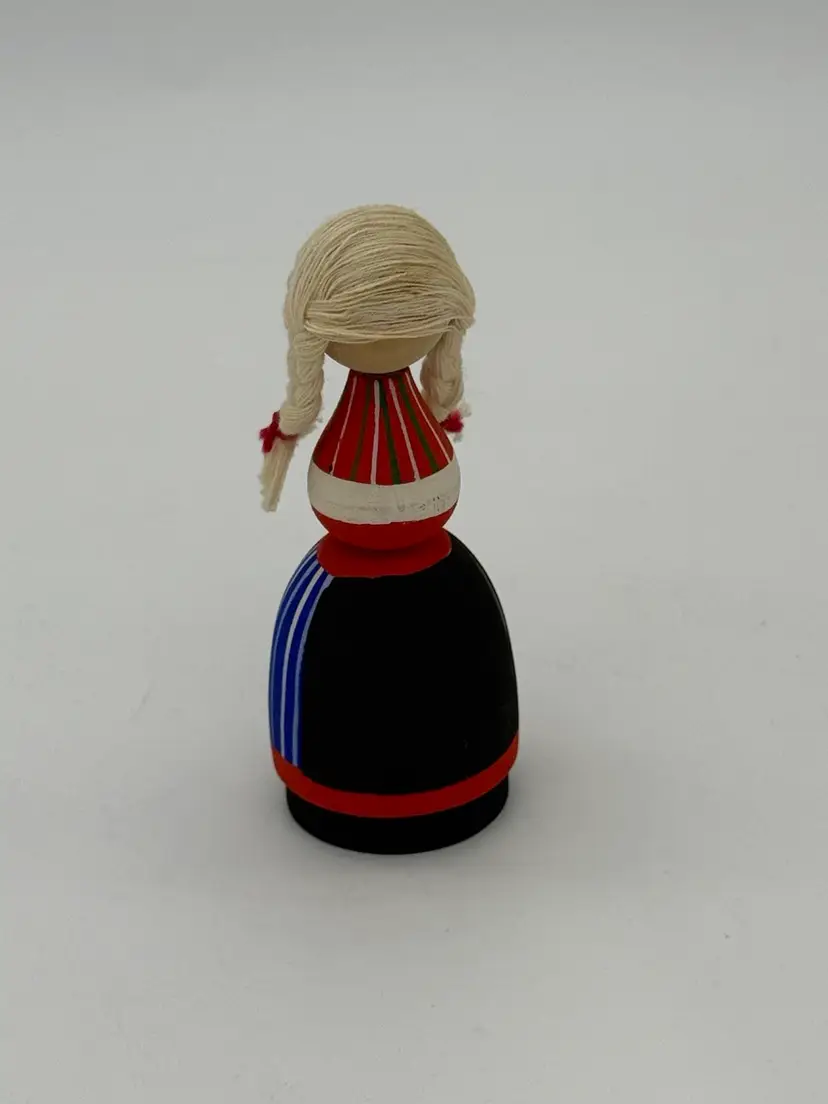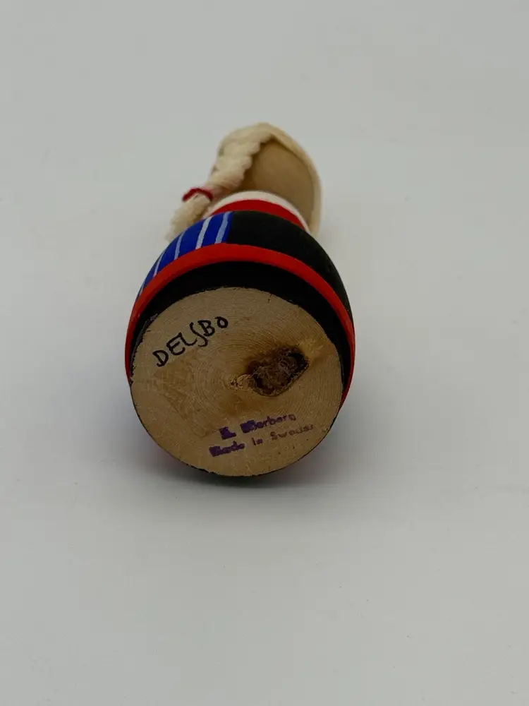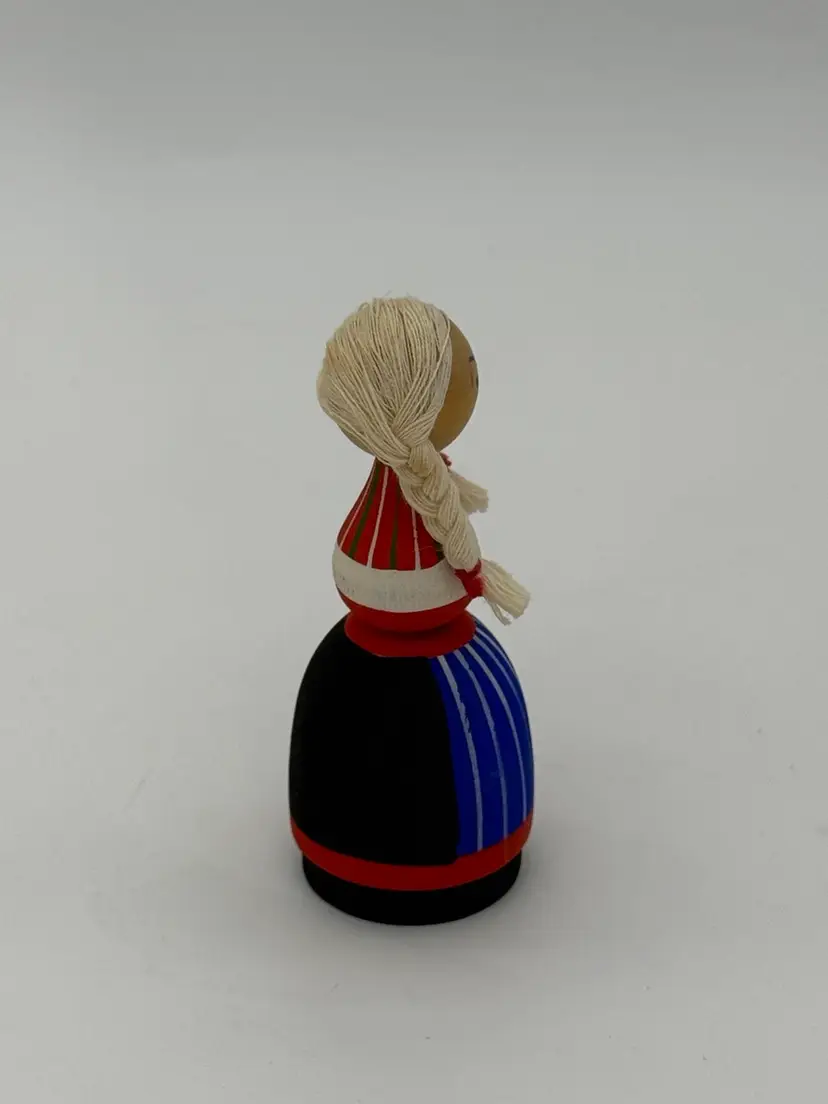 This vintage handmade Delsbo Swedish Folk Art wooden doll house doll is a small 4" figurine with cream-colored straight hair and blue hand-painted eyes. The doll is Rare and hard to find. She is made of wood and features a Swedish Folk Art theme, she is wearing a hand painted detailed red, white, and blue dress, perfect for all occasions. Handmade in Delbo, Sweden, this unique piece showcases traditional craftsmanship and details characteristic of Swedish Folk Art. With its lightweight design and freestanding feature, this girl doll is a charming addition to any doll collection or as a standalone decorative item.