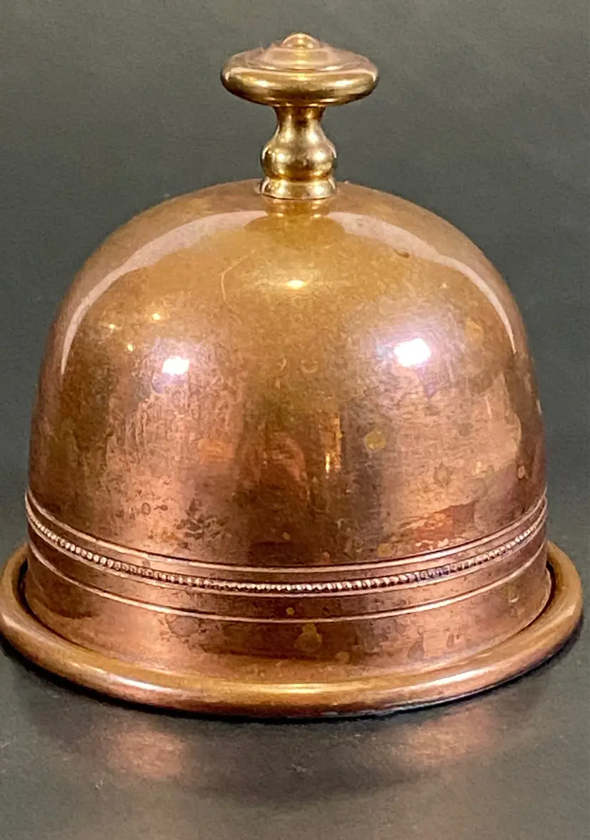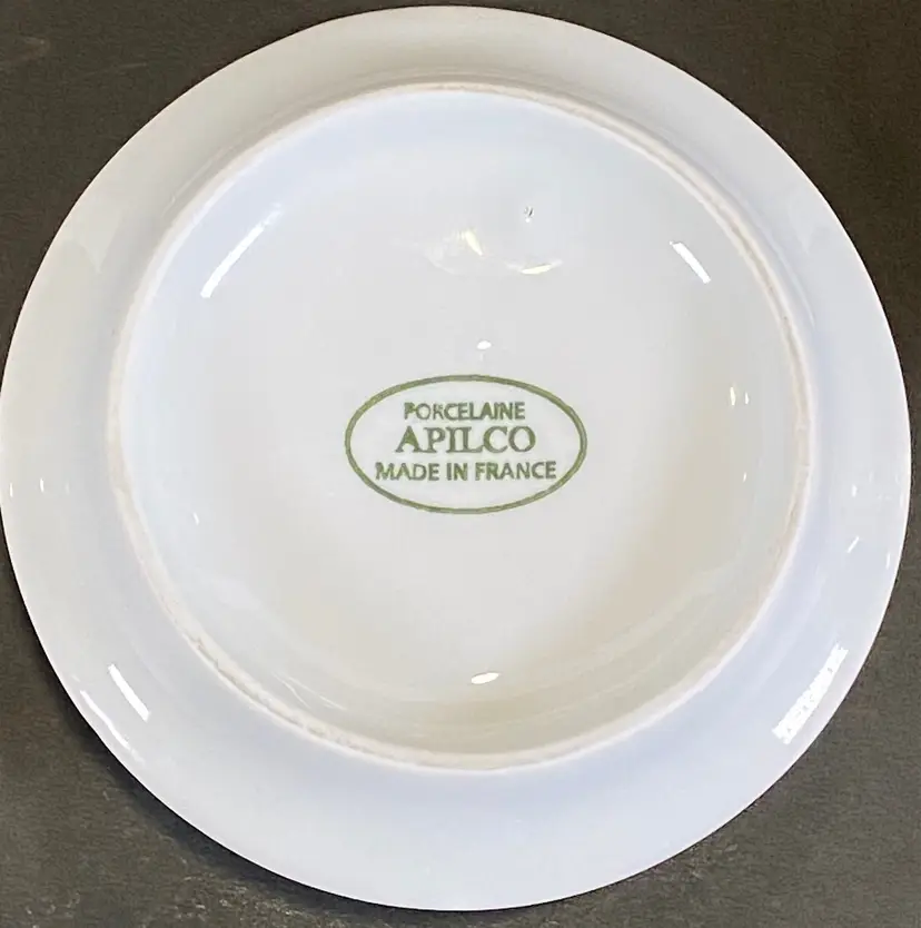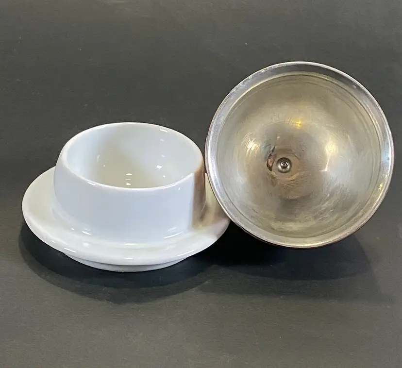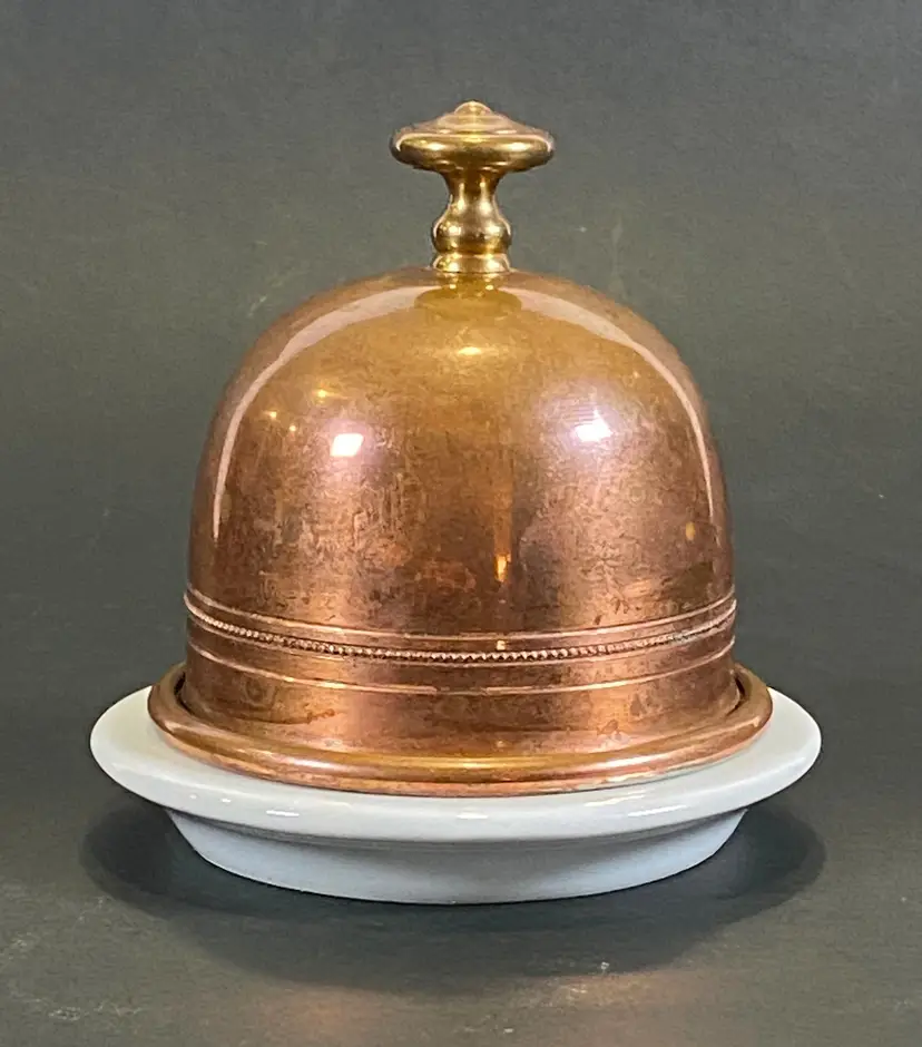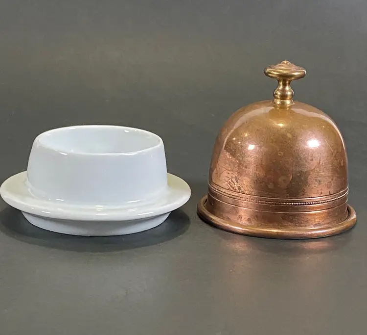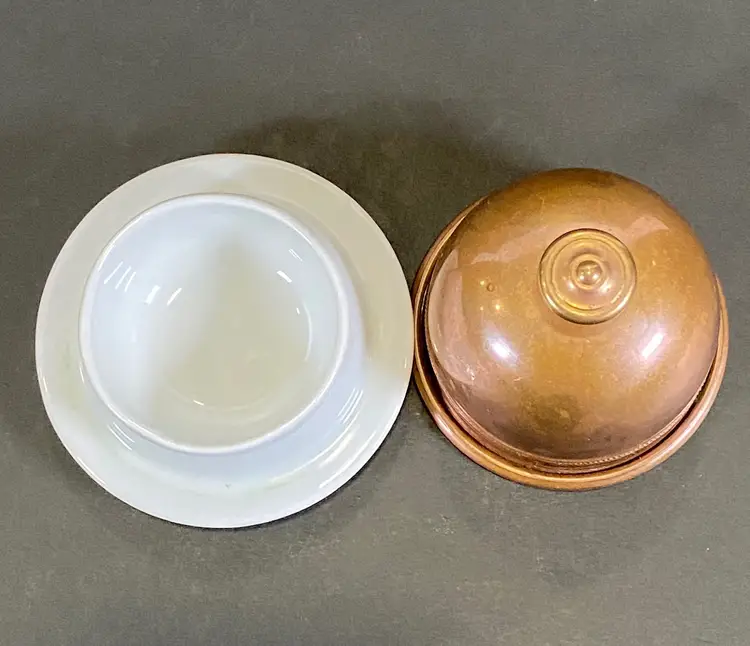 This is a vintage brass plated stainless steel dome covered porcelain butter dish made in France by Apilco. A chic way to serve butter at the dinner table. The white porcelain base has a diameter of 3 1/2" with a total height of about 3 1/2" with the dome. This item is in excellent pre-owned condition, with no flaws.