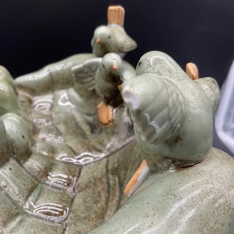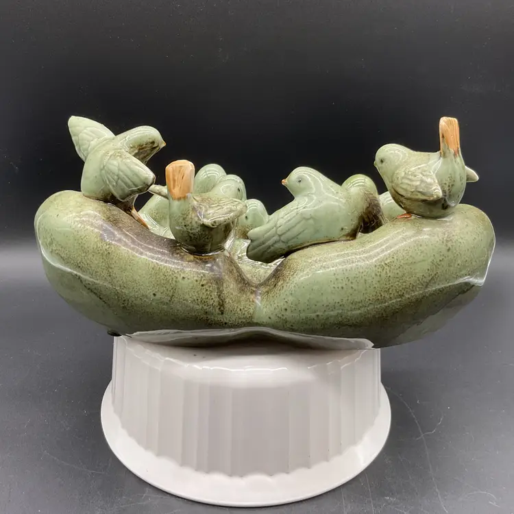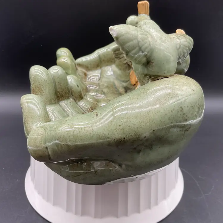 This ceramic Bird Feeder or Trinket Dish sculpture is a beautifully crafted piece featuring birds perched on a pair of hands. It serves as a unique decorative accent for gardens or interiors, showcasing intricate detailing and a lovely glaze. Its artistic design also makes it a thoughtful gift for bird lovers.