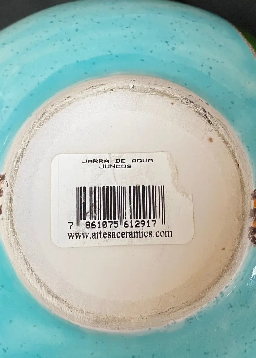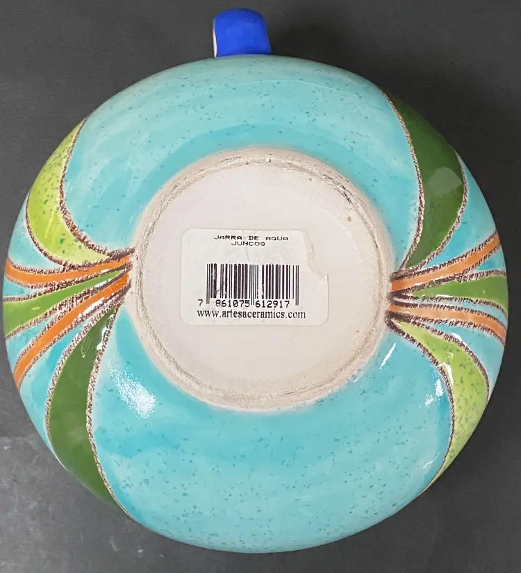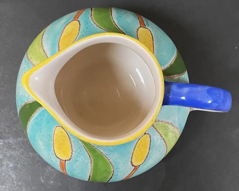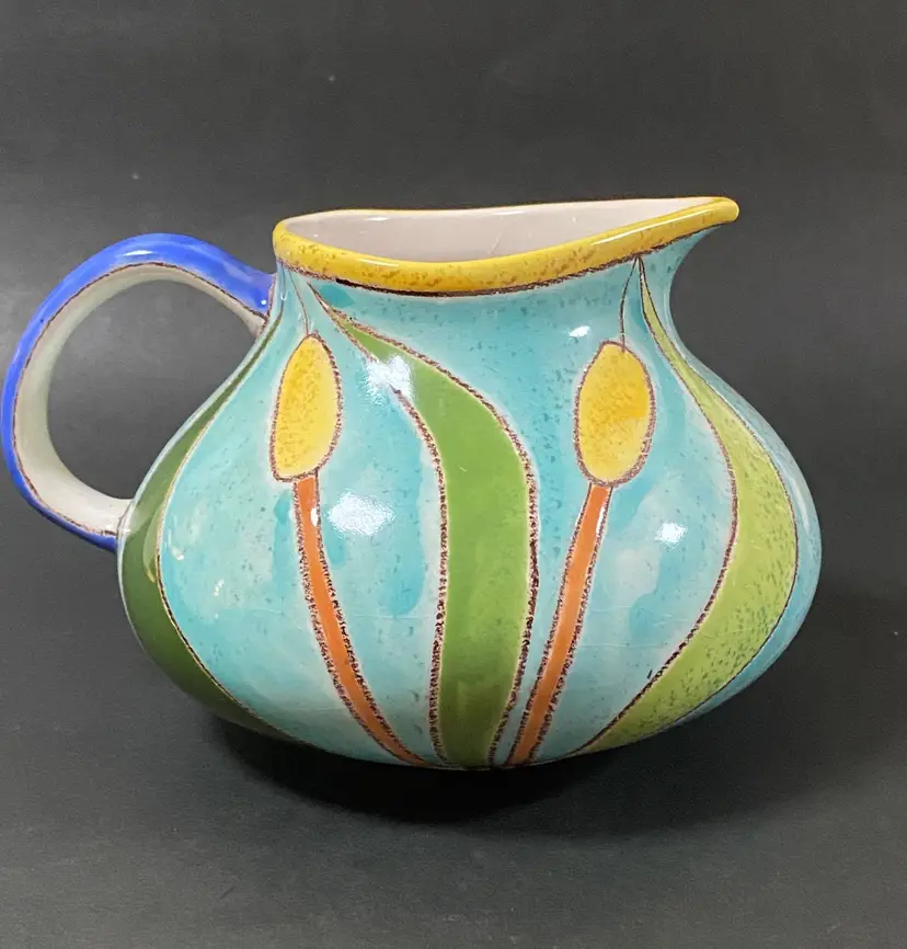 Vintage art pottery hand painted in blue, green, yellow and orange and white, textured cattail majolica style in Ecuador by Artesa. This item can be used as a creamer, vase, or planter and is in excellent condition - like new. Approx. length from handle is 6.25", height is 4" tall.