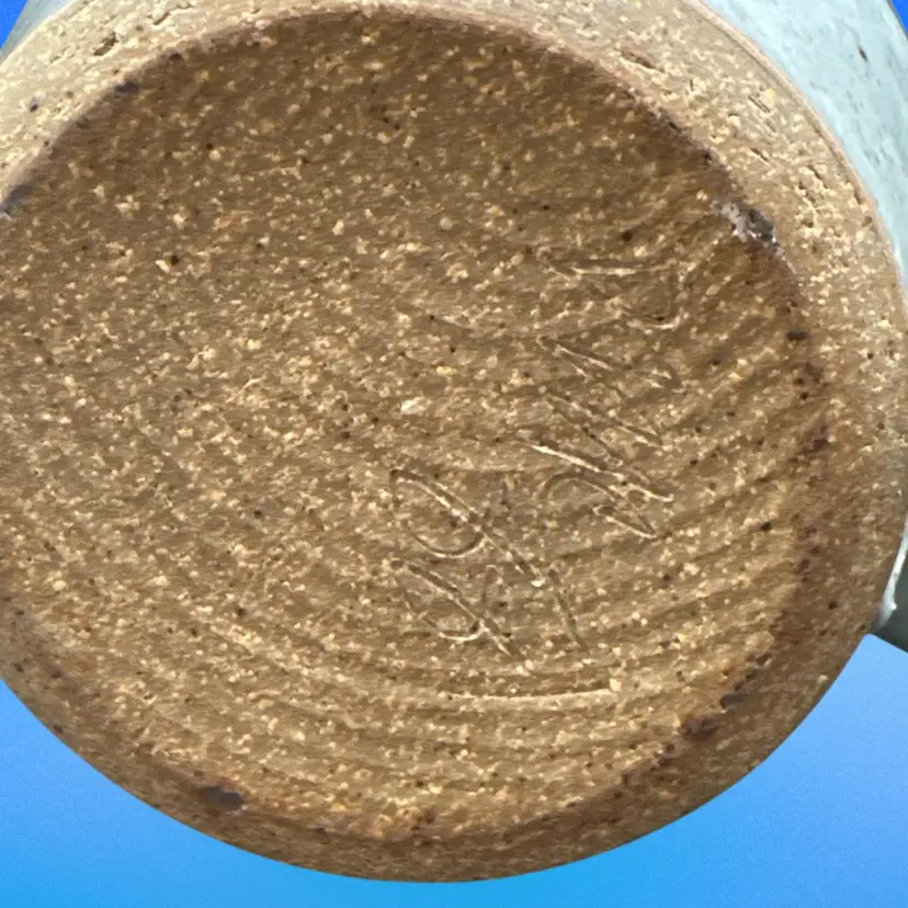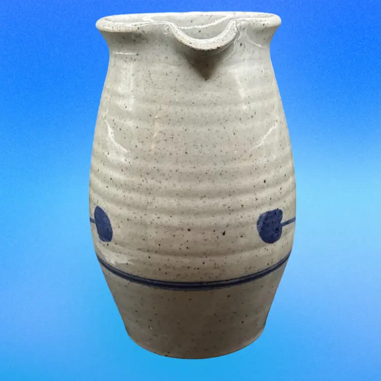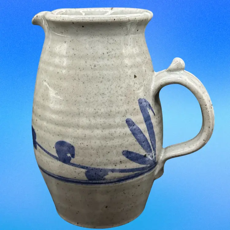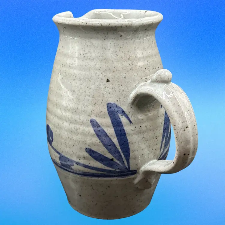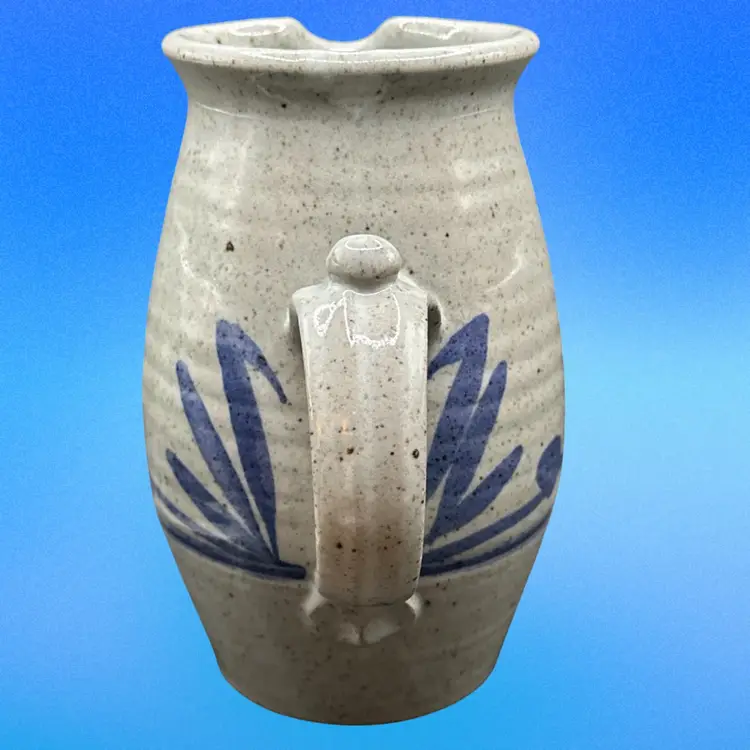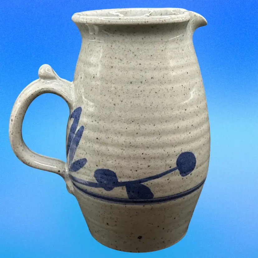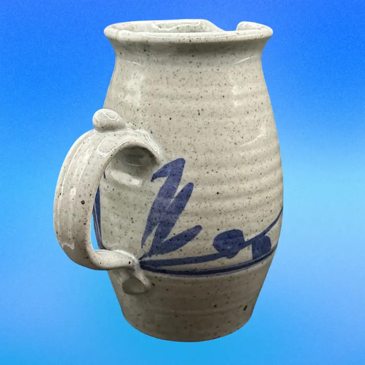 This vintage pitcher is a round, bordered clay piece from 1988, featuring a multicolor art design. It is signed 'DMC (?)' and has a farmhouse cottage theme, making it a unique centerpiece for all occasions. Handmade with a handle for easy filling, this 8-inch tall pitcher weighs 2.25 lbs, perfect for serving beverages in a rustic or artistic setting.