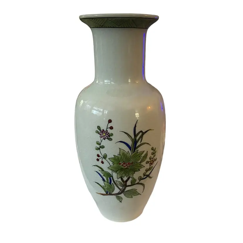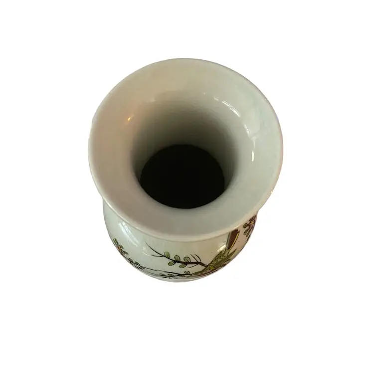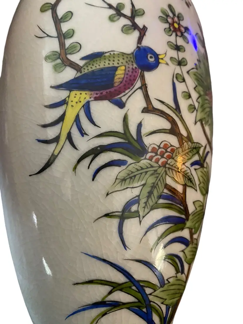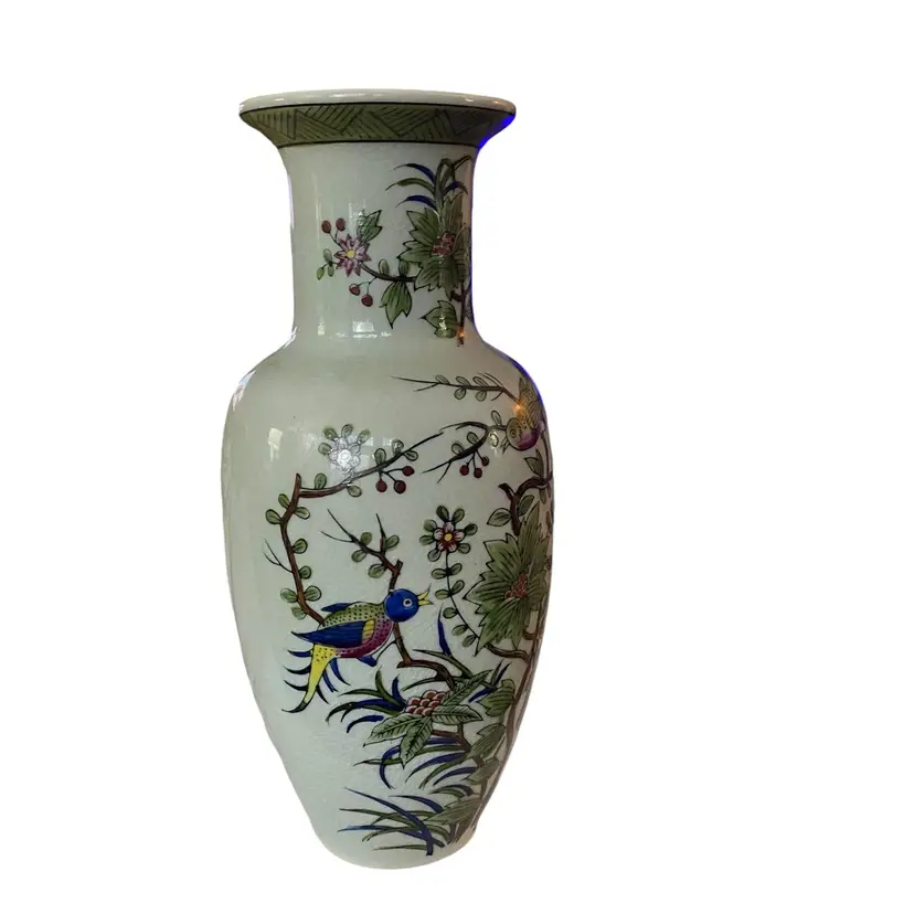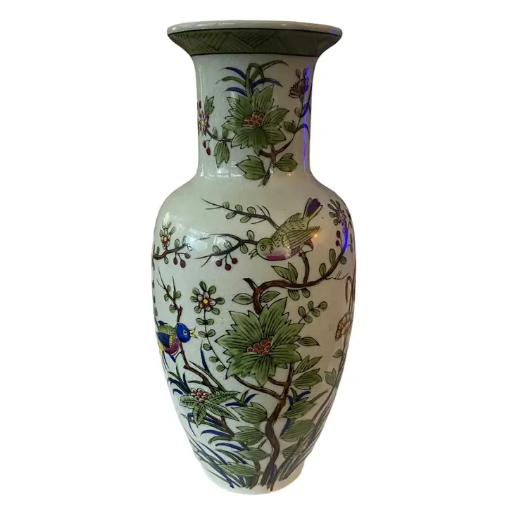 Vtg Asian Chinese JAPAN Baluster Porcelain Vase Birds Botanicals Flowers 10in tall